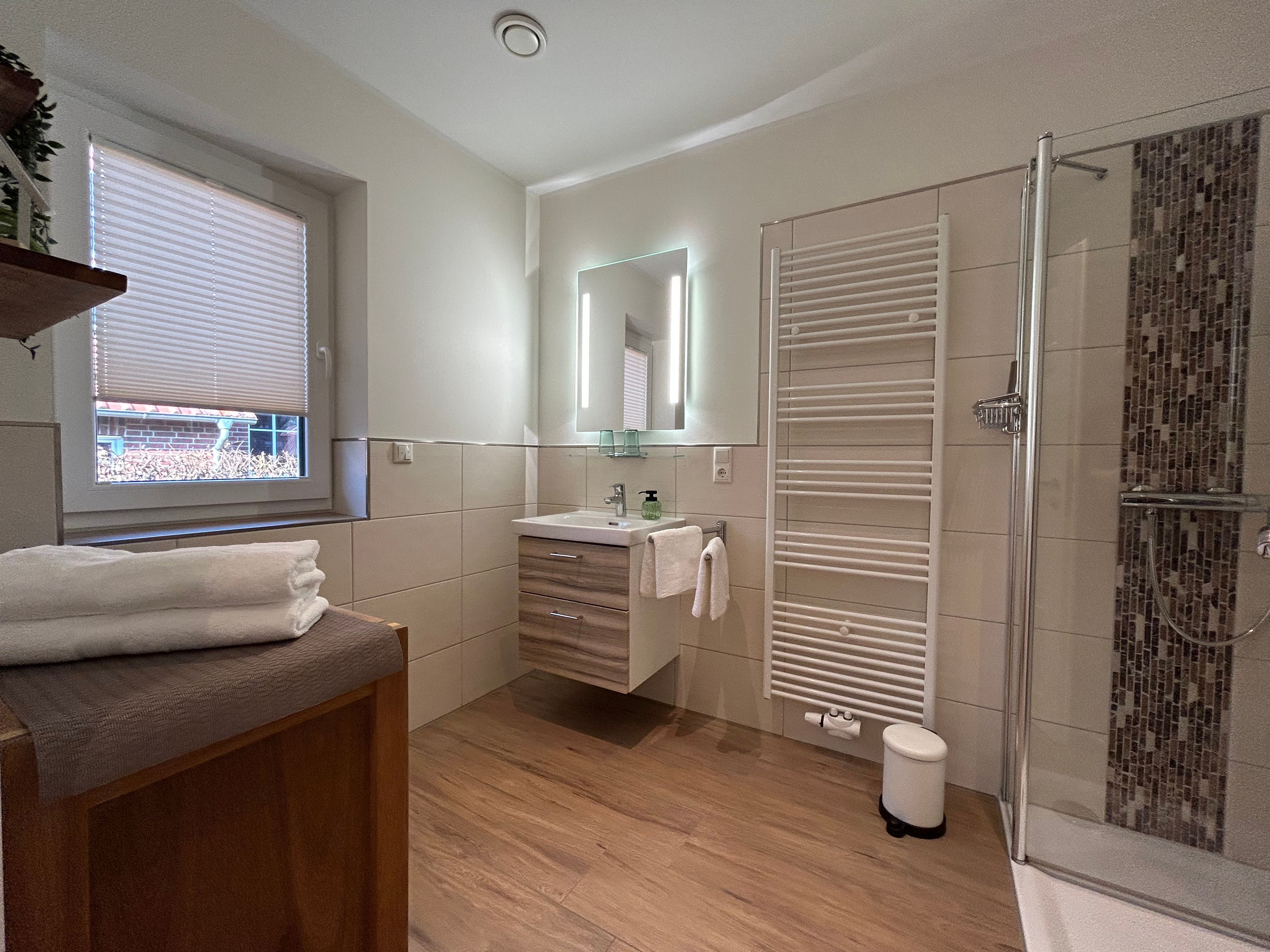 Das Bad bietet eine bodengleiche Dusche, WC und einem Fenster für ausreichend Tageslicht.