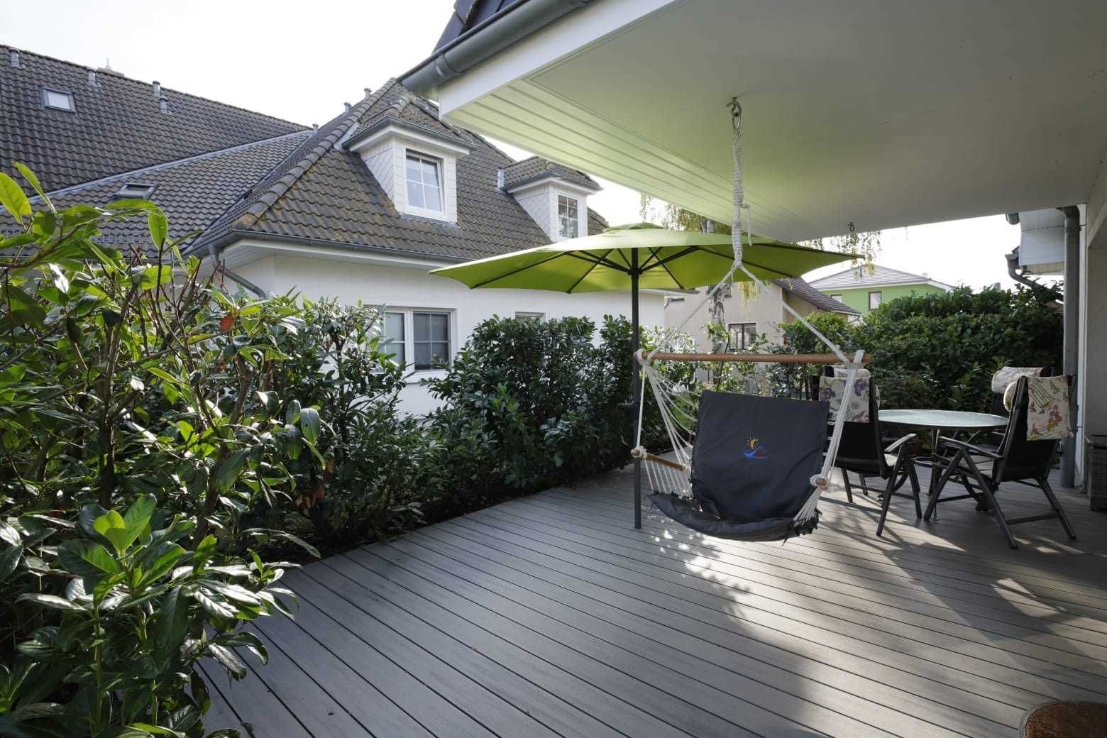 • eine Terrasse mit Gartenmöbeln, Sonnenschirm, Hängesessel