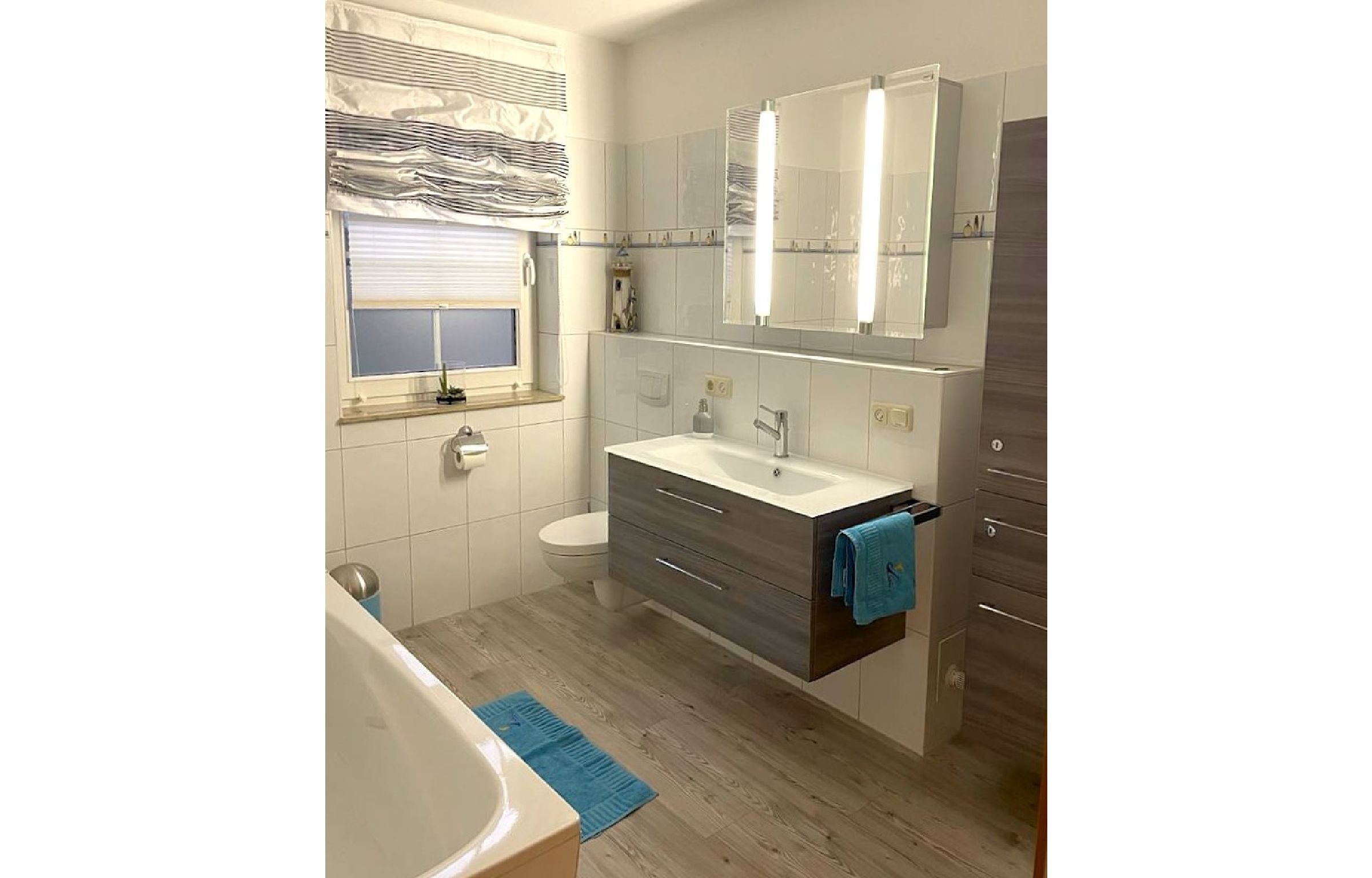 • ein Bad mit WC, Badewanne und Duschmöglichkeit, Föhn, (auf Wunsch mit Babybadewanne)