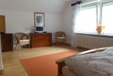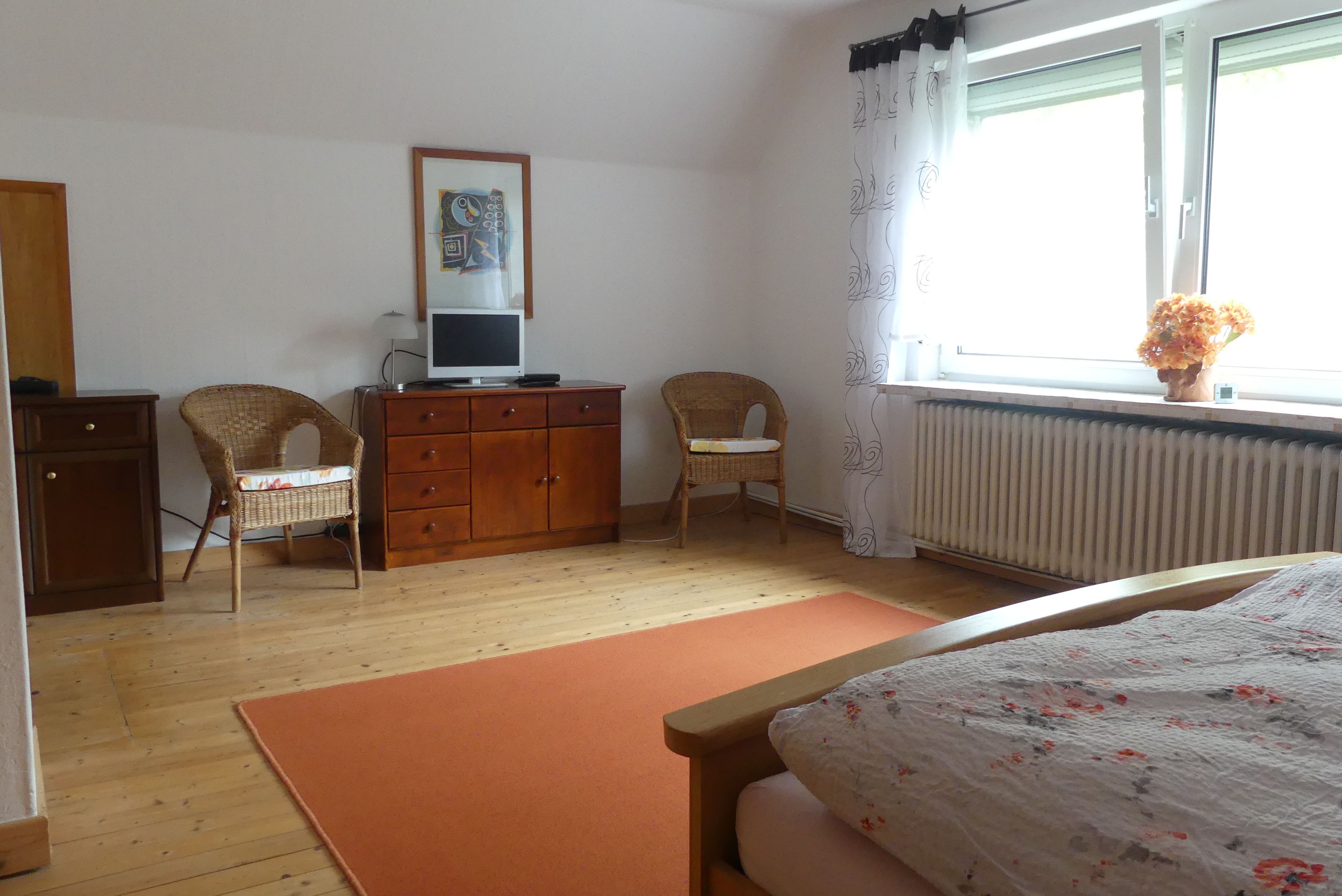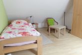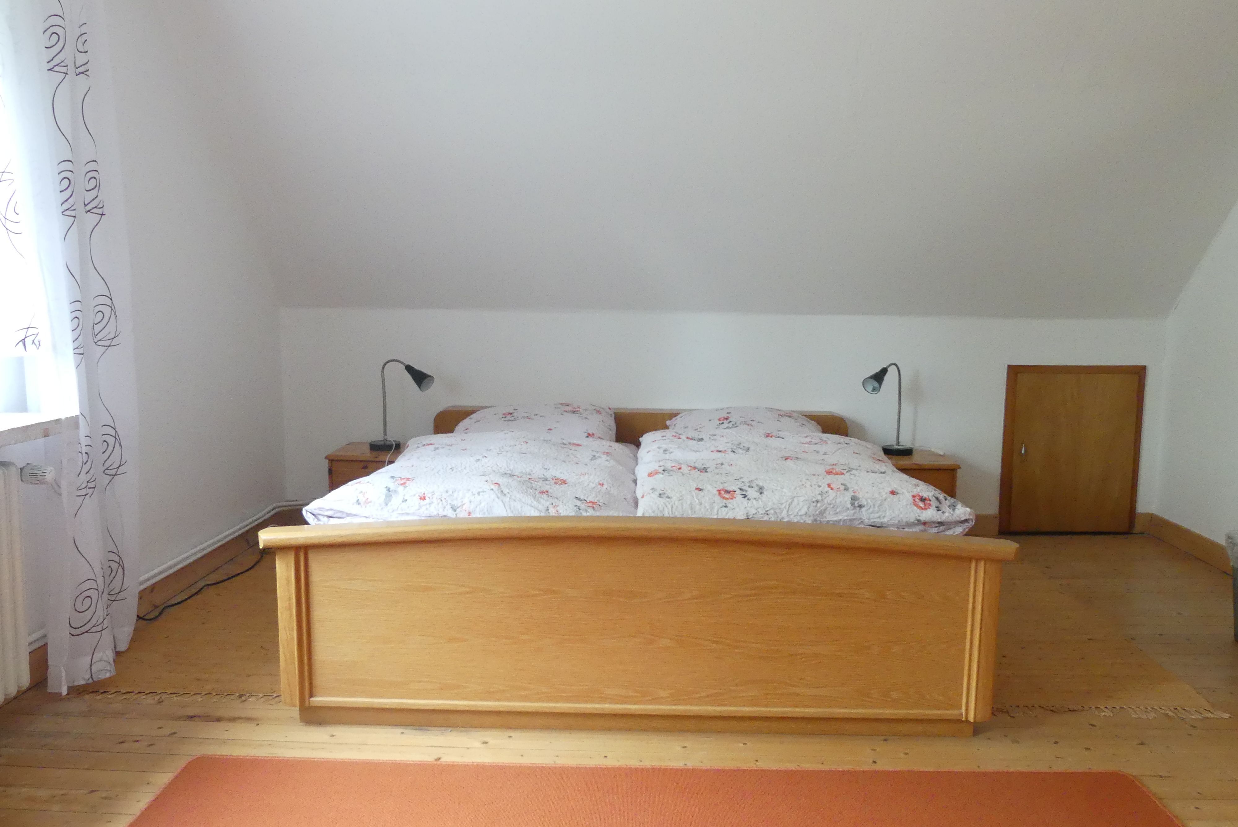 Im Obergeschoss befinden sich die zwei Schlafzimmer. Das Größere ist mit einem Doppelbett, Hochschrank, zwei Korbstühlen und einem kleinen TV-Gerät ausgestattet. Das kleinere Schlafzimmer verfügt über zwei Einzelbetten, einen Kleiderschrank und Sitzgelegenheit.