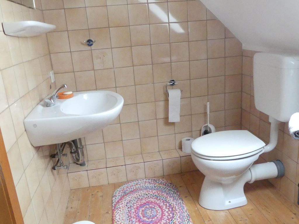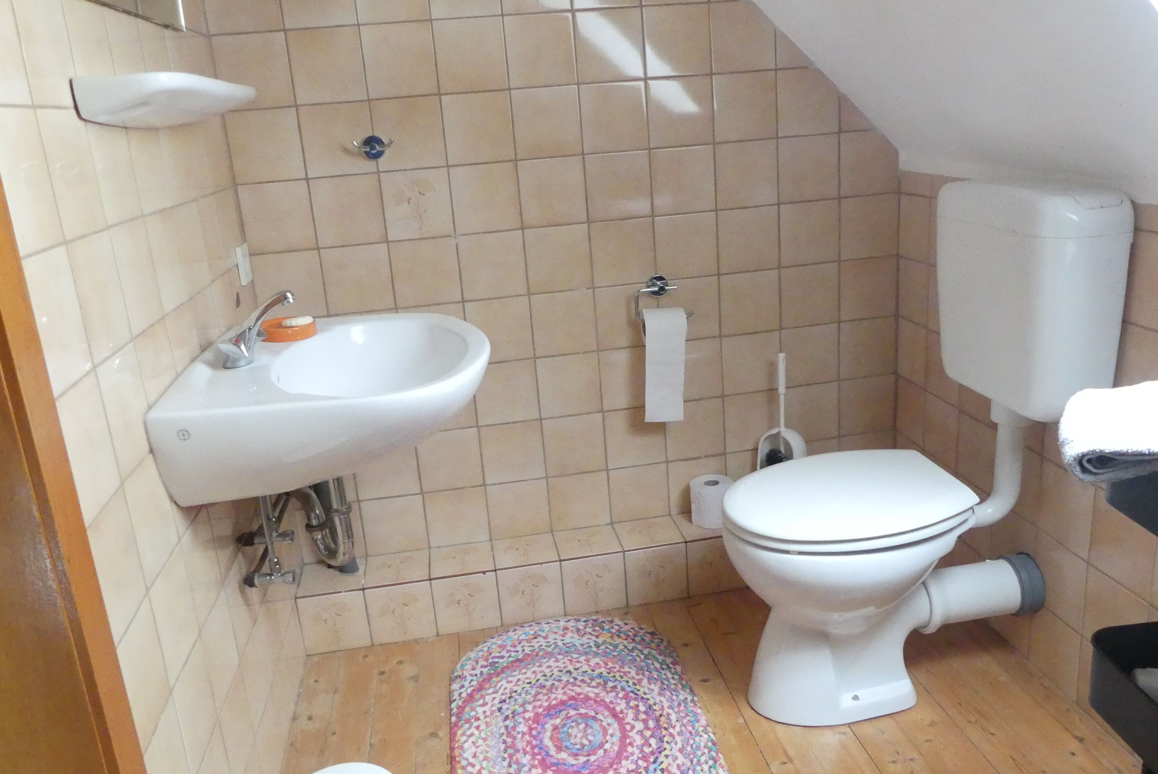 Im Obergeschoss ist noch ein weiteres WC, Waschgelegenheit und Föhn.