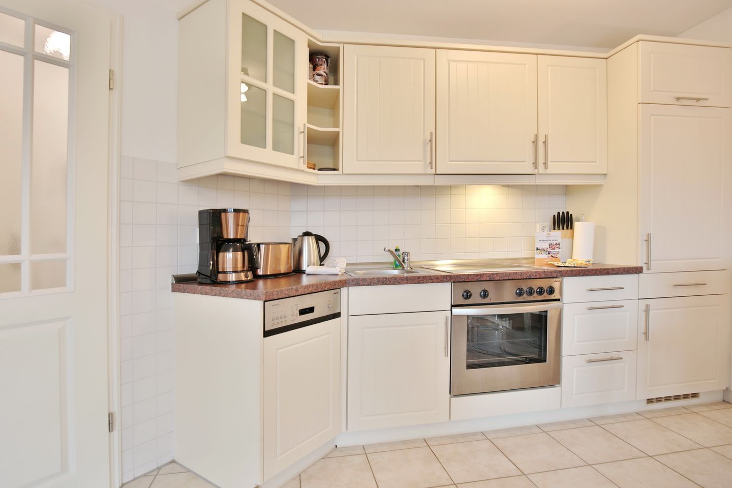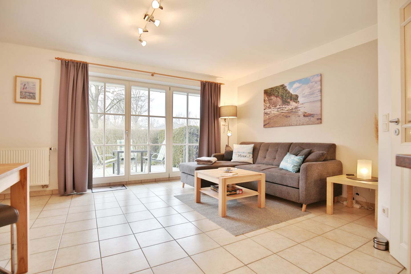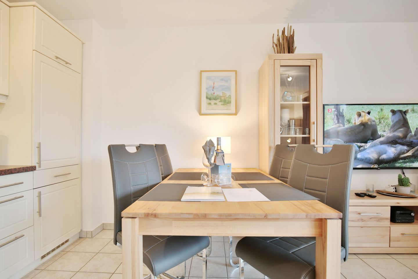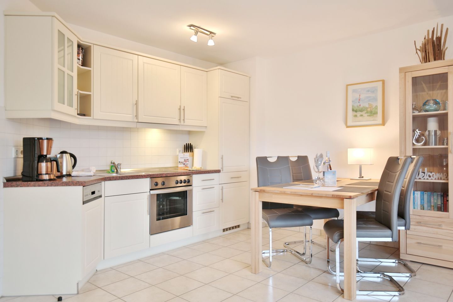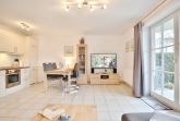 Dieses 2 Zimmer Appartement im Erdgeschoß liegt strandnah und ist nur ca. 150 m von der Ostsee entfernt. Hier finden bis zu 3 Personen (2 Erwachsene und 1 Kind) das perfekte Feriendomizil, um den Ostseeurlaub unvergesslich zu machen. Das Wohn-/Esszimmer mit Ecksofa, das zum 3. Schlafplatz aufgebaut werden kann (Liegefläche 1,20 x 2,00 m) lädt zum Verweilen ein. Ein großer Smart TV , Radio und Stereoanlage sorgen für Unterhaltung. Hier steht auch der Esstisch mit 4 Stühlen und bietet kurze Wege zu der integrierten Küche, welche alle Annehmlichkeiten bietet, die man braucht. Ein Ceranfeld mit 4 Kochmöglichkeiten sowie ein Backofen sorgen dafür, dass die Küche nicht kalt bleiben muss. Ein Kühlschrank mit kleinem Gefrierfach und eine Spülmaschine sind hier ebenfalls zu finden.