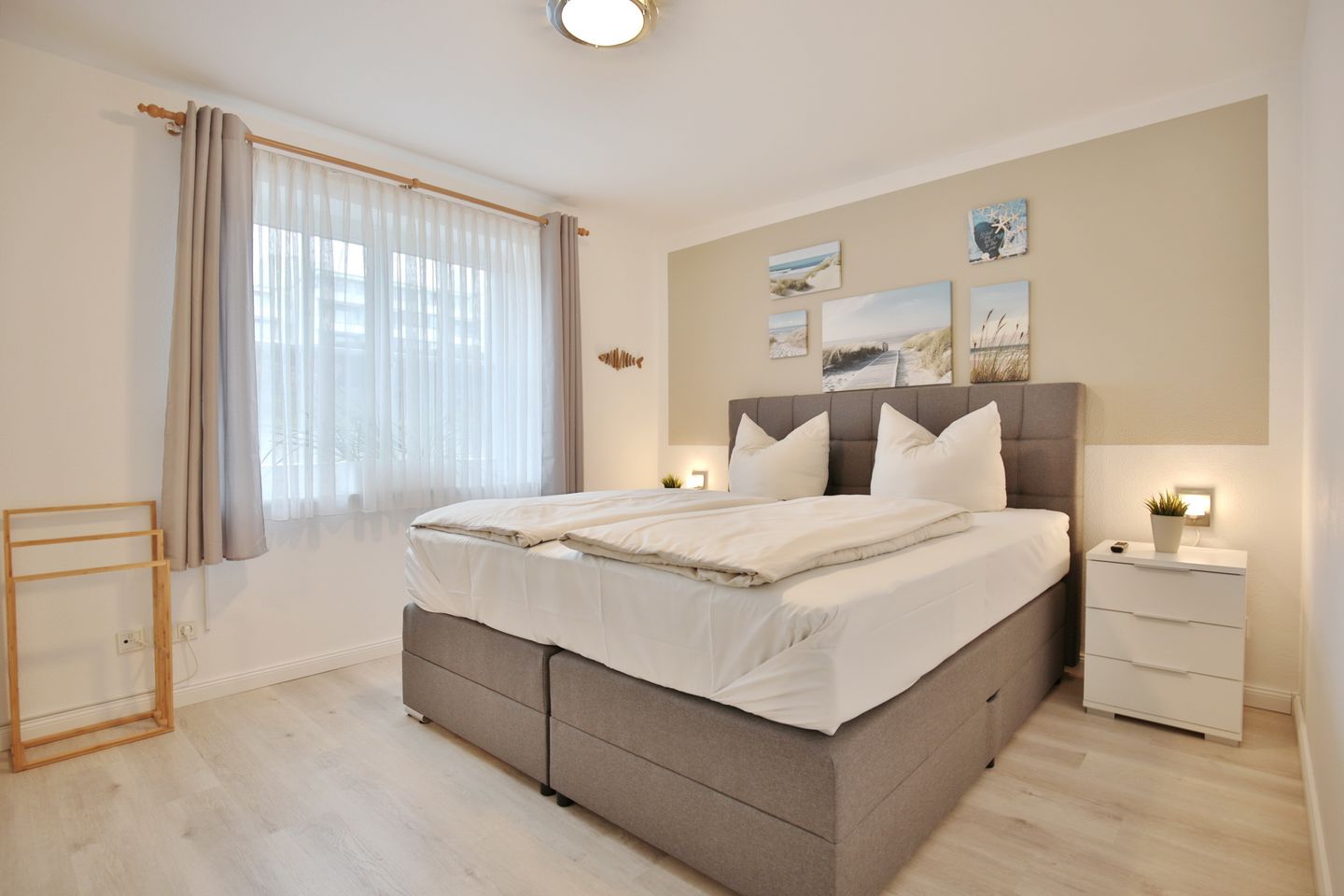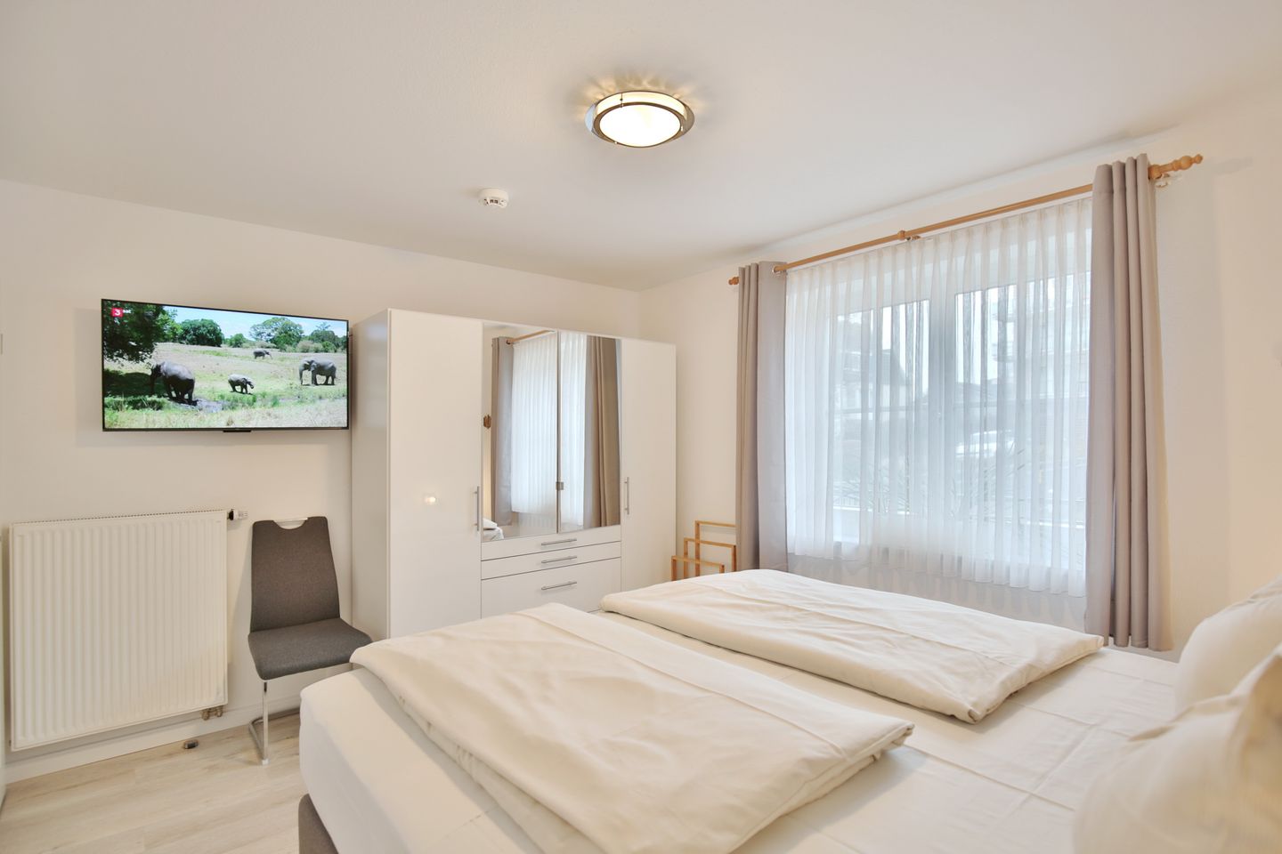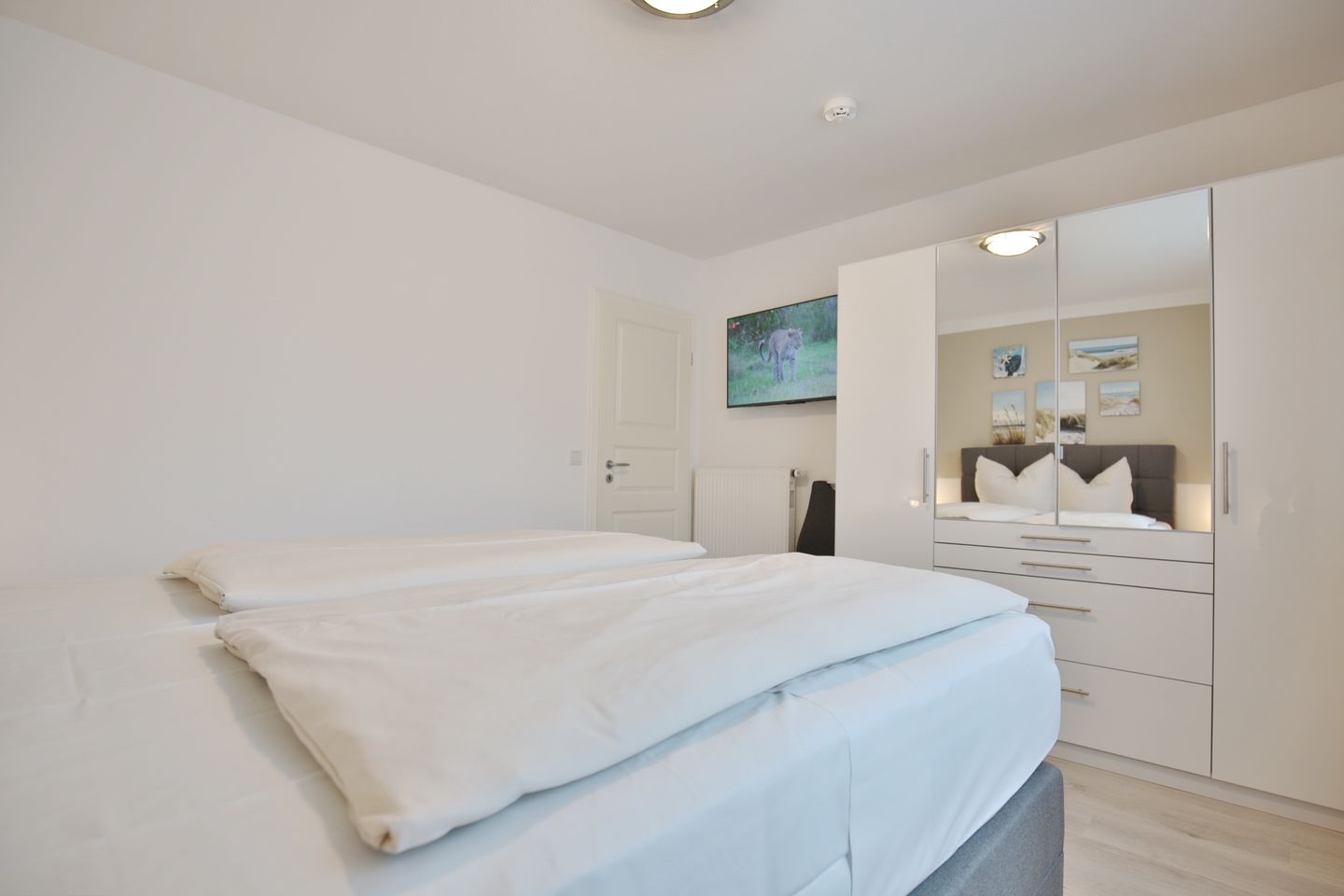 Das Schlafzimmer ist mit einem Boxspringbett (Liegefläche 1,80 x 2,00m mit durchgehender Matratze), einem geräumigen Kleiderschrank und einem 2 TV ausgestattet. Außenjalousien sorgen hier für eine ruhige Nacht.