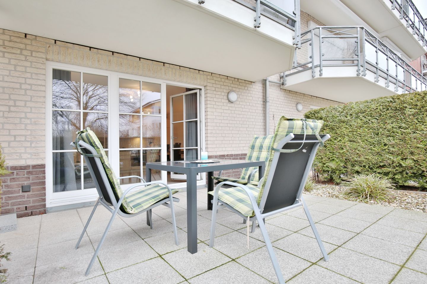 Von diesem Raum geht es auch auf die möblierte Westterrasse. Eine Hecke bietet hier Sichtschutz und ein Sonnenschirm schützt vor zu starker Sonneneinstrahlung.
