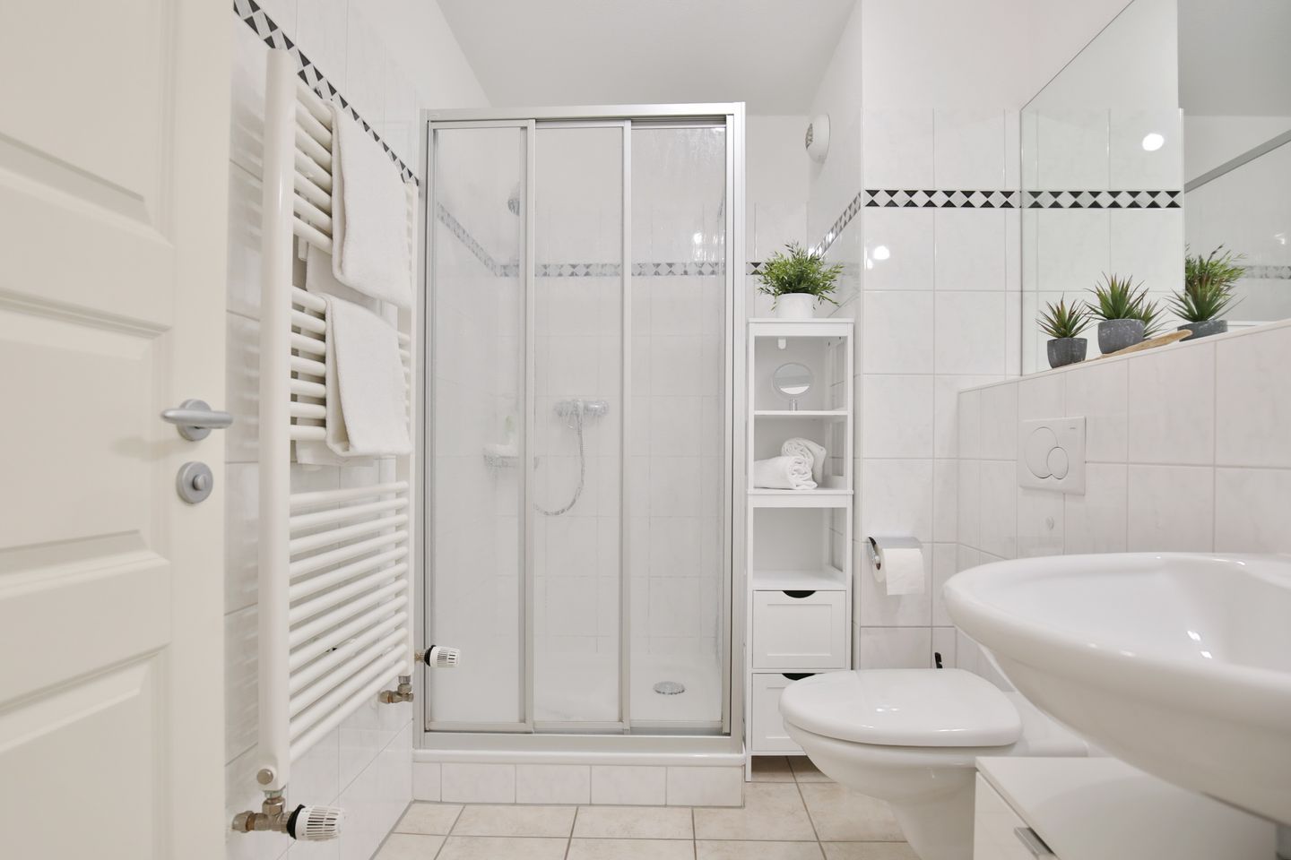 Das Badezimmer verfügt über eine Dusche und ein WC. Eine Fußbodenheizung sorgt für eine wohlige Wärme.