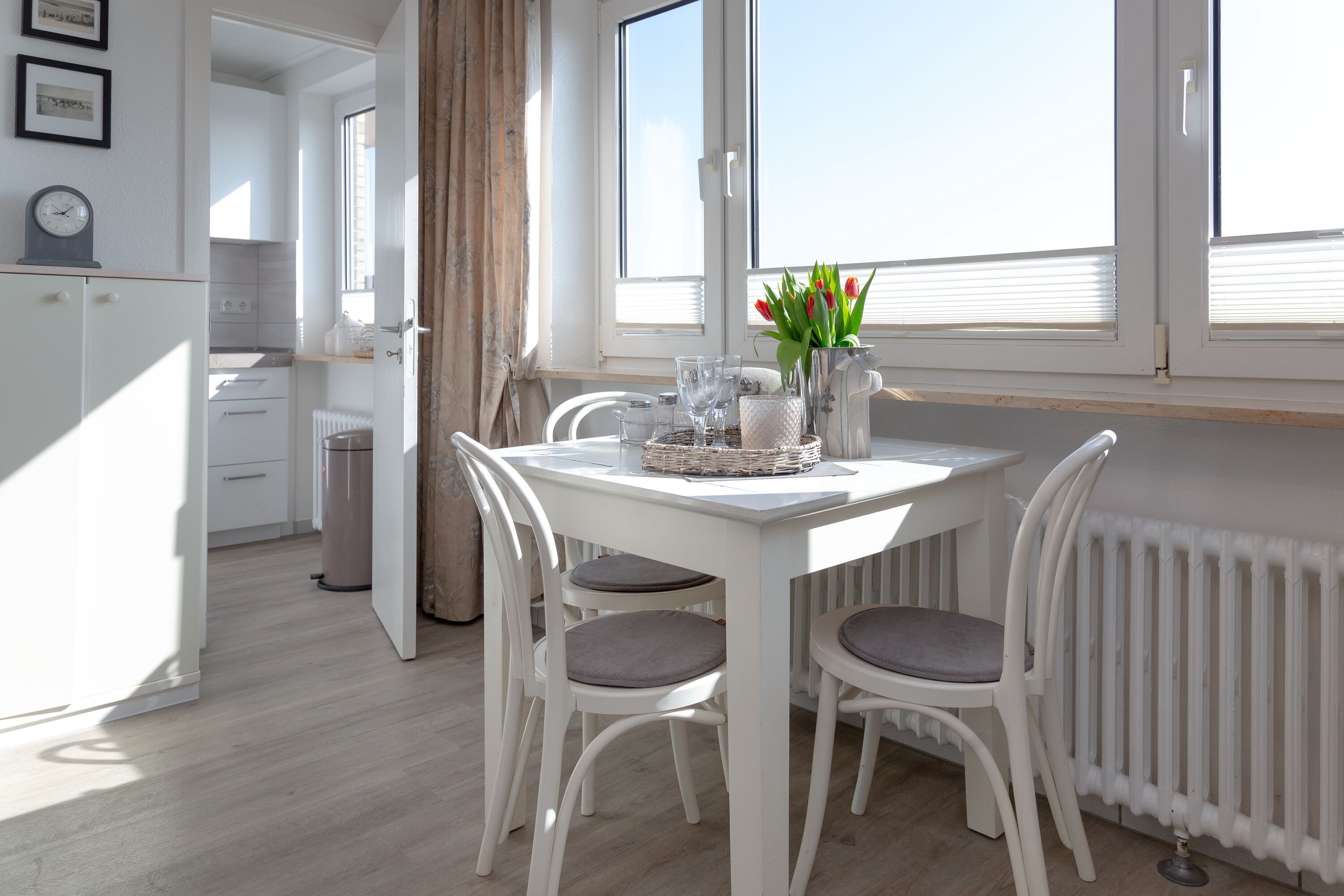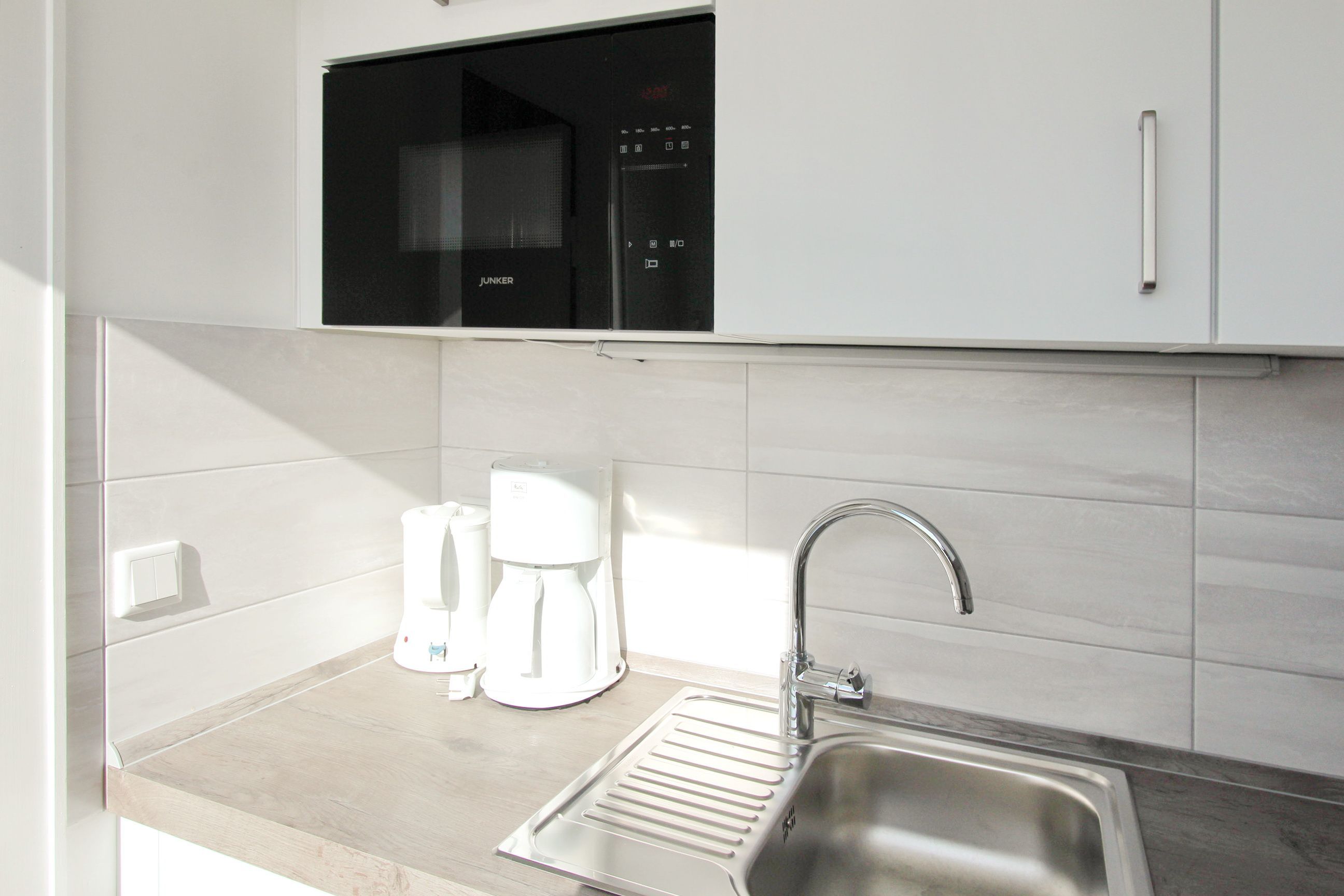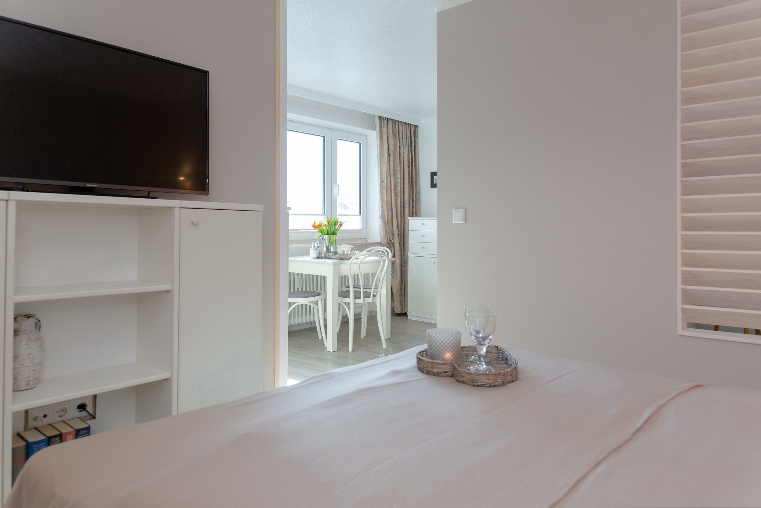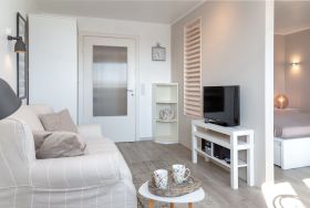 Kleine Wohlfühloase in direkter Strandnähe. Diese hell und freundlich eingerichtete Einzimmerwohnung in der 4. Etage im Beach House Stil verfügt über einen kombinierten Wohn-/Schlafraum mit einem feststehenden Bett, einen Essplatz für 2 Personen am Fenster und eine bequemen Couch mit Stoffbezug. Der Laminatboden macht den Raum hell und verleiht ihm ein angenehmes Wohnklima. In der kleinen, modernen Küche mit Geschirrspüler, 4 Platten-Ceranfeld und Mikrowelle können sie sich selbst versorgen. Die Küche hat ein Fenster zur Ostseite und ist somit gut zu belüften. Badezimmer mit Luxus-Komfort-Duschtempel, Fön, Handtuchtrockner und Kosmetikspiegel. Zur technischen Ausstattung gehört: ein Smart-Flachbildfernseher und eine Stereoanlage mit CD Player. Der Eigentümer bittet Sie darum, in dieser Wohnung nicht zu rauchen. Ein kostenfreier Hotspot im Haus, der ihnen kabellosen Zugang ins Internet ermöglicht, ist vorhanden (WEG-AD3 - Passwortfrei - ohne Gewähr). Die Größe dieser Nichtraucherwohnung beträgt: ca. 35 m². Vierbeinige Begleiter sind ausdrücklich erlaubt.