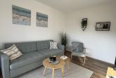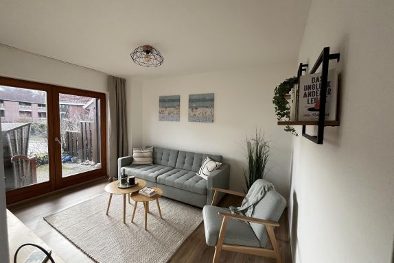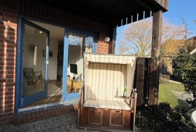 Das Wohnzimmer ist hell und freundlich eingerichtet, von dort geht man auf die Südterrasse mit Gartenmöbeln und eigenem Strandkorb.