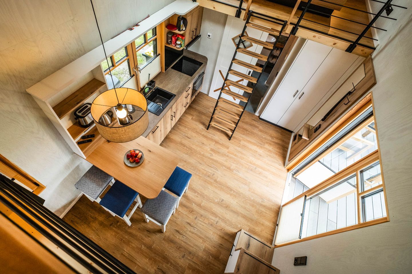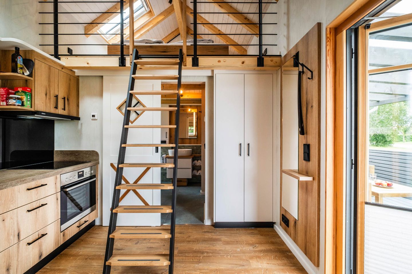Bitte beachten Sie, dass sich in unseren Tiny Houses eine relativ steile, nicht vollständig gesicherte Treppe befindet. Diese erfordert sicheres, selbstständiges Gehen und eine gute Koordination.