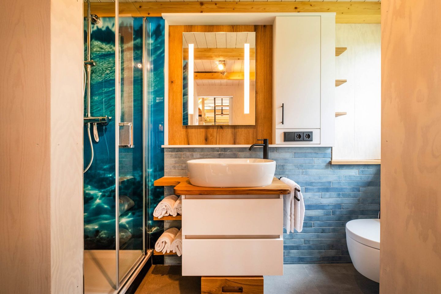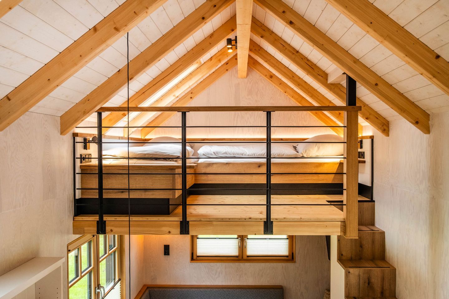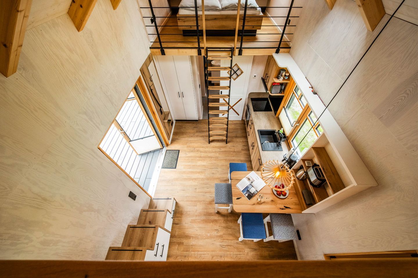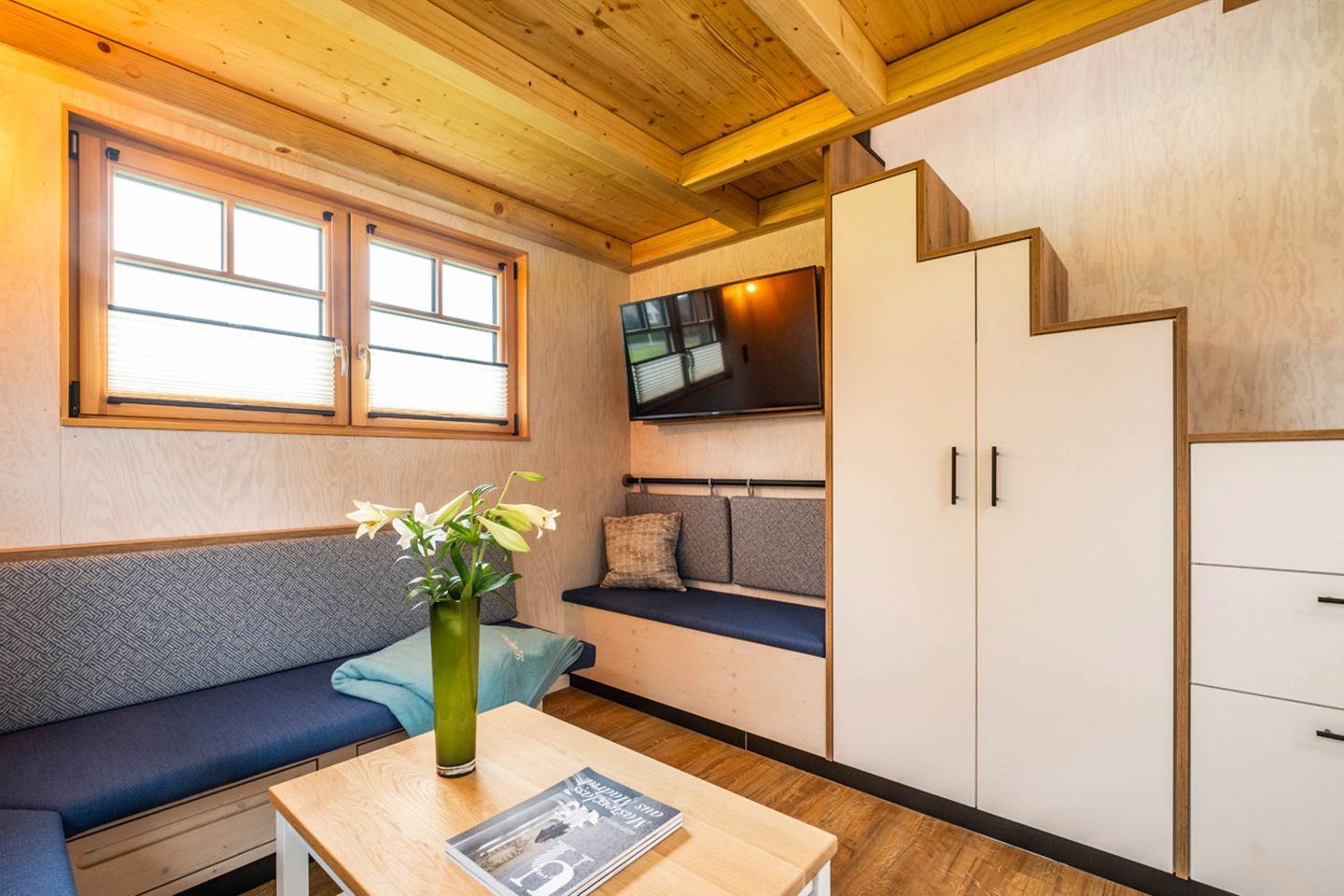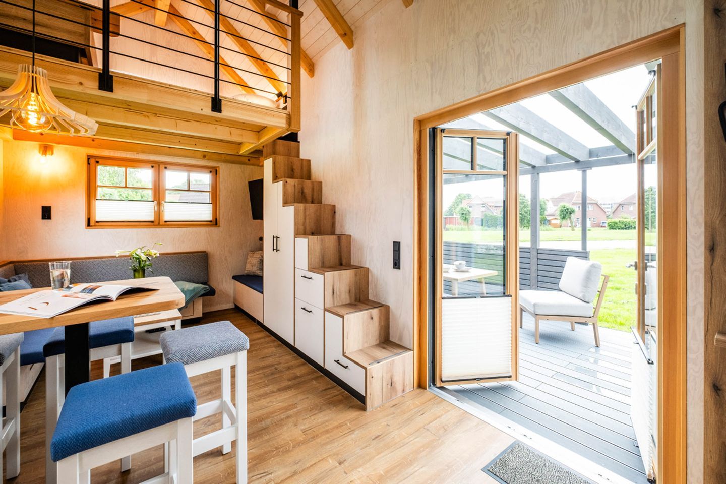 Bitte beachten Sie, dass sich in unseren Tiny Houses eine relativ steile, nicht vollständig gesicherte Treppe befindet. Diese erfordert sicheres, selbstständiges Gehen und eine gute Koordination.