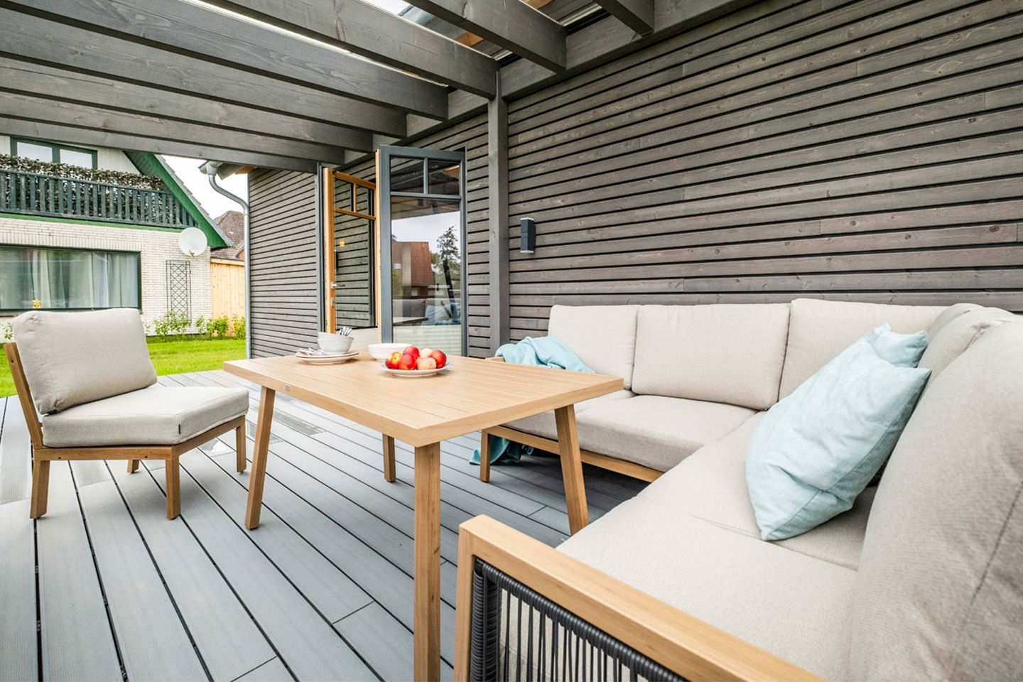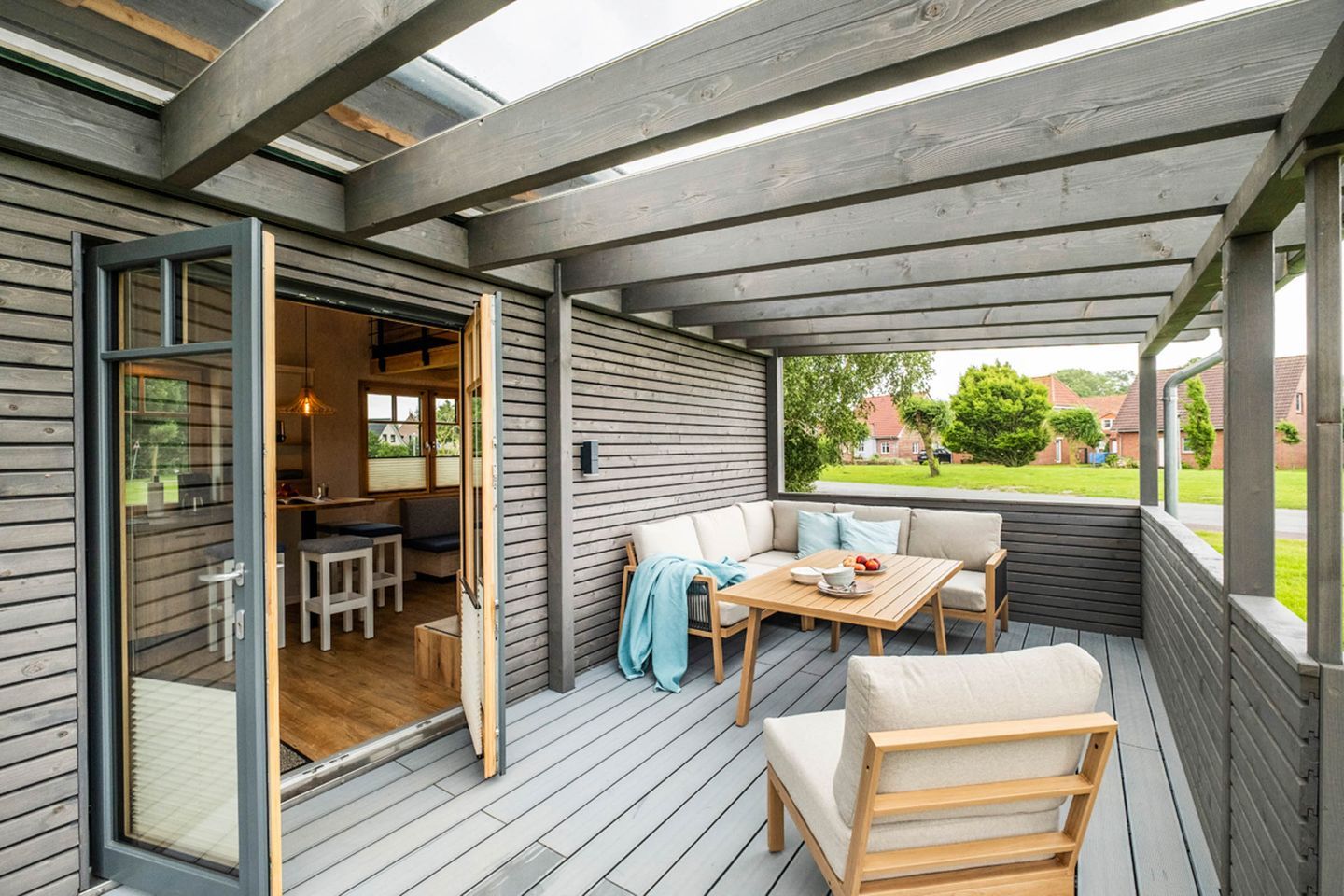 Ein besonderes Highlight des Tiny-House ist die überdachte Terrasse, die einen herrlichen Blick auf den Garten bietet. Hier können Sie die frische Nordseeluft genießen und entspannen, während die Kinder im Garten spielen. Die Terrasse ist der perfekte Ort für ein Frühstück im Freien oder ein Glas Wein am Abend.