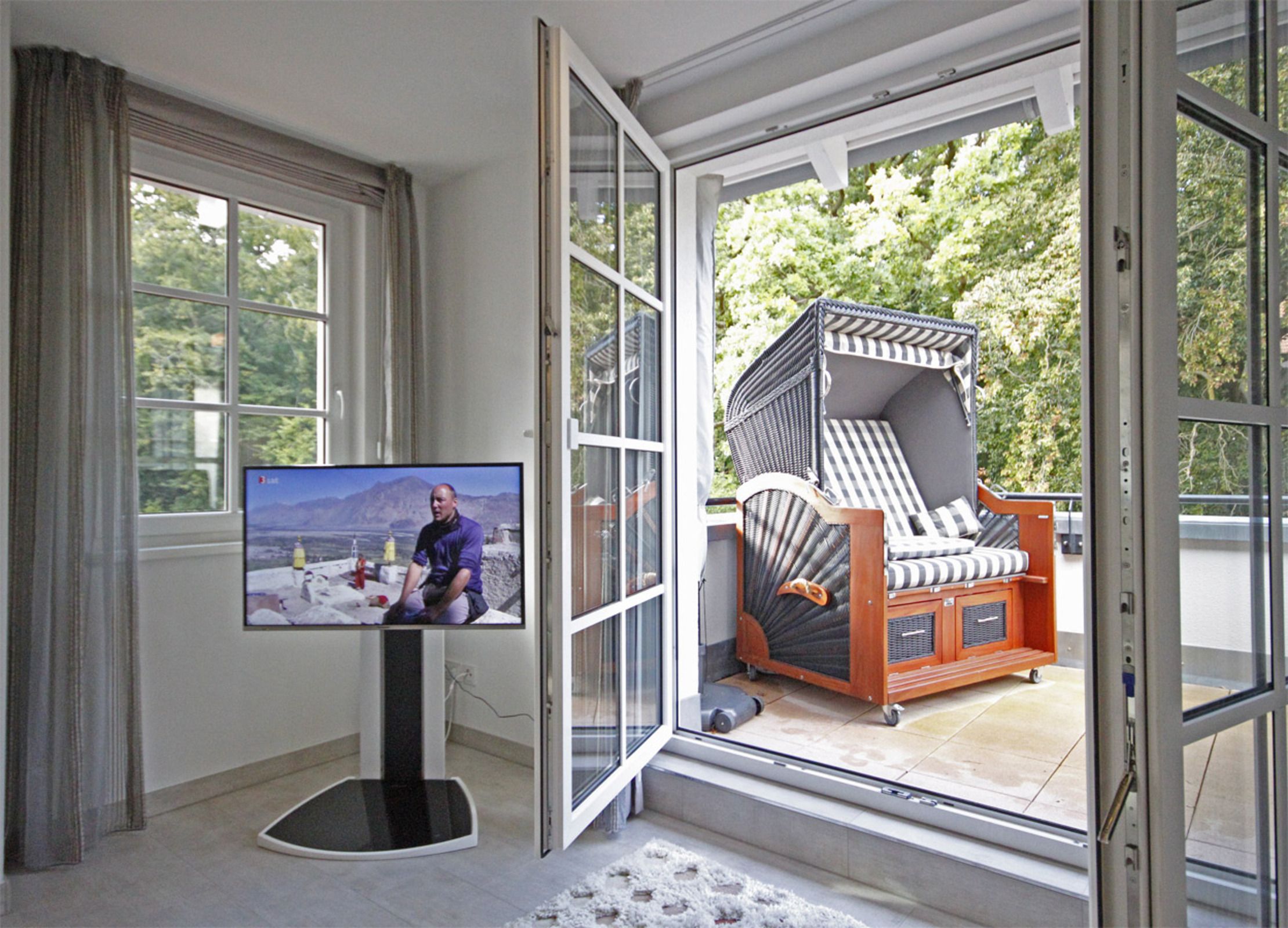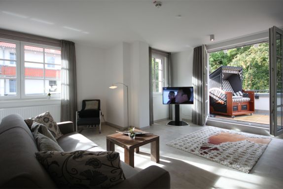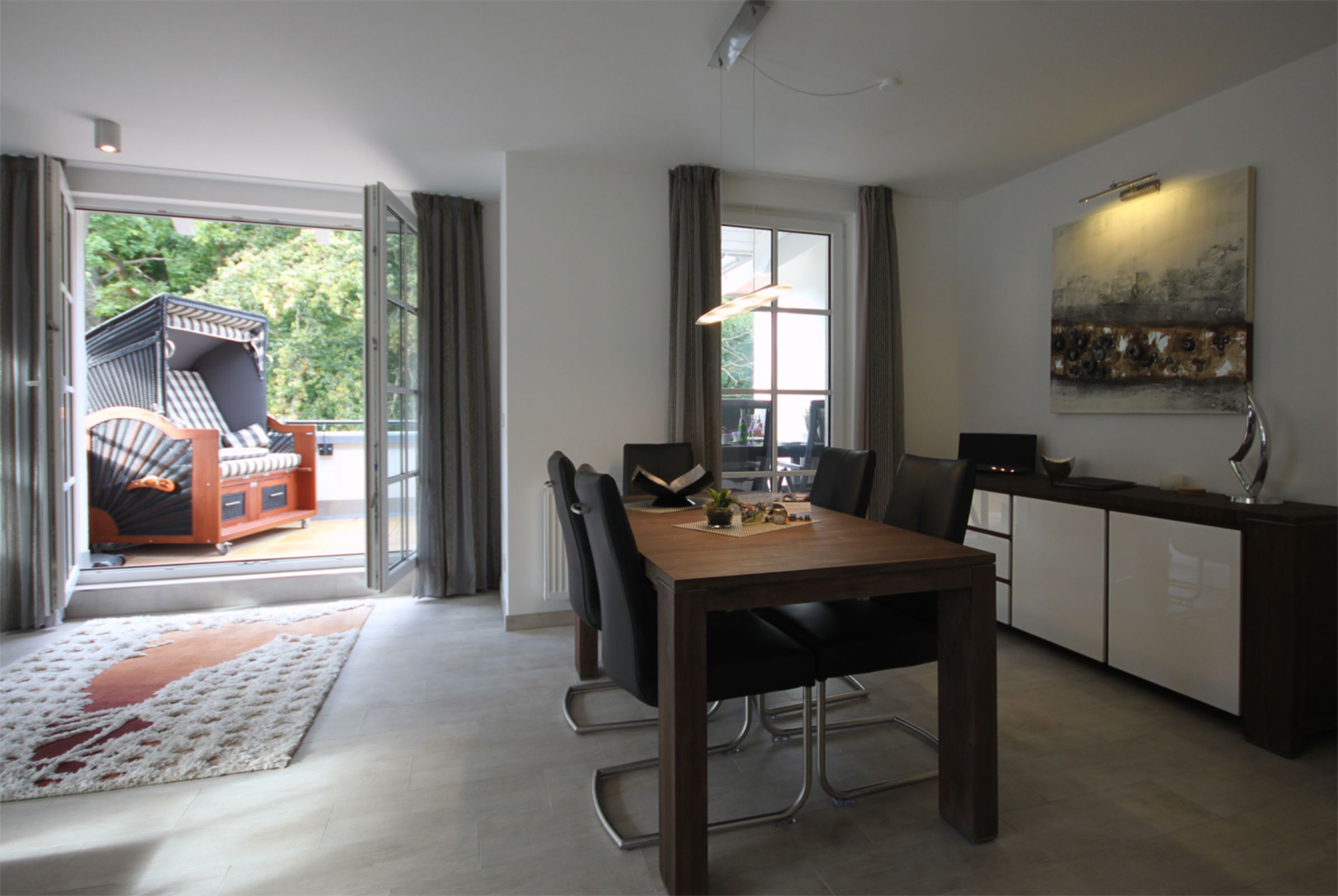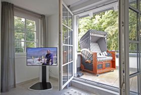 Wohnung mit Sonnendecks: Die gleichnamige Ferienwohnung ist ein wahres Luxus-Objekt. Mit einer Wohnfläche von 75 Quadratmetern, zwei Balkonen, einem Gäste-WC und einem Strandkorb im Außenbereich bietet die Wohnung Sonnendeck die perfekte Ausstattung für bis zu vier Personen. Das separate Schlafzimmer mit Doppelbett, TV und Kleiderschrank hat zwei Schlafplätze. Weitere zwei Personen können auf dem Schlafsofa im Wohn-/Essbereich übernachten, wo ebenfalls ein Fernsehgerät aufgestellt ist. Die Wohnung, die sich im dritten Obergeschoss befindet, hat einen großzügig möblierten Balkon mit Strandkorb und einen kleineren zweiten Balkon. Beide sind in Richtung Kiefernwald gelegen. Die Unterkunft ist für vier Personen eingerichtet, der Essbereich sogar für fünf. In der Küchenzeile finden Sie einen Vier-Plattenherd mit Cerankochfeld und Backofen, einen Kühlschrank, eine Mikrowelle, eine Spülmaschine sowie einen Toaster und eine Kaffeemaschine vor.