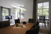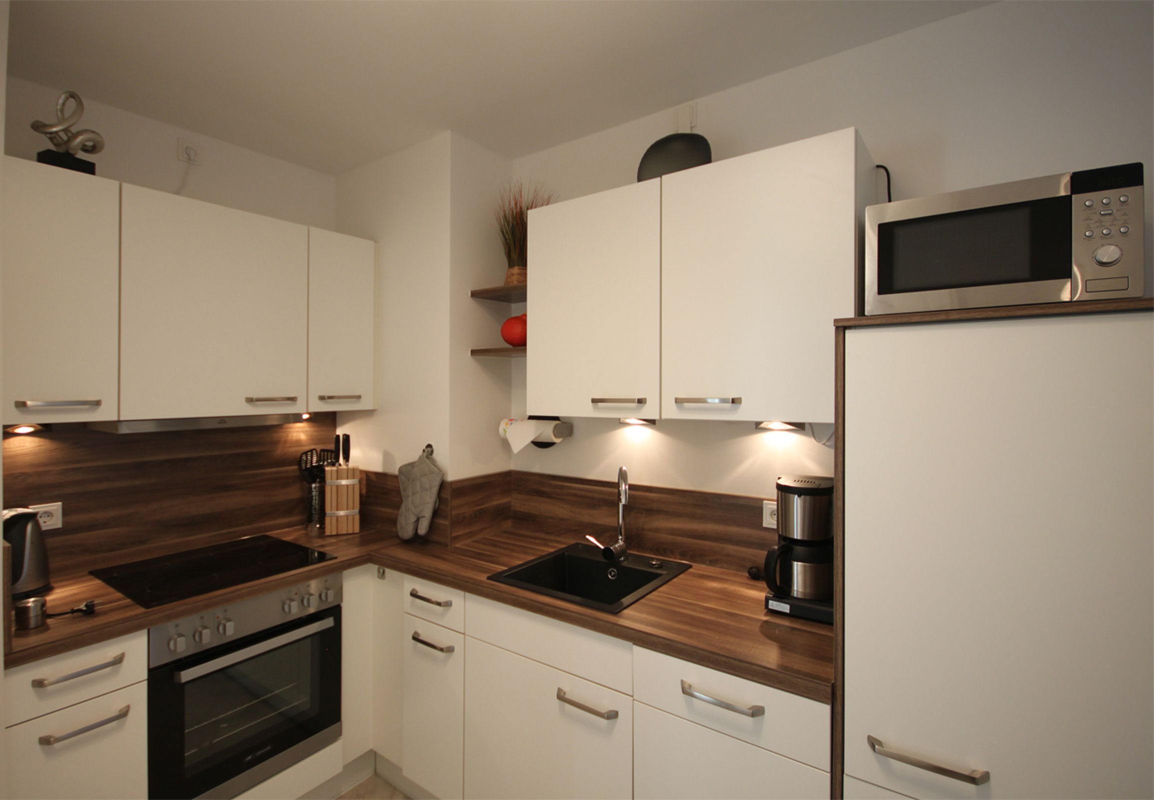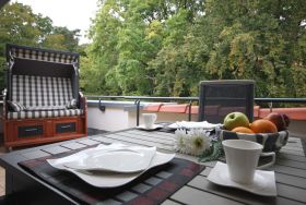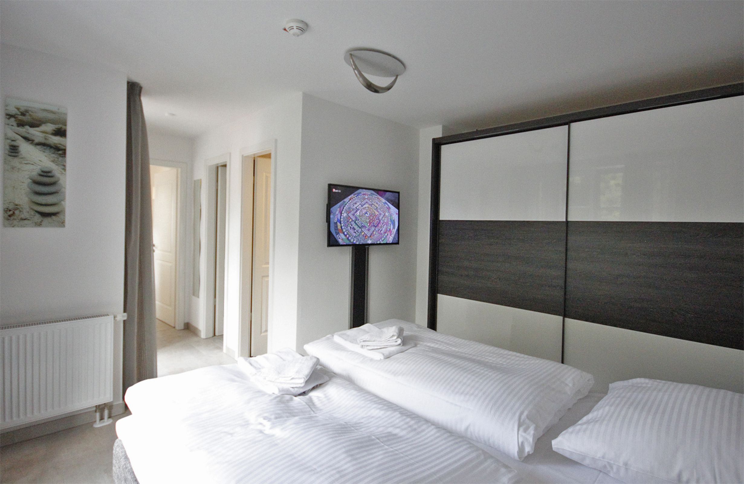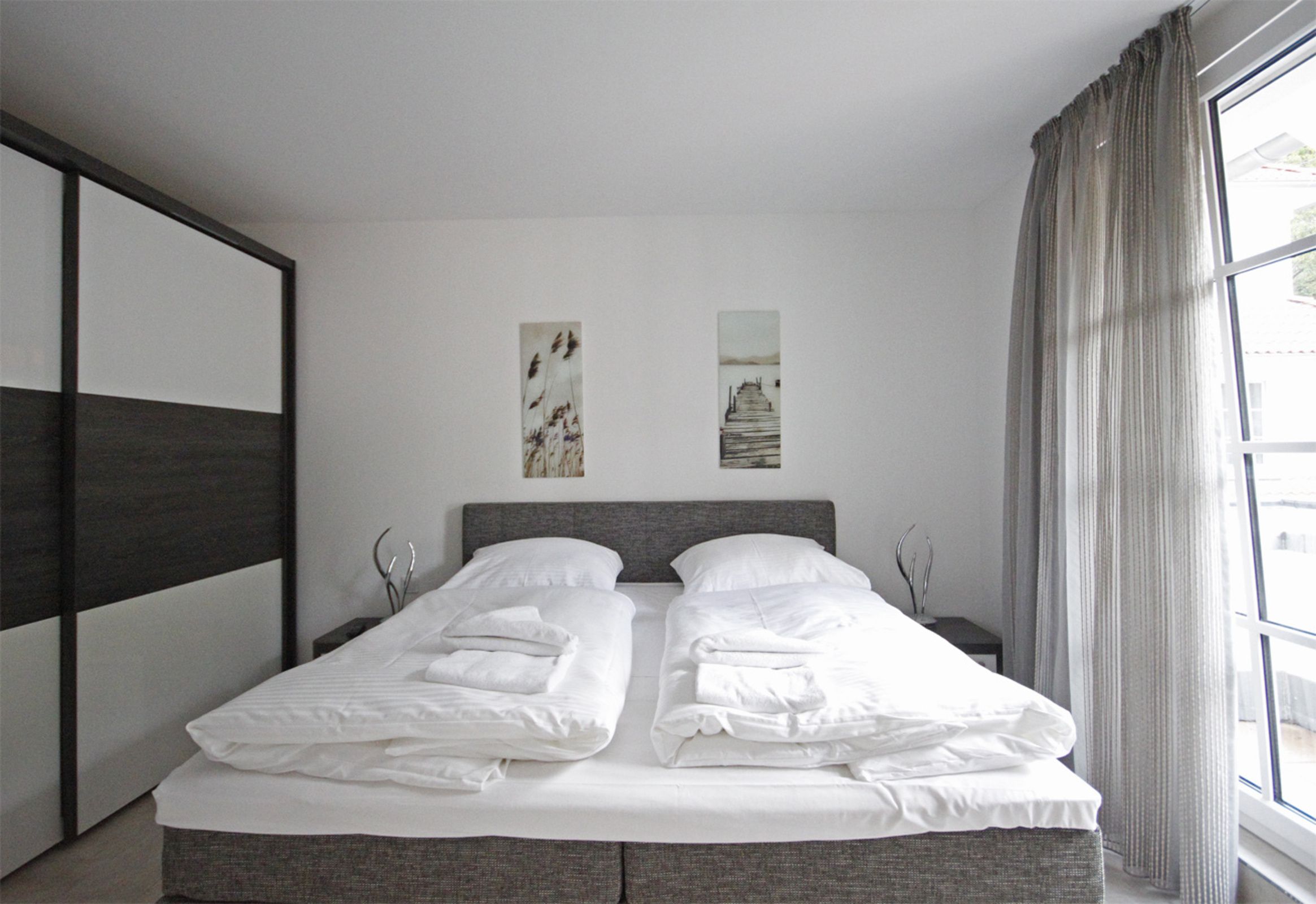 Wohnung mit Sonnendecks: Die gleichnamige Ferienwohnung ist ein wahres Luxus-Objekt. Mit einer Wohnfläche von 75 Quadratmetern, zwei Balkonen, einem Gäste-WC und einem Strandkorb im Außenbereich bietet die Wohnung Sonnendeck die perfekte Ausstattung für bis zu vier Personen. Das separate Schlafzimmer mit Doppelbett, TV und Kleiderschrank hat zwei Schlafplätze. Weitere zwei Personen können auf dem Schlafsofa im Wohn-/Essbereich übernachten, wo ebenfalls ein Fernsehgerät aufgestellt ist. Die Wohnung, die sich im dritten Obergeschoss befindet, hat einen großzügig möblierten Balkon mit Strandkorb und einen kleineren zweiten Balkon. Beide sind in Richtung Kiefernwald gelegen. Die Unterkunft ist für vier Personen eingerichtet, der Essbereich sogar für fünf. In der Küchenzeile finden Sie einen Vier-Plattenherd mit Cerankochfeld und Backofen, einen Kühlschrank, eine Mikrowelle, eine Spülmaschine sowie einen Toaster und eine Kaffeemaschine vor.