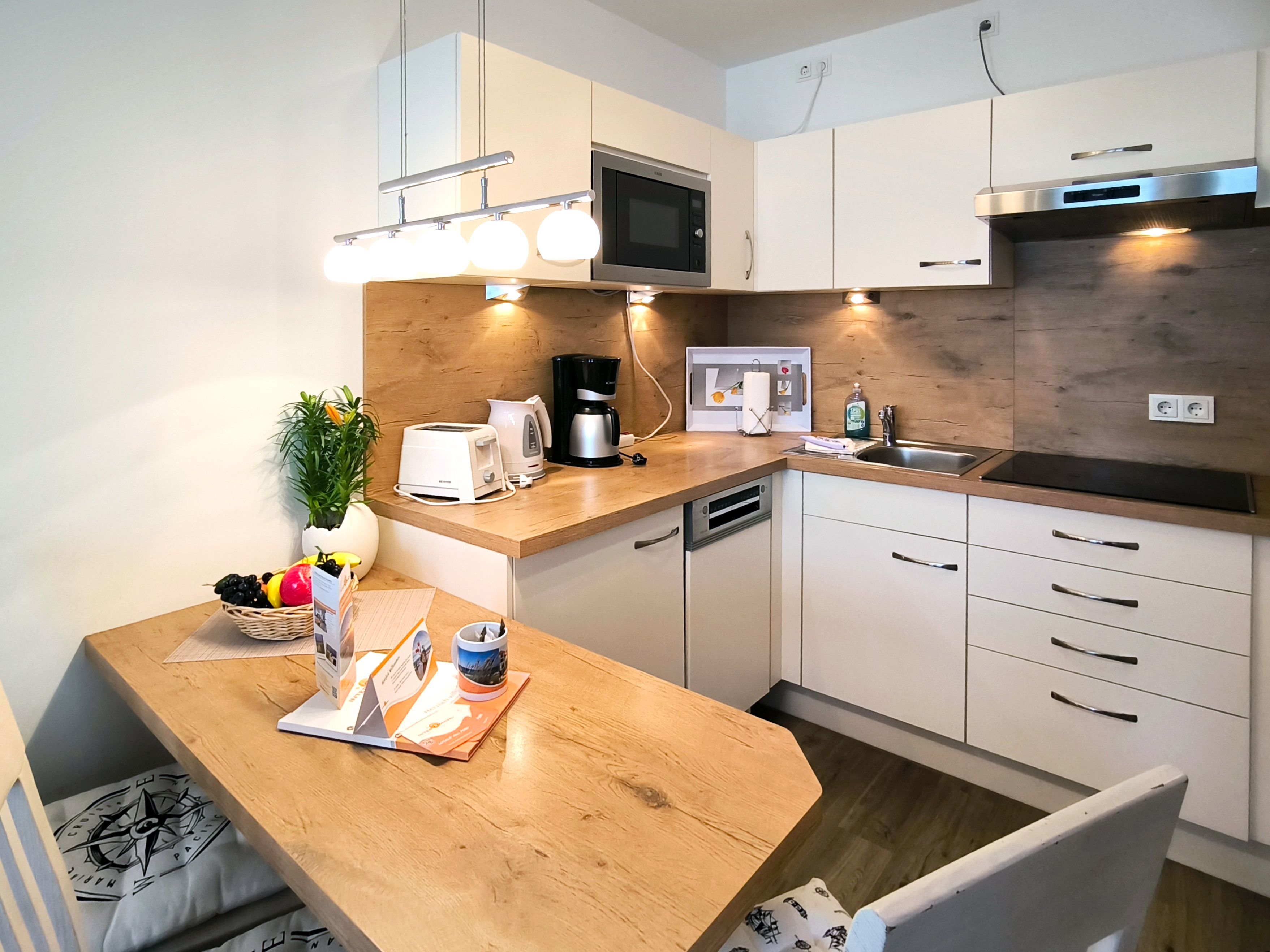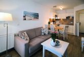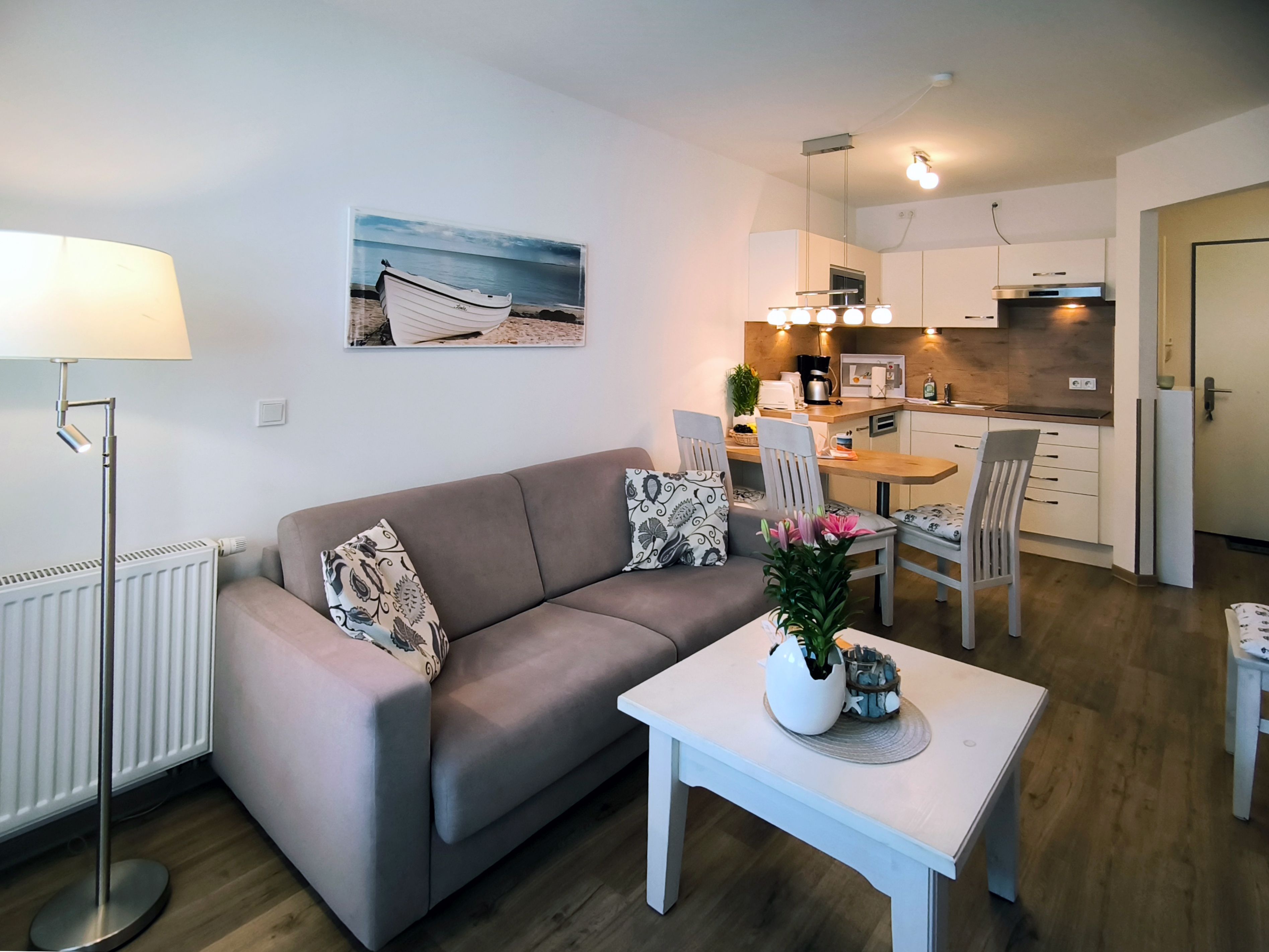 Im Wohnbereich befindet sich ein Fernseher und ein Radio sowie ein Schlafsofa, das als Aufbettung für eine 3. Person genutzt werden kann. Die Küchenzeile ist in diesen Raum harmonisch integriert.