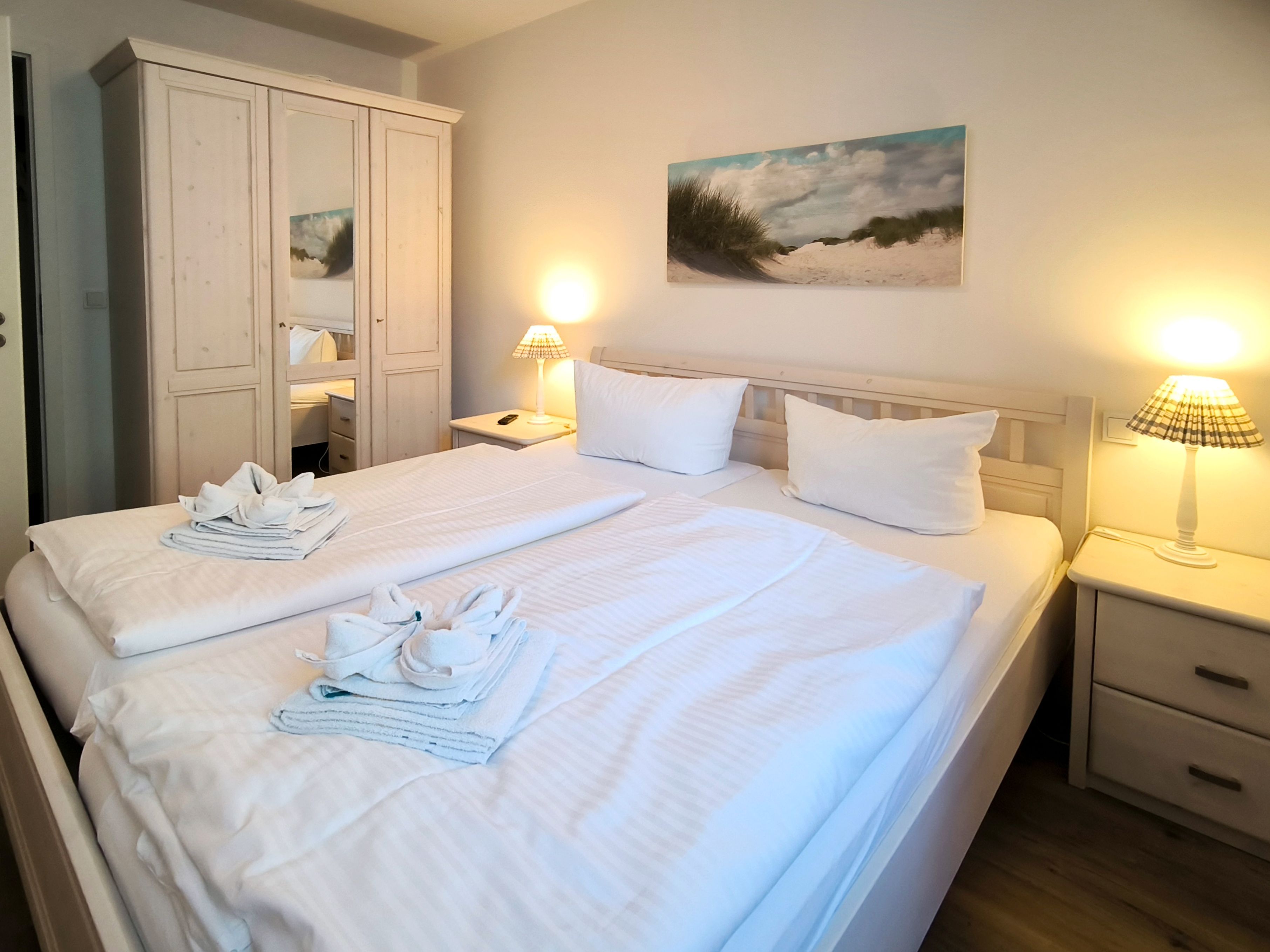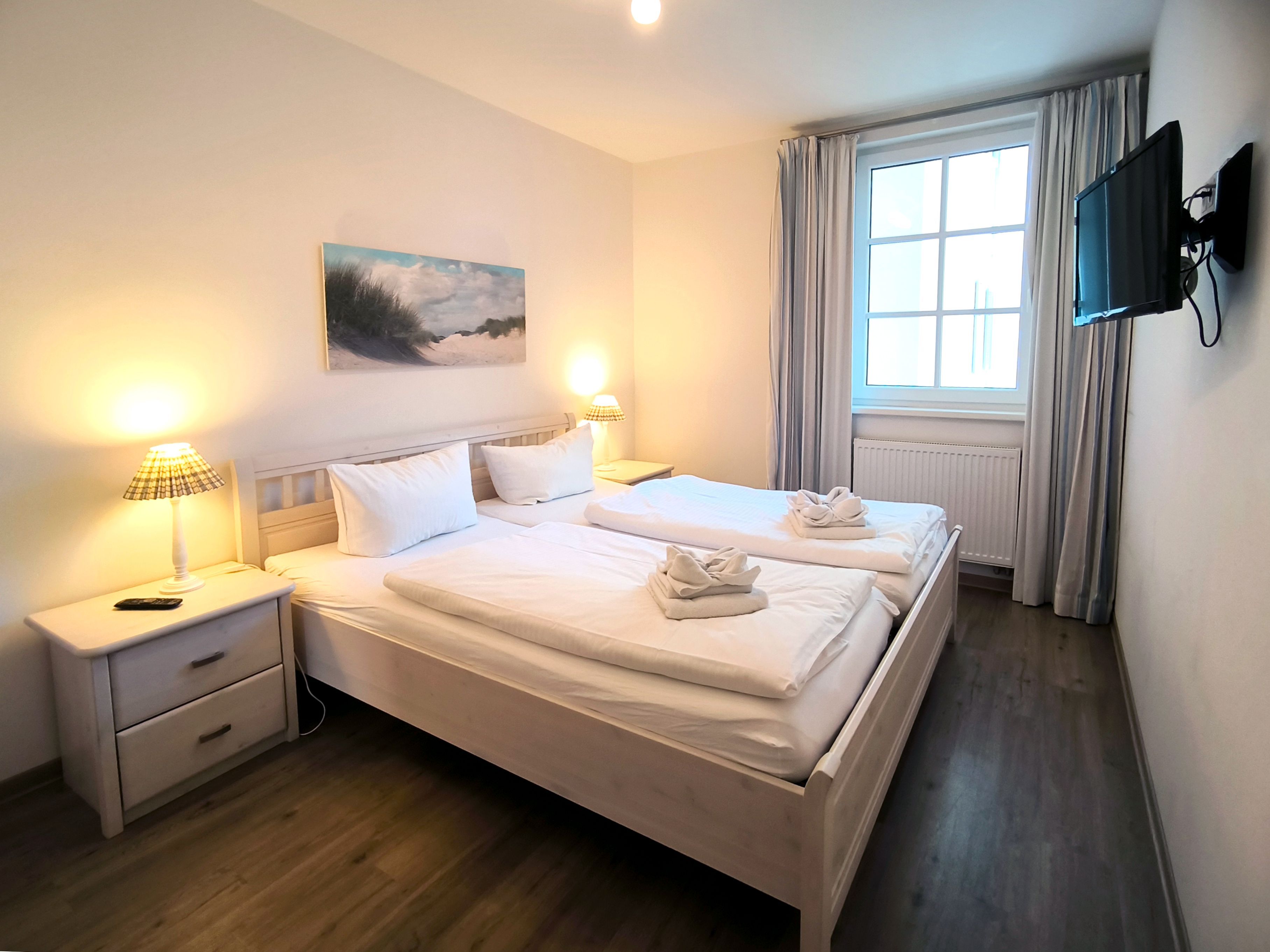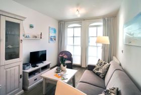 Die gemütlich und angenehm maritim eingerichtete Ferienwohnung Albatros im 2. Obergeschoss der Ferienresidenz Haus Meeresblick bietet Platz für 2 bis 3 Personen und verfügt über einen möblierten Balkon. Das separate Schlafzimmer ist mit einem Doppelbett (1,80 m x 2,00 m) und extra Fernseher ausgestattet. Dort kann zusätzlich ein Babybett bereitgestellt werden.