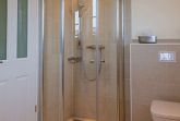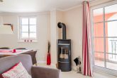 Im unteren Teil der Wohnung befindet sich ein Wohn- und Essbereich mit Kamin und einer Loggia, von der aus Sie bis zum Meer schauen können. Auf dieser Ebene sind außerdem 2 Duschbäder - jeweils mit Fußbodenheizung. Eines der Bäder hat eine Infrarotsauna. Vier Gäste finden in 2 Schlafzimmern ihre Nachtruhe - beide haben ein Doppelbett und einen Fernseher. Ein Babybett (für Kinder bis einschl. 2 Jahre) und ein Kinderhochstuhl können auf Wunsch bereitgestellt werden.