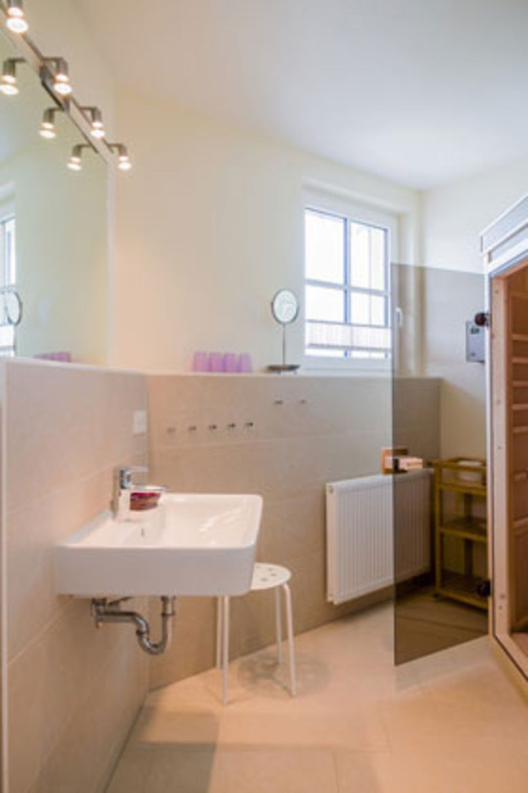 Auch von hier haben Sie einen direkten Zugang zum Strand. Das Haus ist mit einem Lift, einer Tiefgarage und einem großen Wellnessbereich mit Schwimmbad (ca. 8,00 m x 4,00 m - 1,35 m tief), zwei Saunen (eine finnische Sauna/eine Bio-Sauna) und einem Massagebereich ausgestattet. Der Wellnessbereich ist ganzjährig geöffnet. Bei Ankunft werden Sie an der Rezeption empfangen. Allen Gästen steht die modern eingerichtete Lobby zur Verfügung.