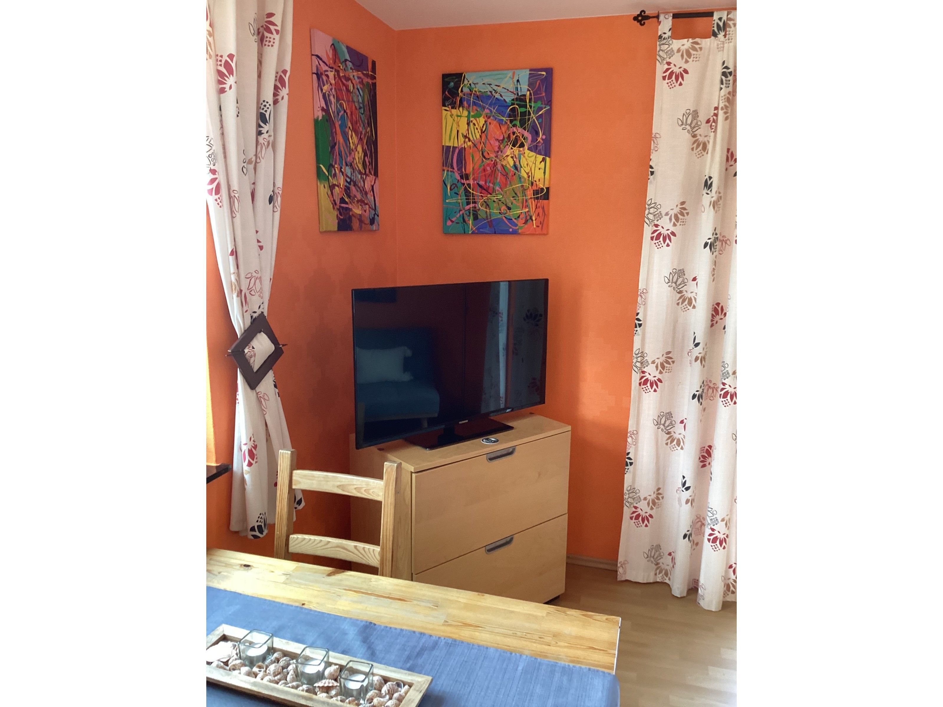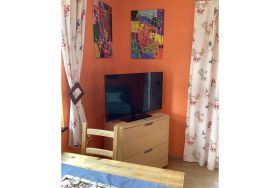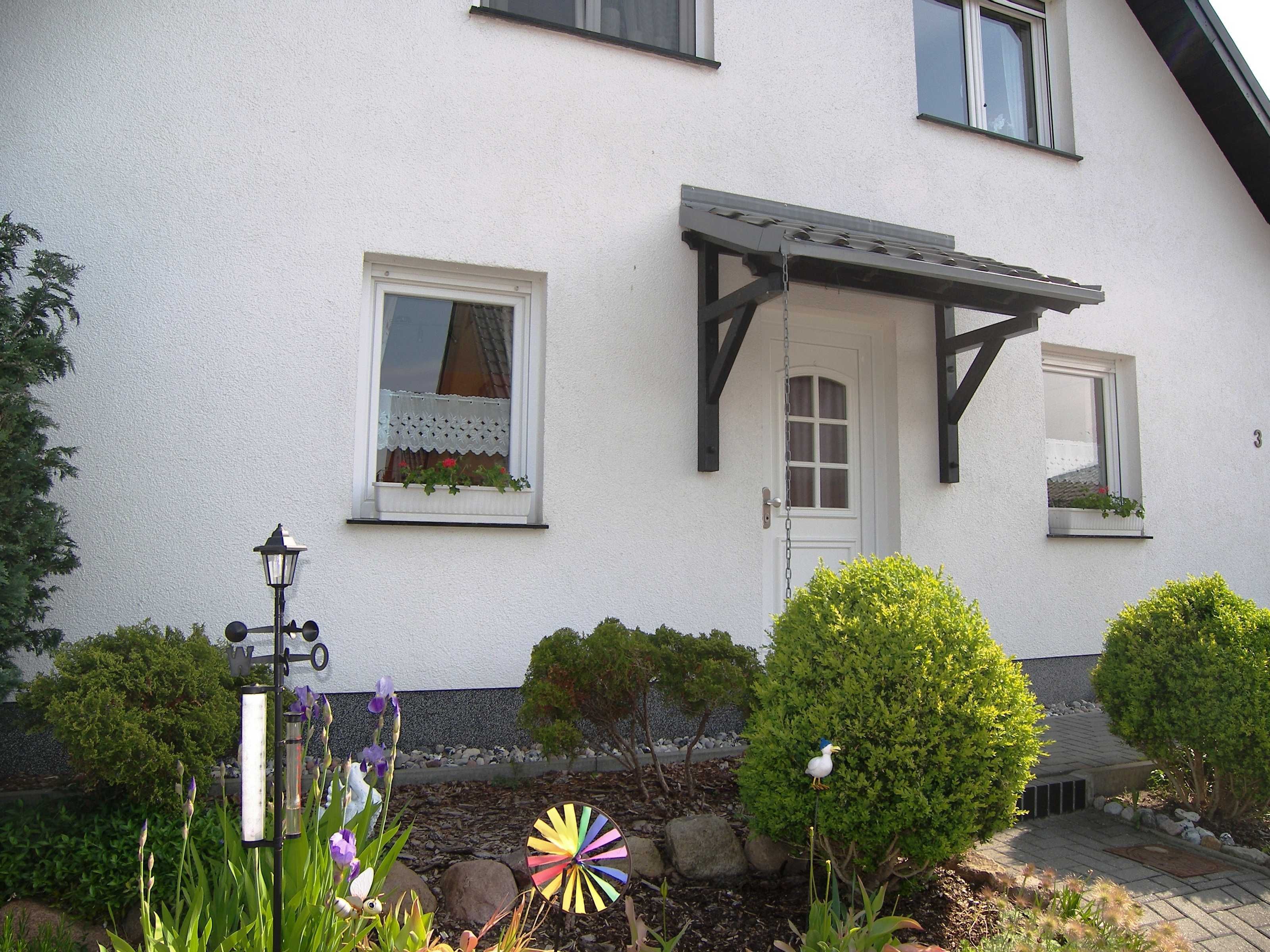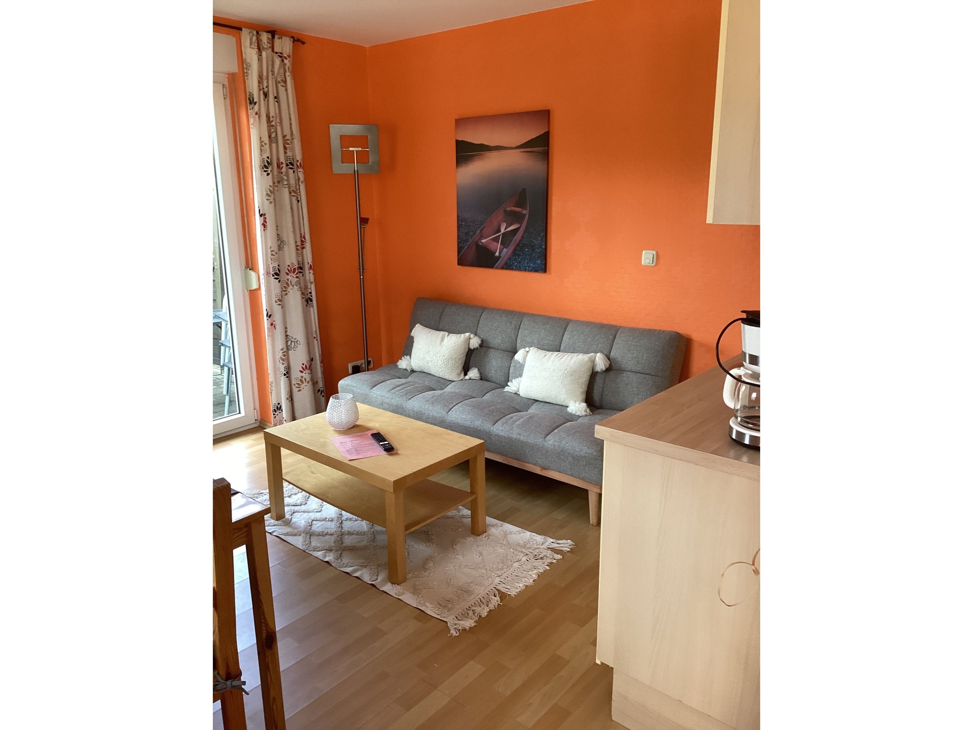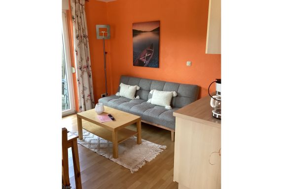 Über einen separaten Eingang erreichen Sie die Ferienwohnung, die im Erdgeschoss liegt. Vom Wohnzimmer aus gelangen Sie auf die möblierte Terrasse mit Sonnenschirm.