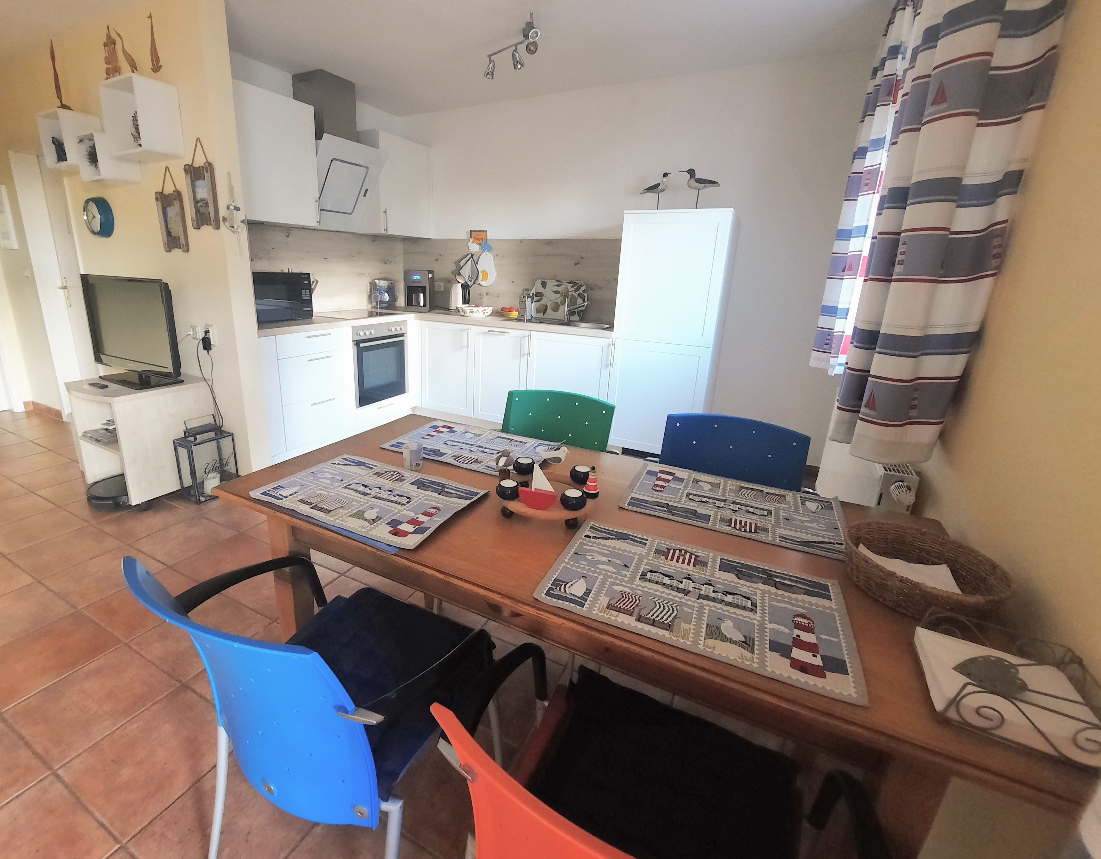 - ein großer Koch-/Ess- und Wohnbereich mit einer neuen Einbauküche (mit Geschirrspüler, Kühlschrank, Herd mit Backofen, Mikrowelle, Kaffeemaschine, Wasserkocher, Toaster), separatem Essplatz und gemütlicher Sitzecke mit Flachbildfernseher für die Unterhaltung am entspannenden Abend.