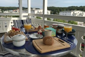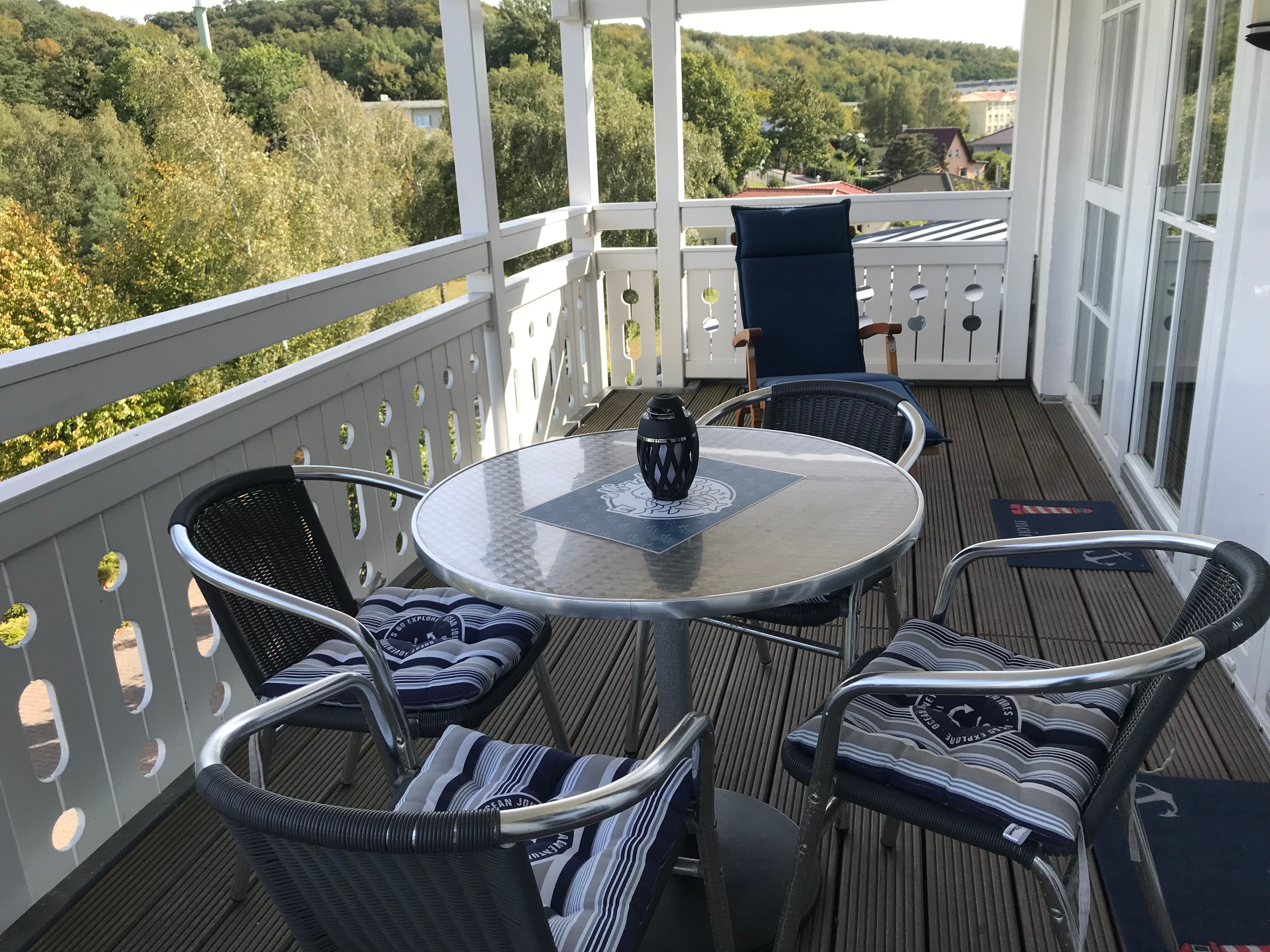 Nach einem erlebnisreichen Urlaubstag oder schon zum ausgiebigen Frühstück können Sie auf dem sehr großen Balkon Platz nehmen. Der tolle Ausblick, die Sitzgruppe und ein Liegestuhl sorgen hier für ein wunderbares Urlaubsgefühl.