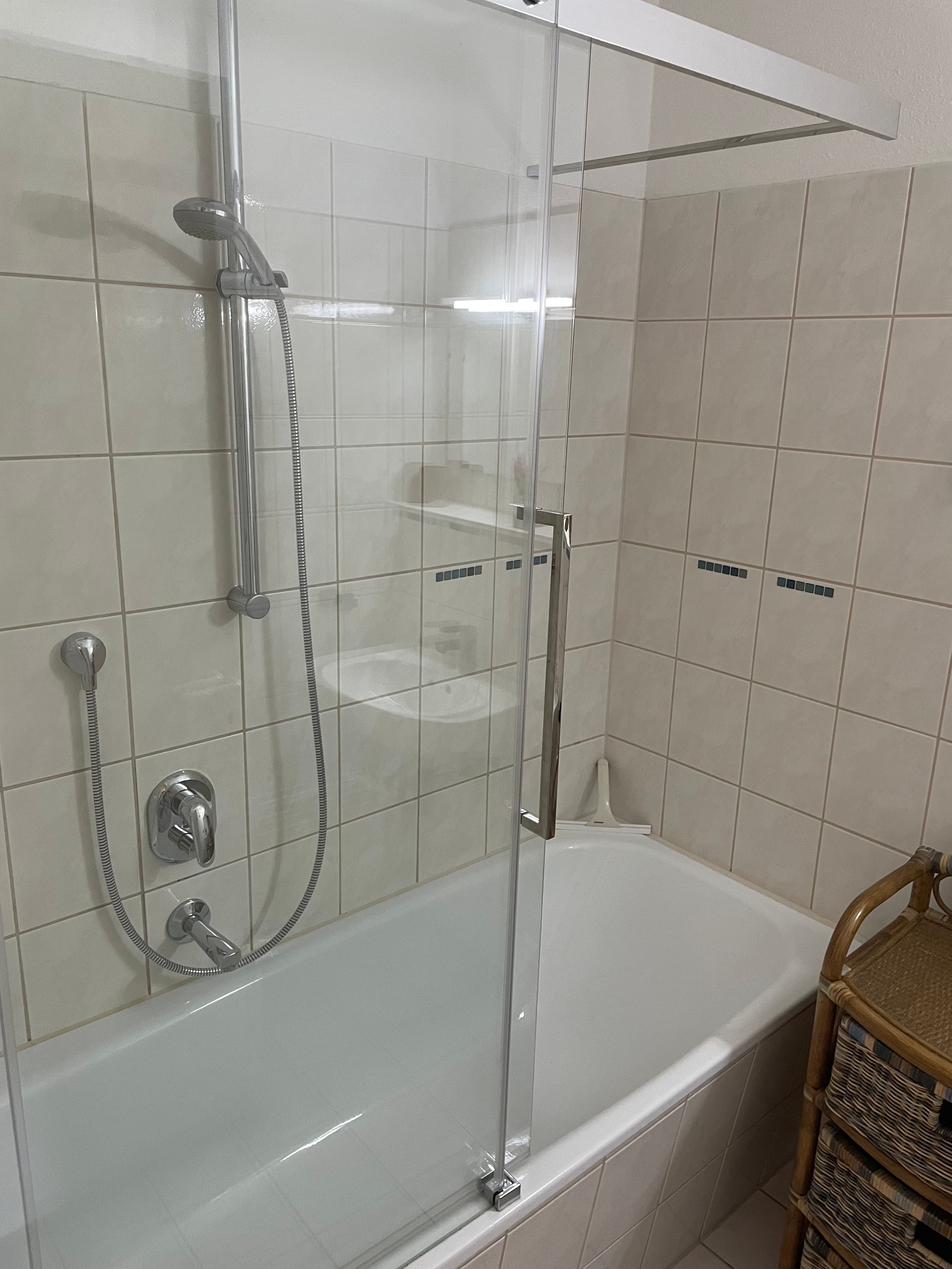 Wohnzimmer mit ausklappbarer Schlafcouch, Schlafzimmer, Bad mit Wanne, separates WC, grosser Balkon