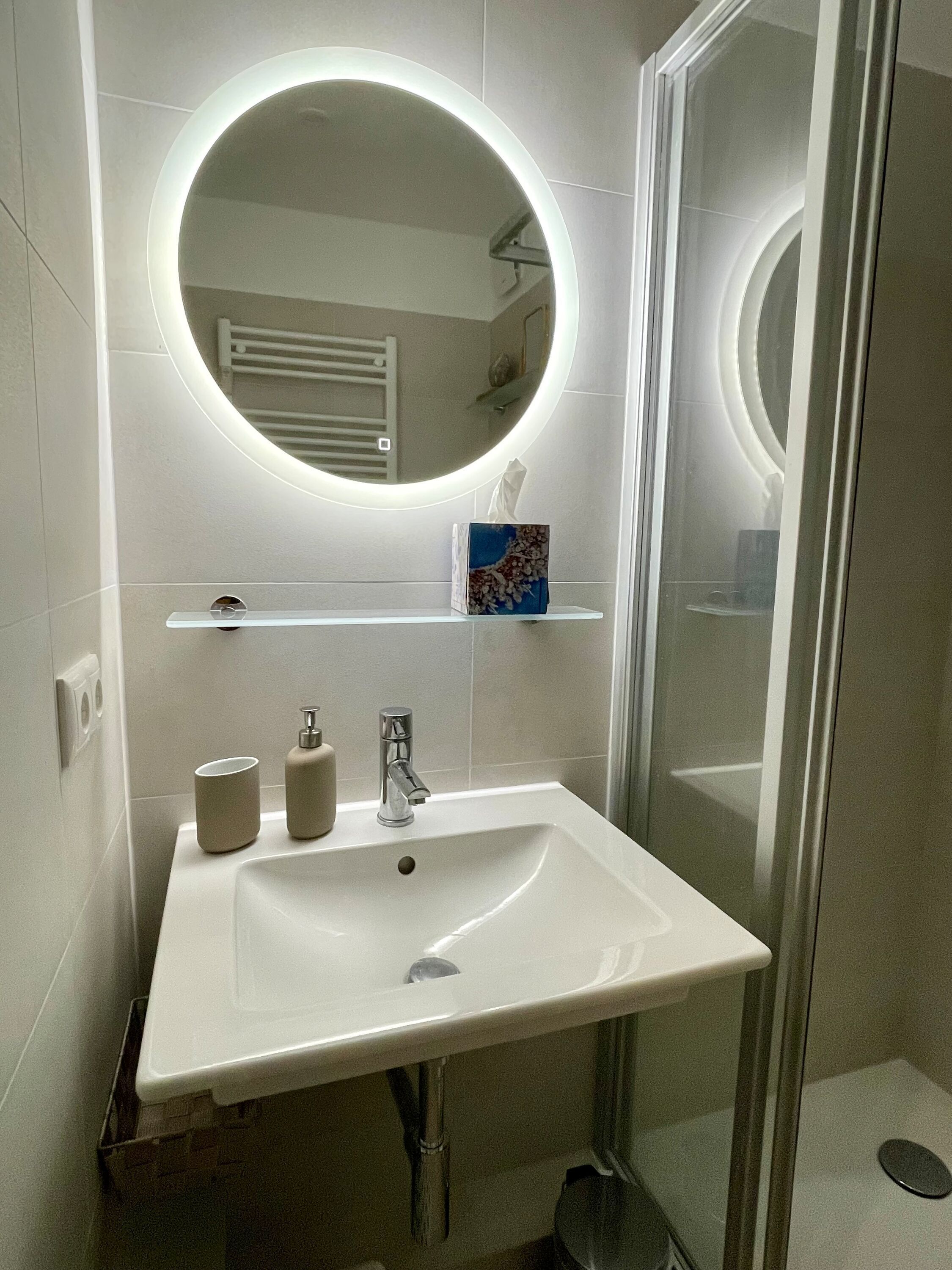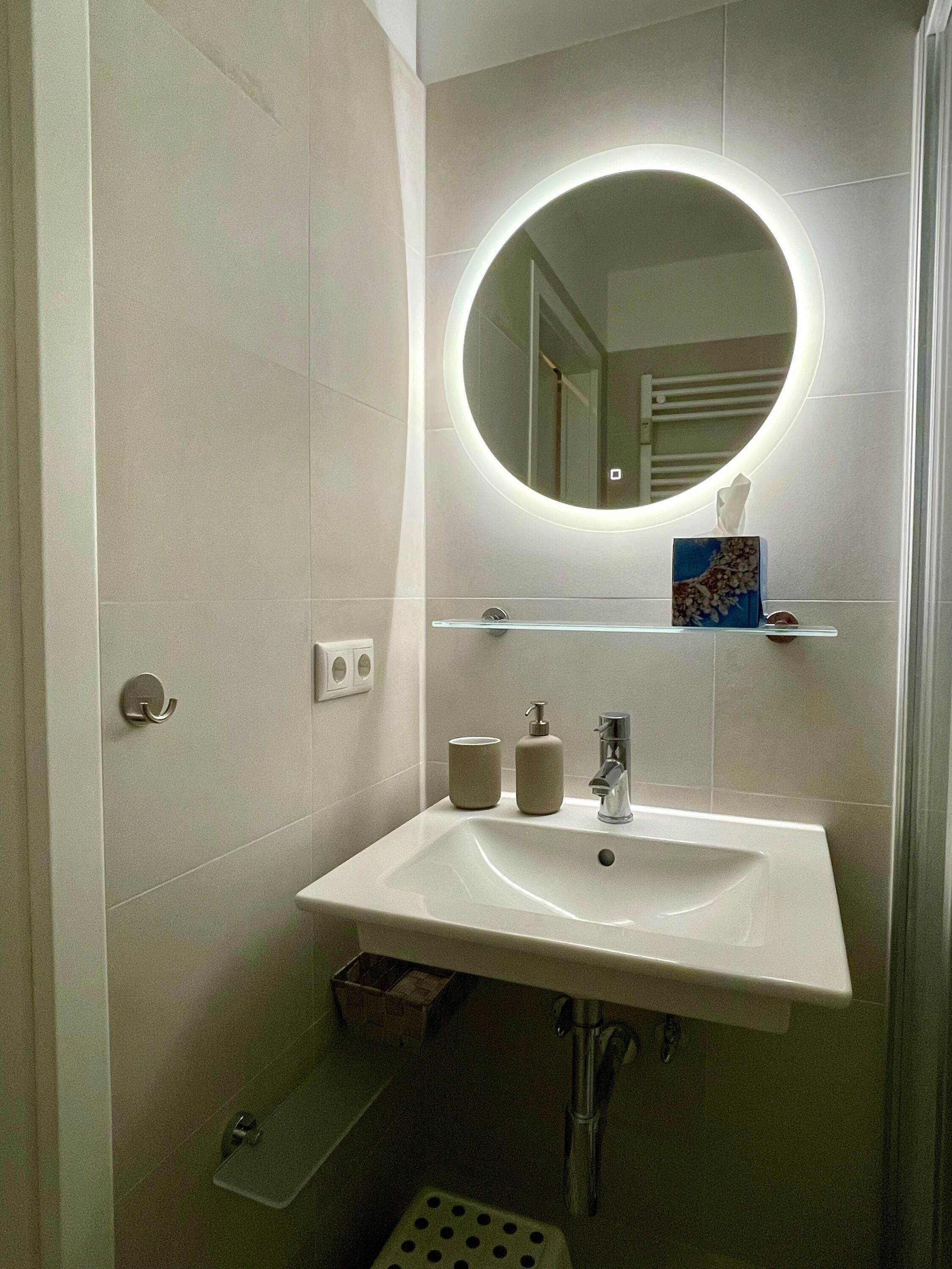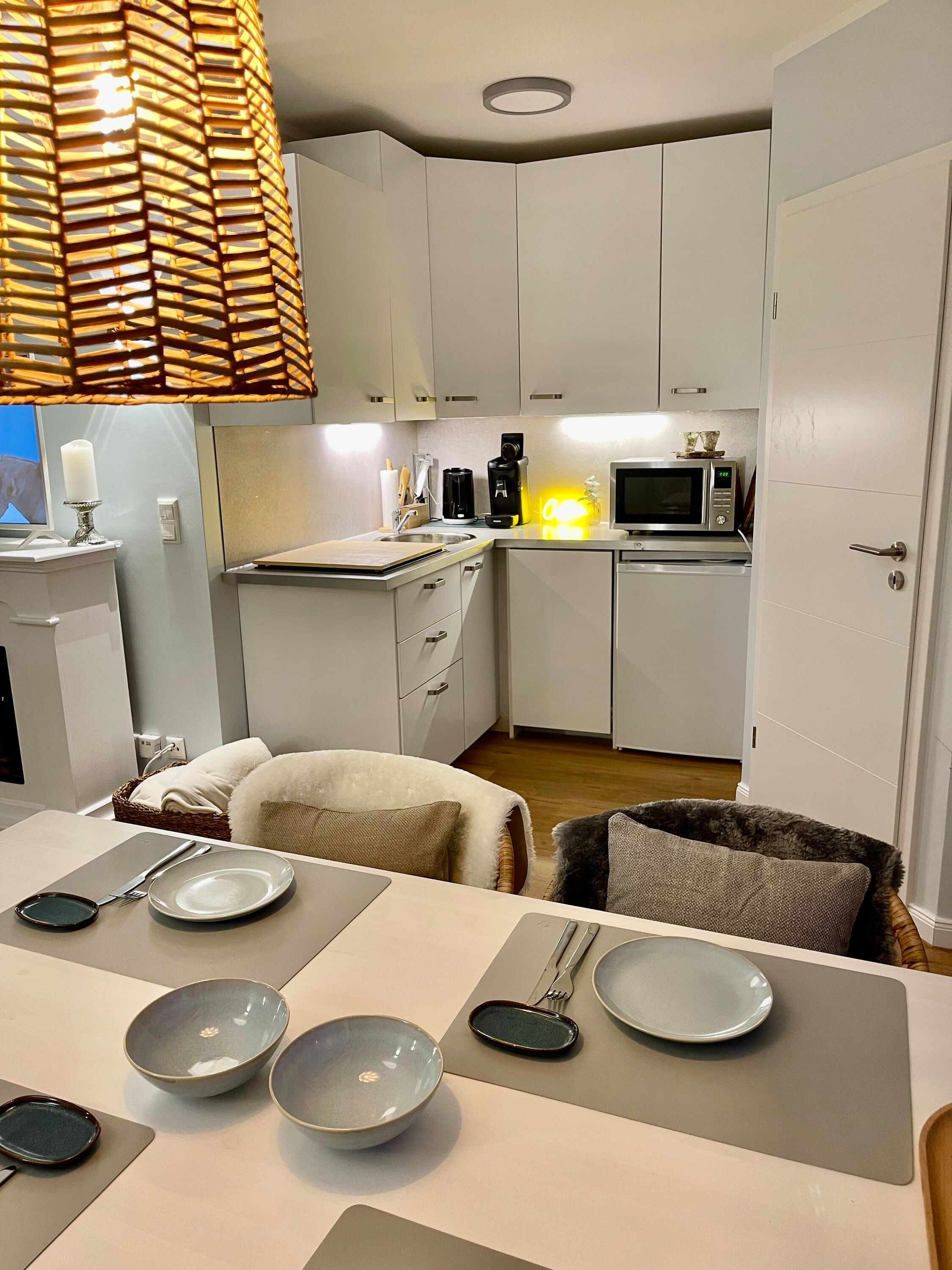 Küche mit Kühlschrank, Gefrierfach, Geschirrspüler, Mikrowelle-Backofen Kombi, Senseo-Kaffeemaschine (Pads), Wasserkocher, Toaster, Eierkocher, Induktionsherd (4 Platten).