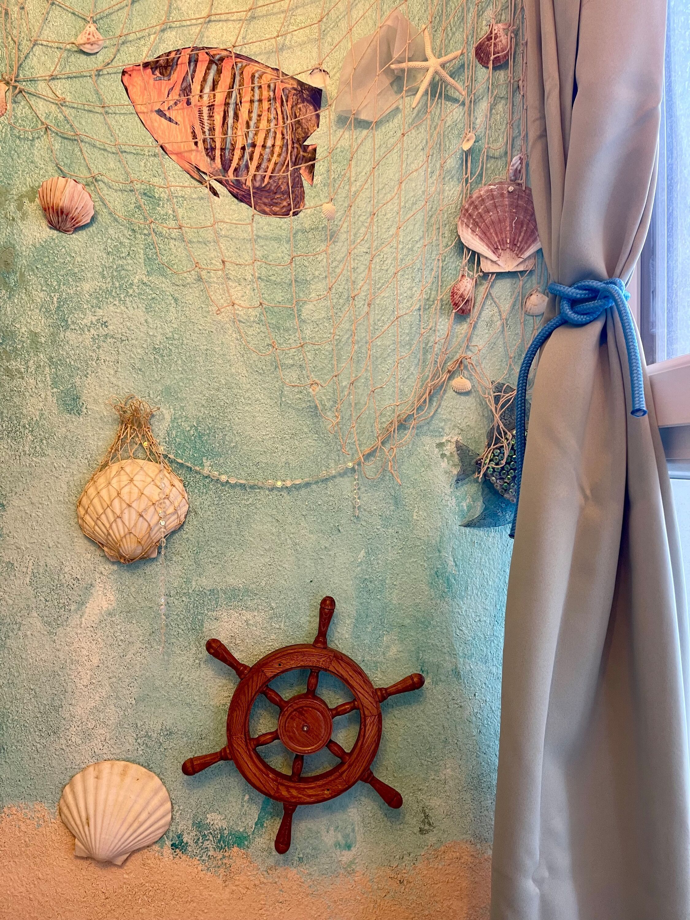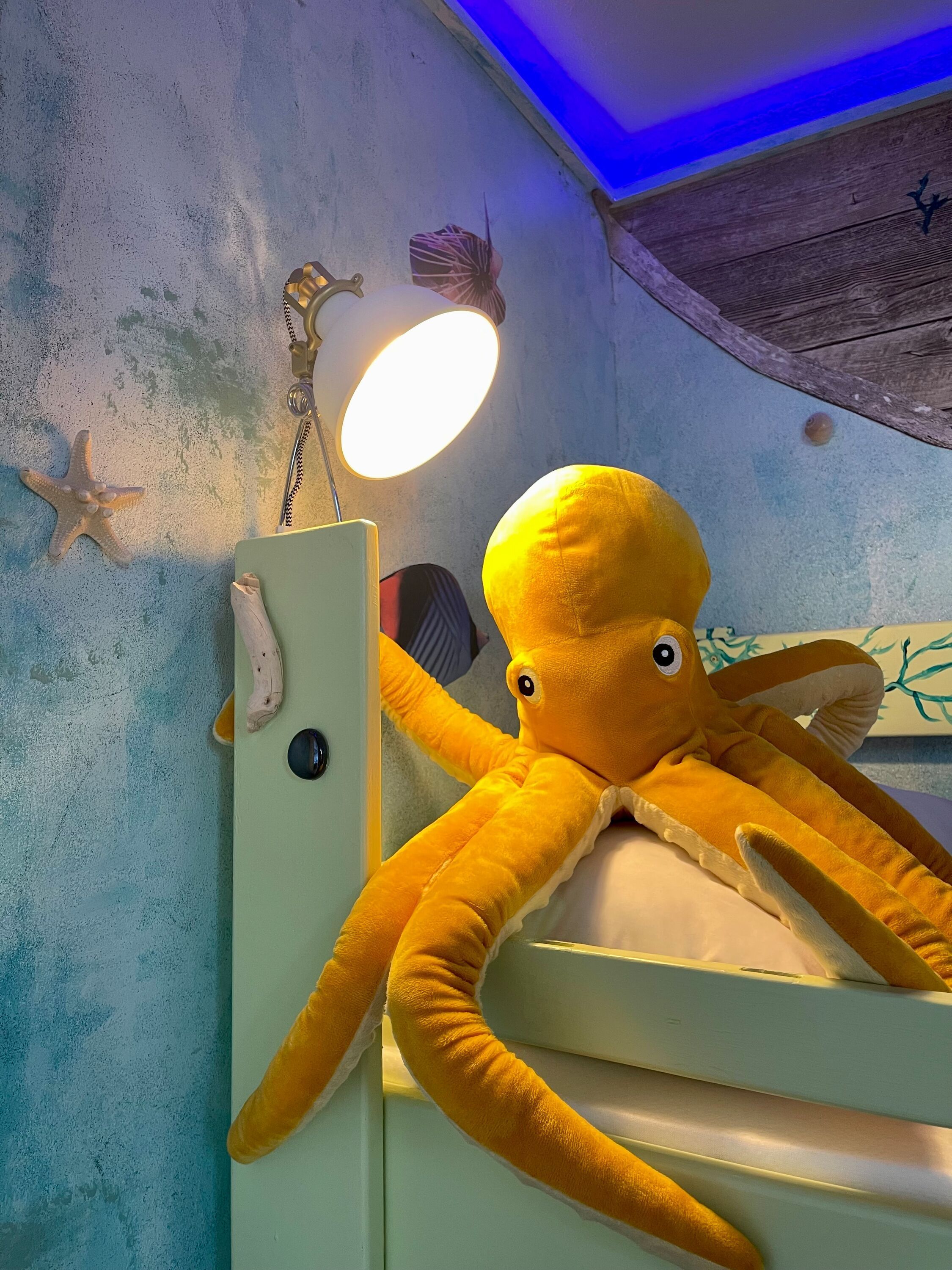 Elternschlafbereich auf Podest mit Doppelbett (180x200, durchgehende Matratze) - vom Bett aus direkter Meeresblick; sep. Kinderzimmer mit Doppelstockbett (80x170) in fantasievoll eingerichteter Meereslandschaft. Kinder werden es lieben. Schlafsofa ausgeklappt 160×200 Liegefläche.