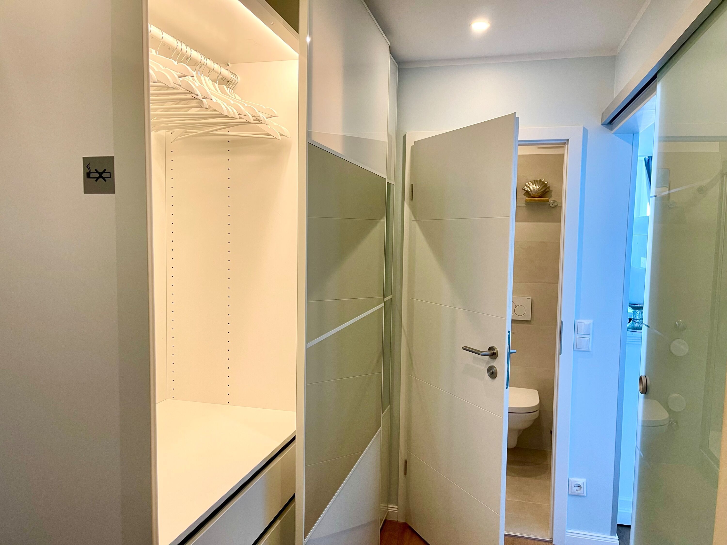 Im beleuchteten Kleiderschrank findest Du zusätzliches vieles für einen gelungenen Strandtag (Strandstuhl, Strandmuschel, Sonnenschirm, Sandspielzeug).