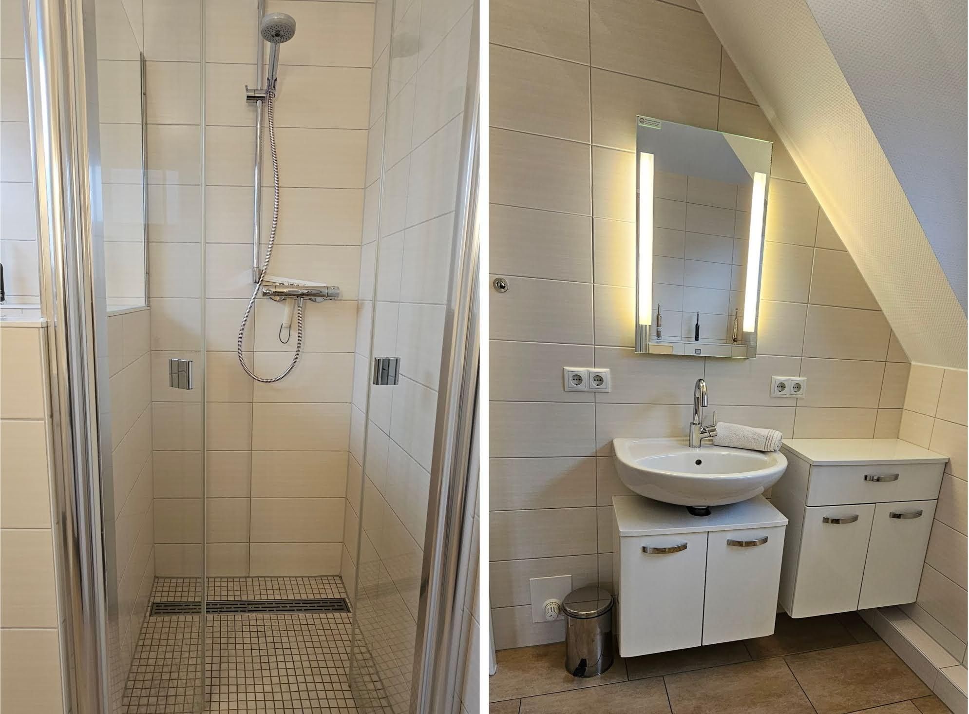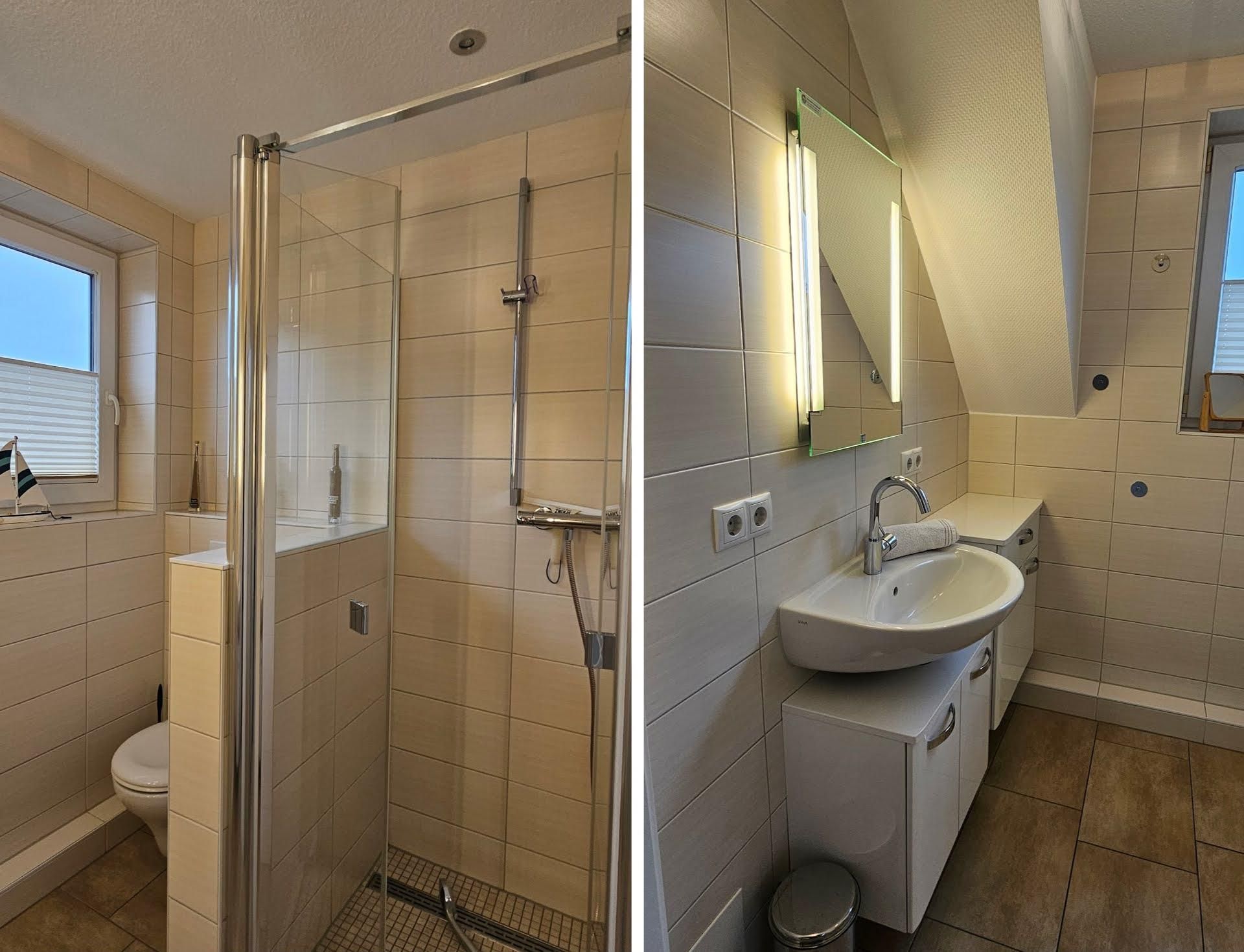 1 Badezimmer (Duschbad) mit nahezu bodengleicher >Dusche, WC und Handtuchwärmer.