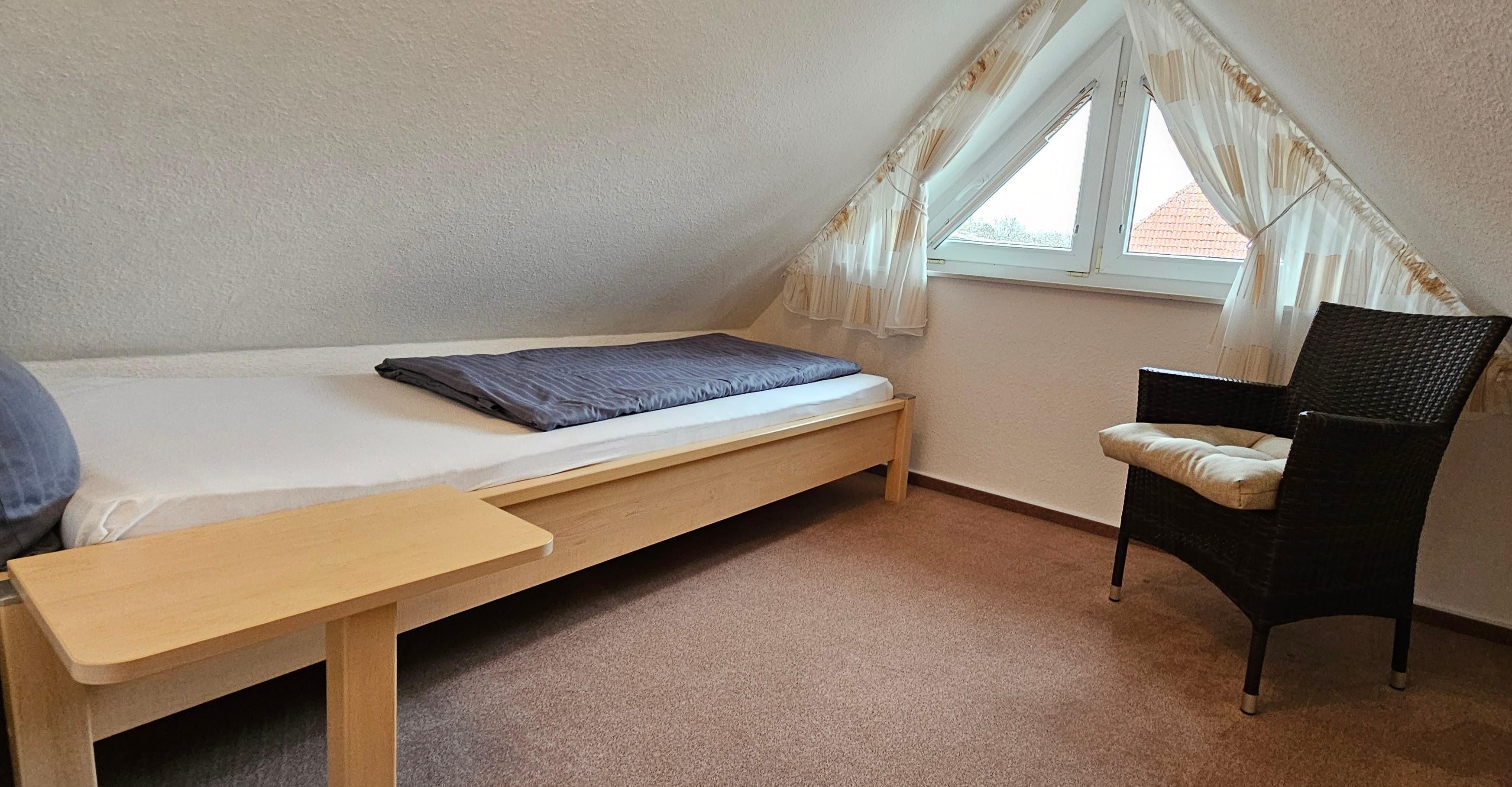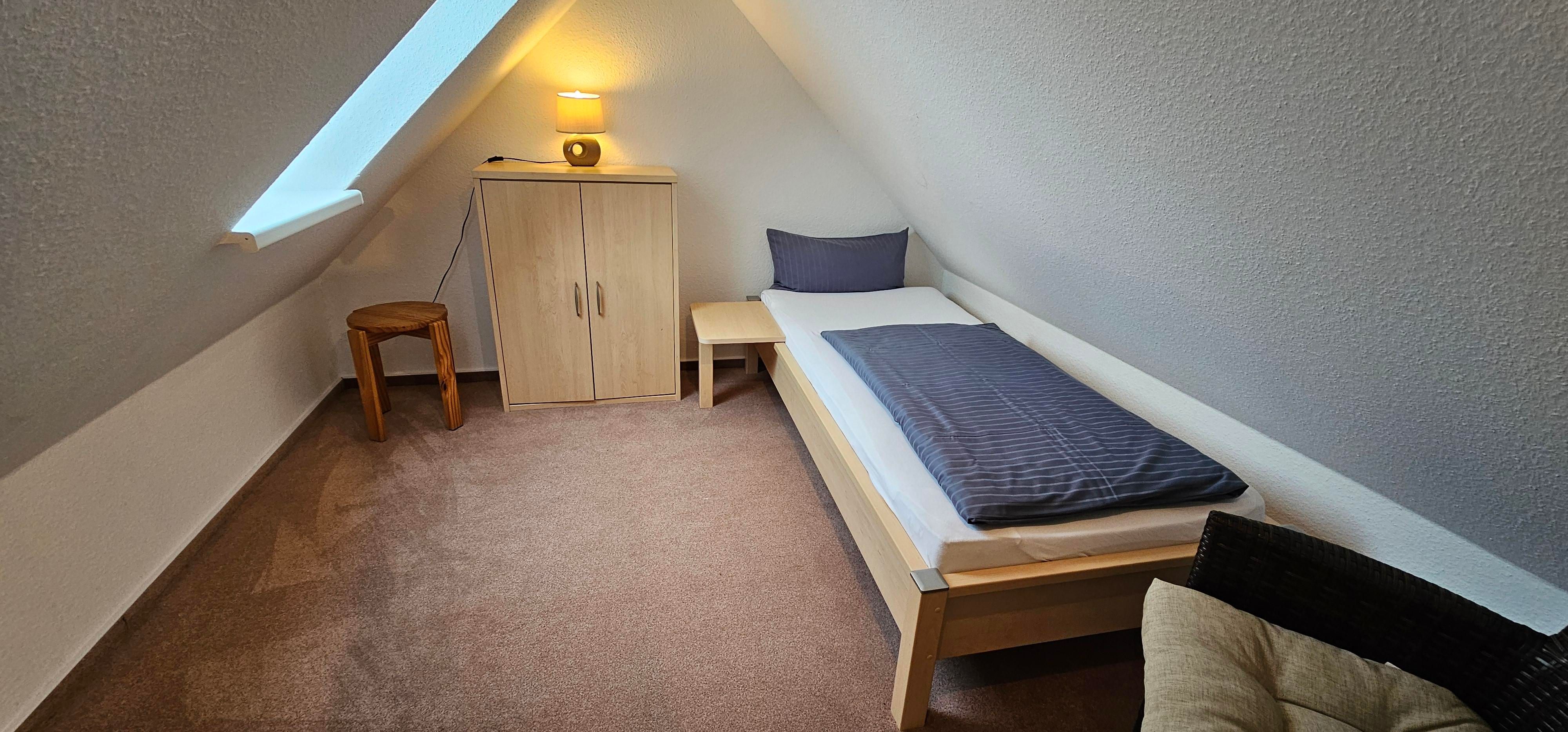 2 Schlafzimmer mit 2 Einzelbetten (je 90x200cm) und kommode. Zimmer eignet sich wegen der niedrigen Deckenhöhe nur für kinder. Zugang über enge schmale Treppe.