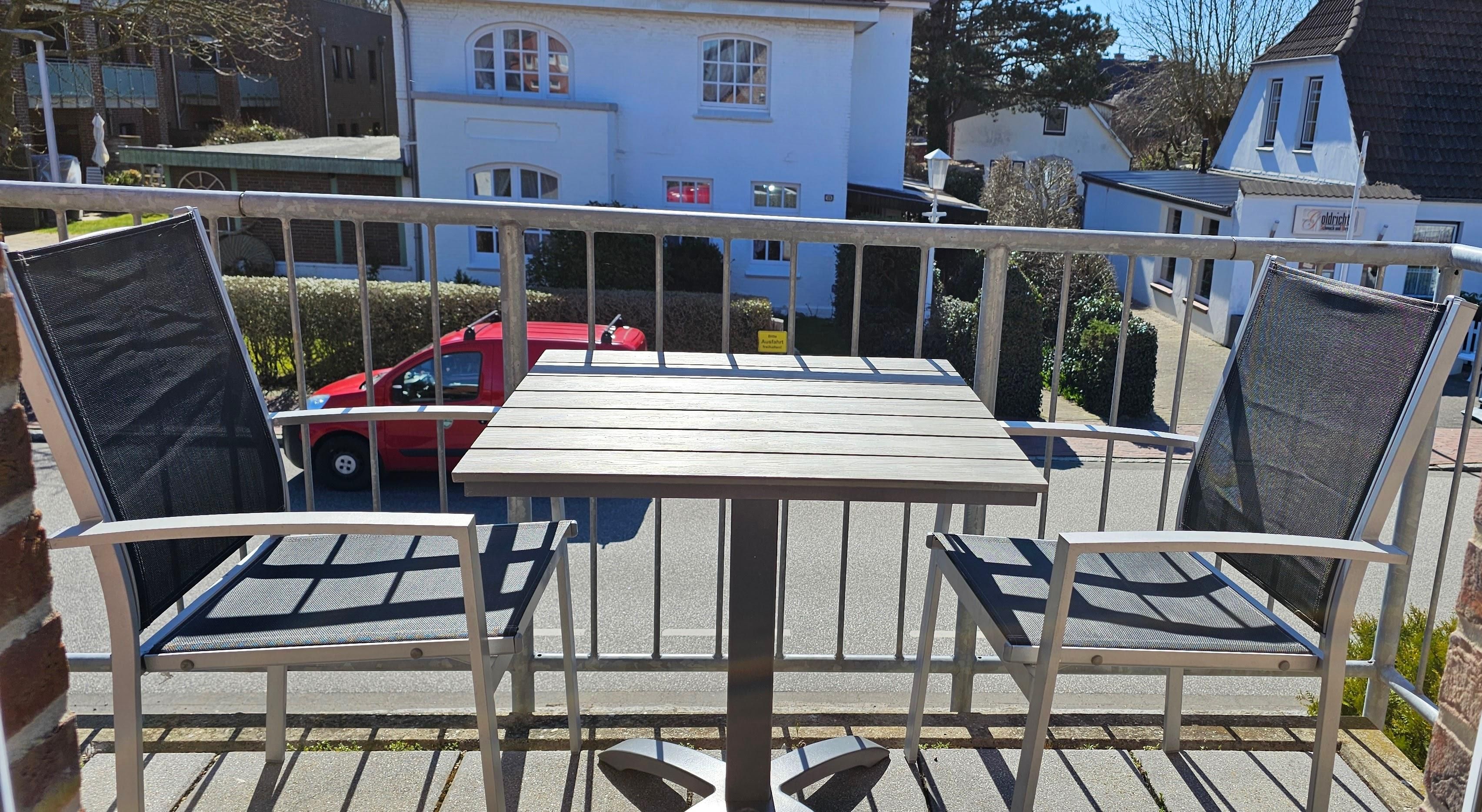 Zur Wohnung gehören ein Balkon und ein Sonnenfreisitz vor einem der Gartenhäuser.