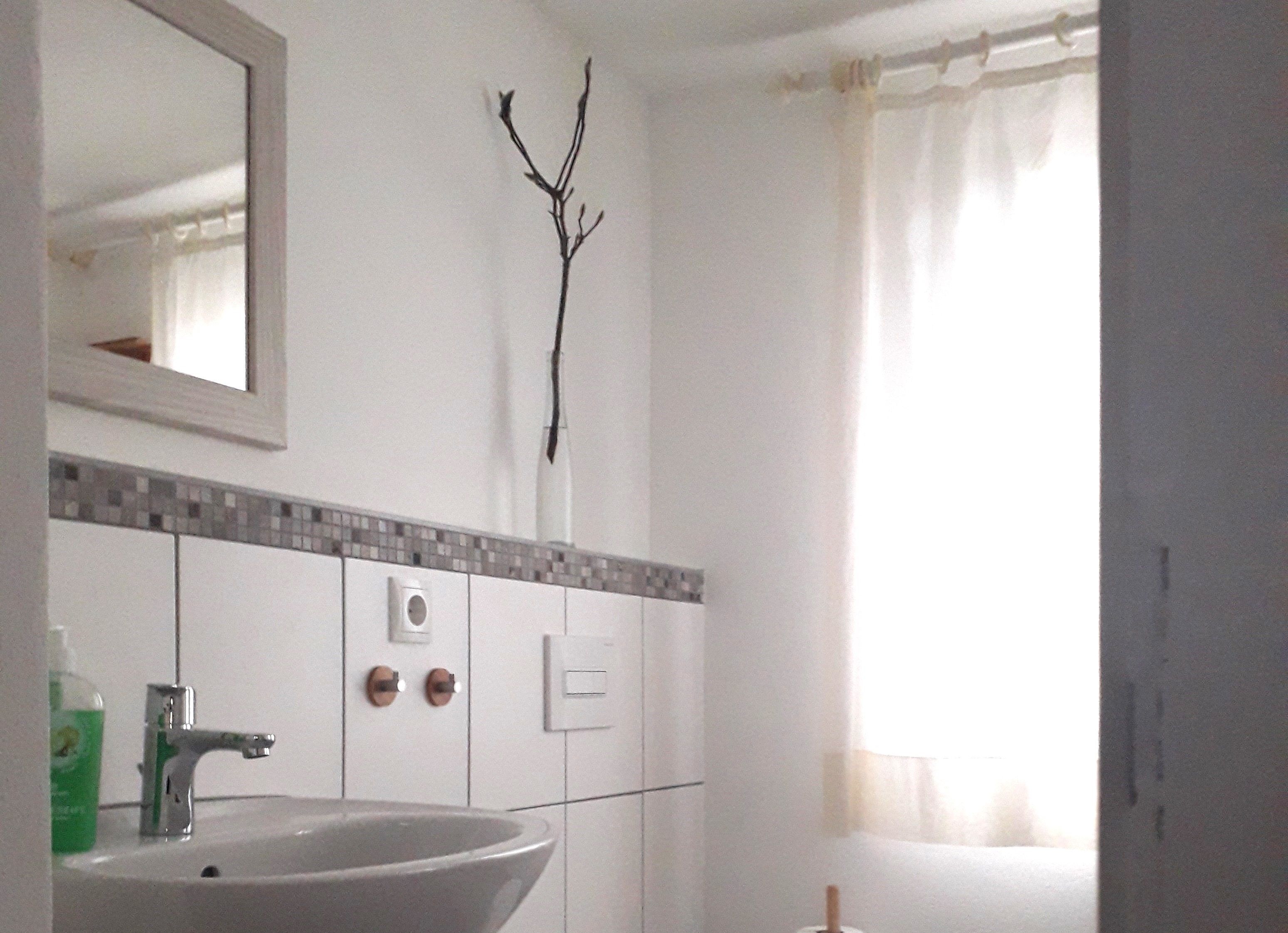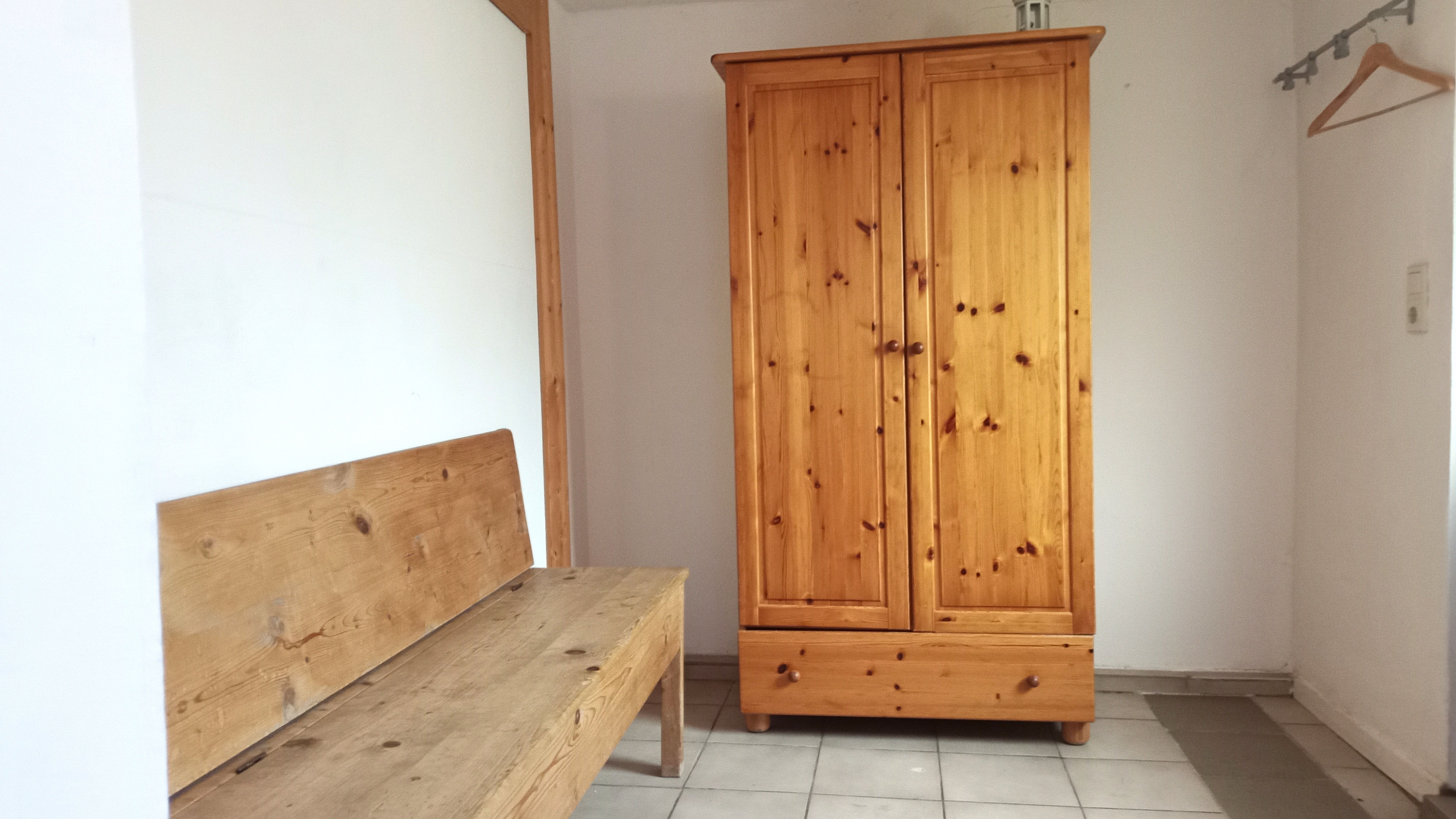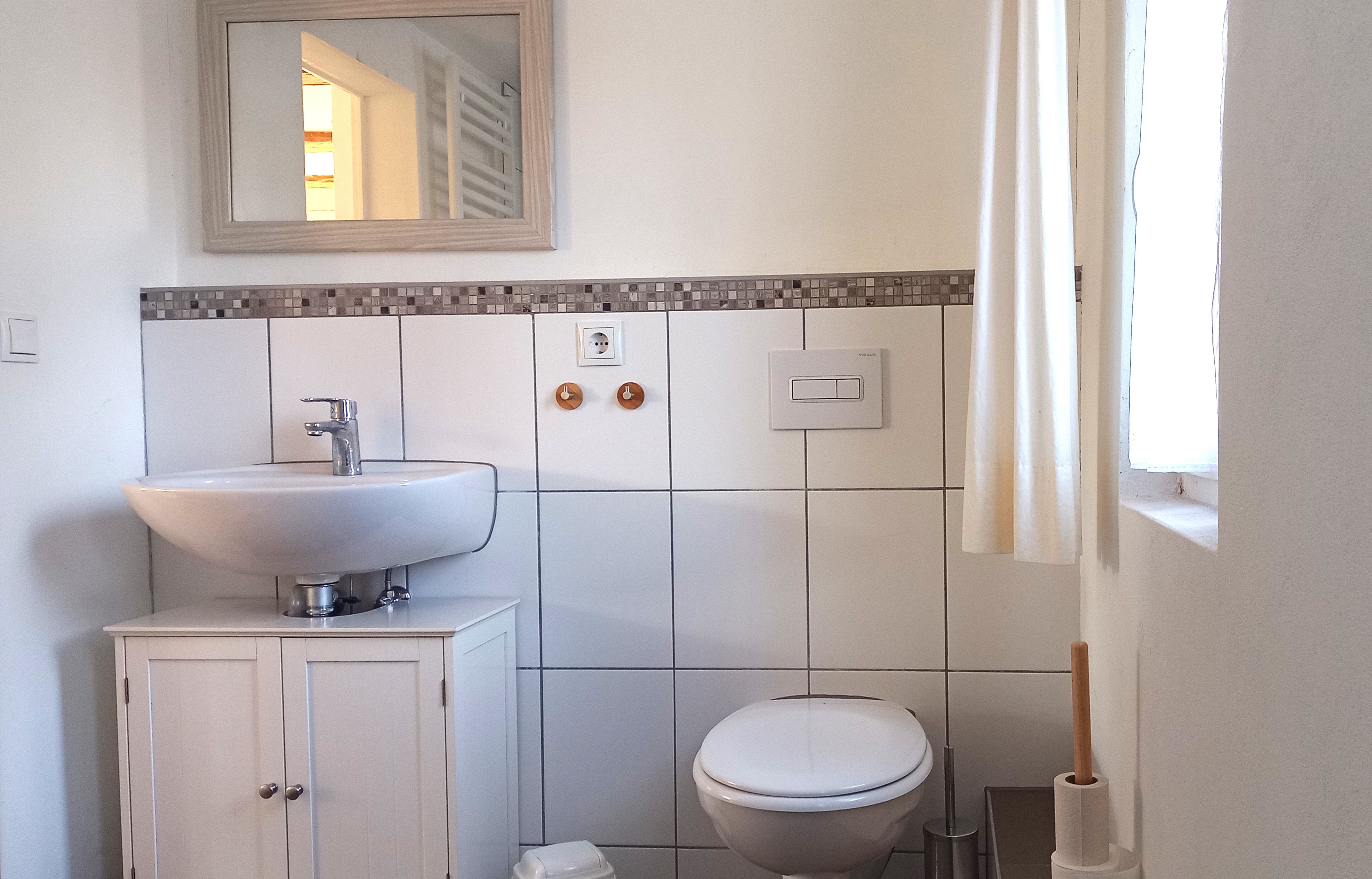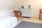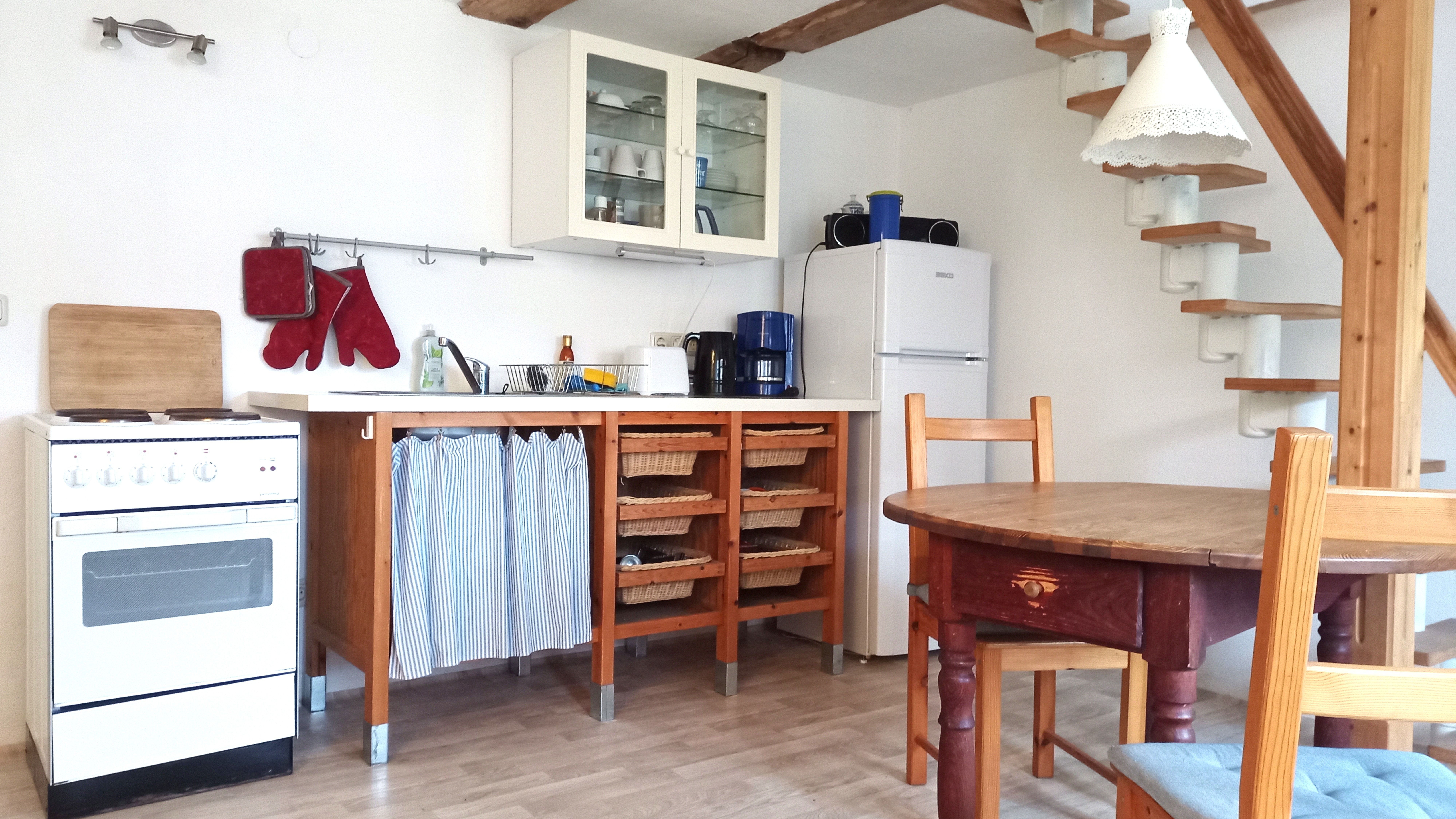 Die Ferienwohnung unter dem Reetdach des alten Hauses hat einen separaten Eingang und ist lichtdurchflutet und freundlich. Sie erstreckt sich über zwei Etagen. Die nach oben offene Wohnküche im Erdgeschoss verfügt über freiliegende Deckenbalken. Über eine steile Treppe gelangen Sie in das luftige Schlafzimmer im Obergeschoss, in dem sich ein Doppelbett und ein Einzelbett befinden. Sie eignet sich besonders gut für Paare. Für Ihre Fahrräder gibt es eine abschließbare Abstellmöglichkeit. Ein Parkplatz steht Ihnen ebenfalls zur Verfügung. Im Garten kann die Wäschespinne gern zum Trocknen der Handtücher genutzt werden.