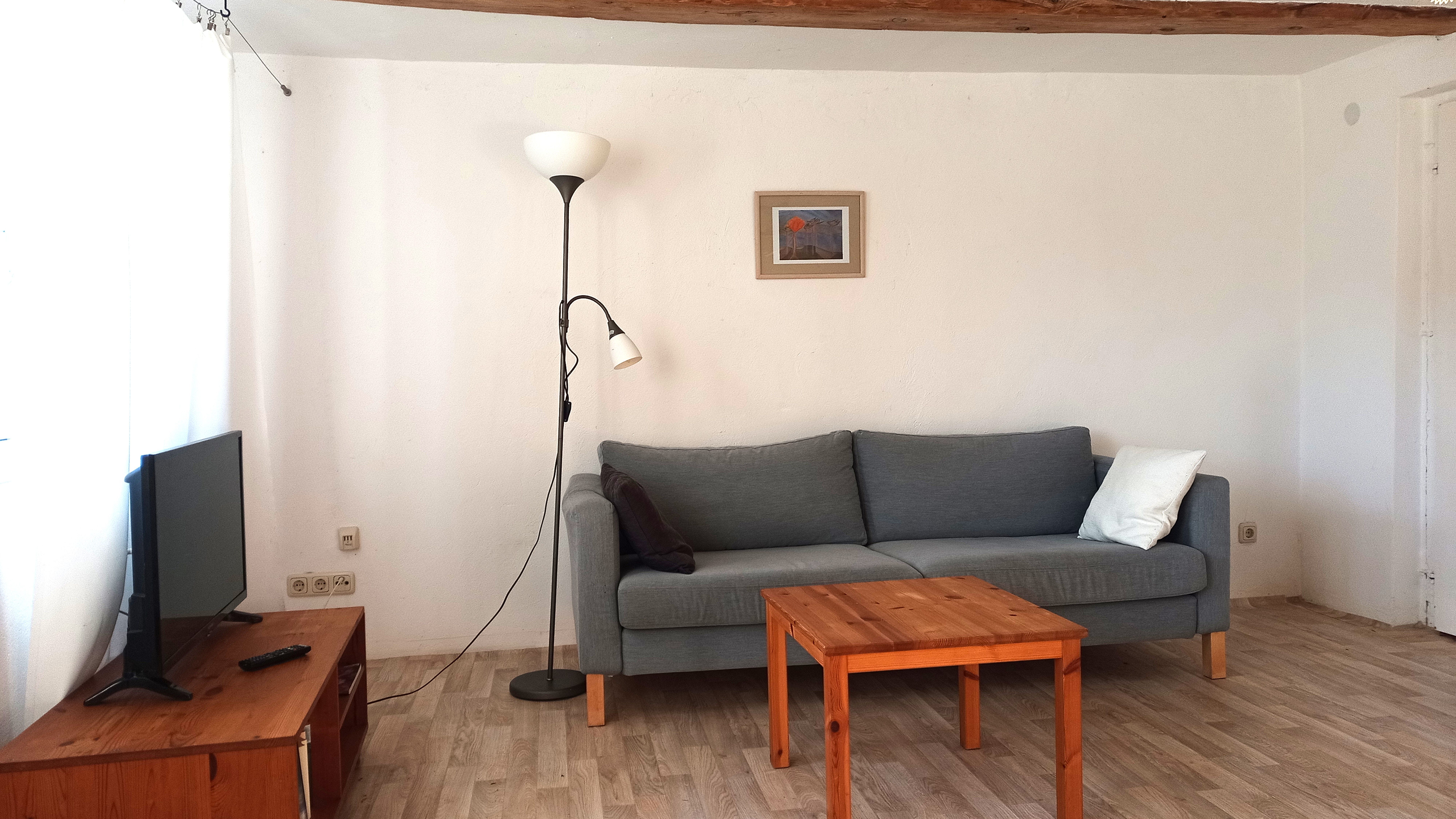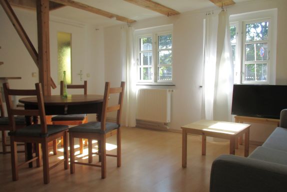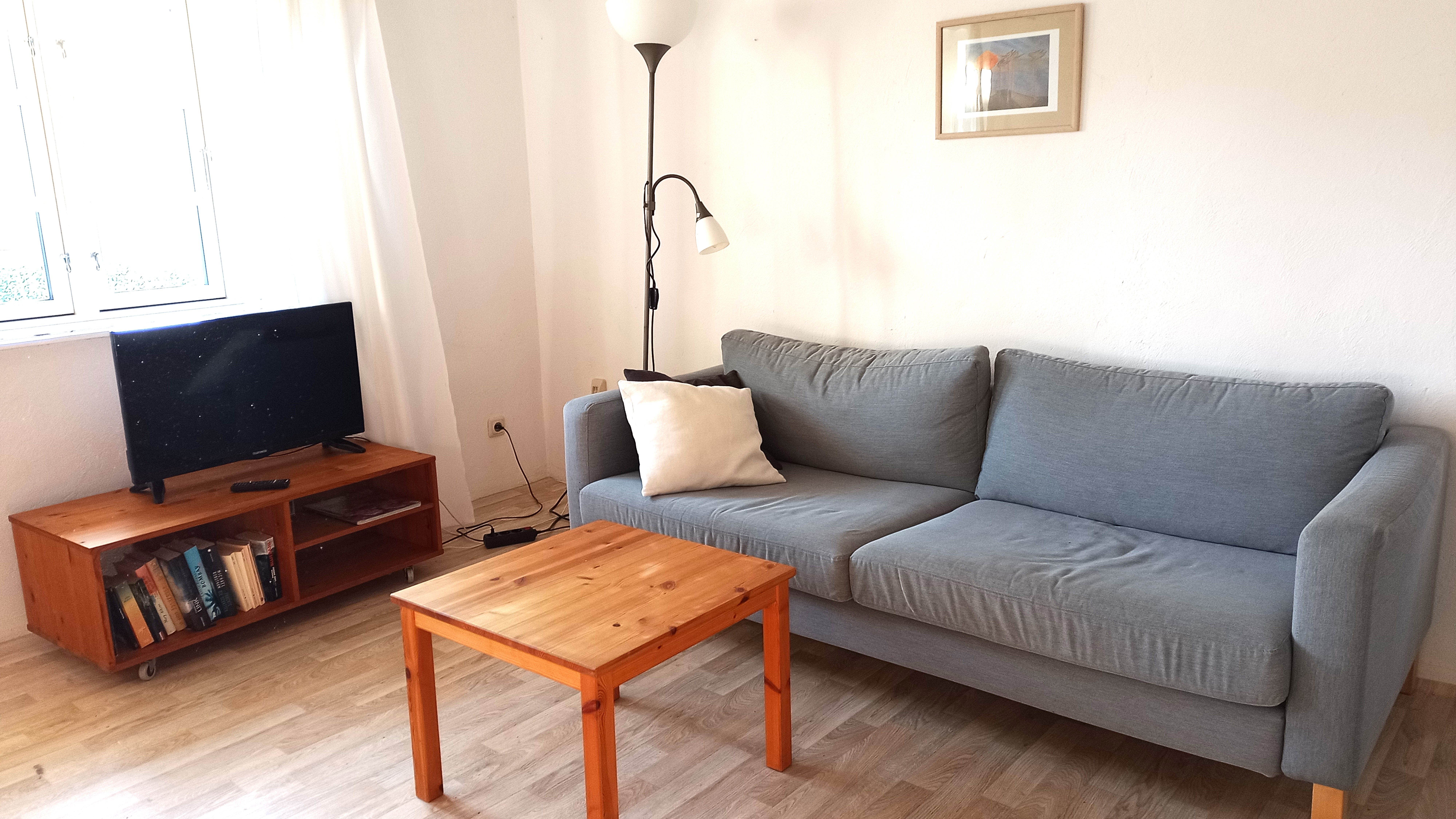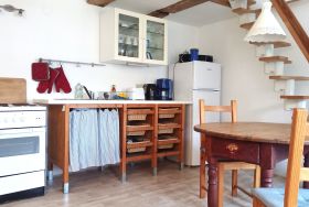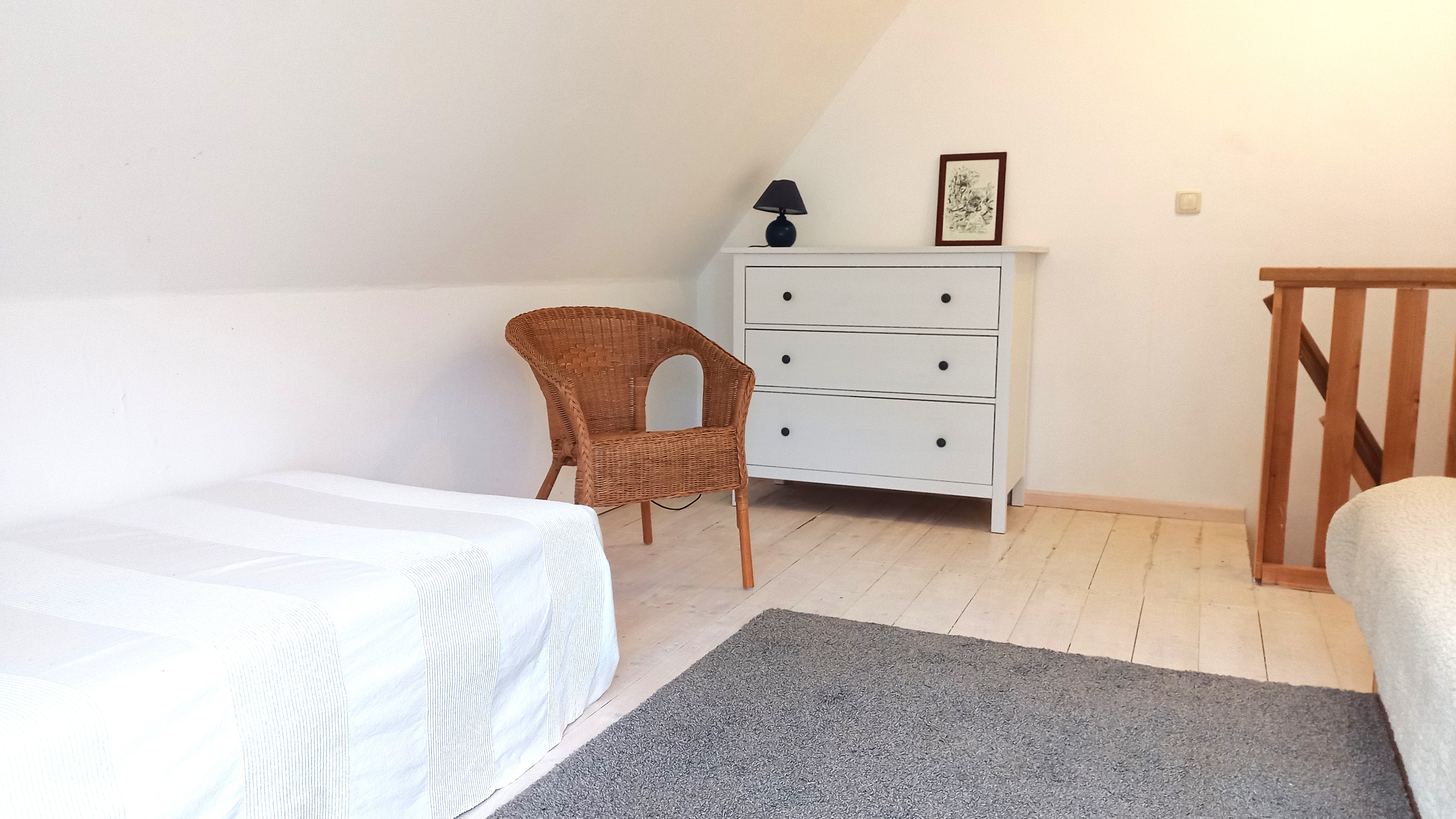 Die 56 qm große Ferienwohnung ist im skandinavischen Landhausstil gehalten, der die gemütliche, natürliche Ausstrahlung eines Landhauses mit der klaren, minimalistischen Ästhetik des skandinavischen Designs kombiniert. Helle Farben und einfache, funktionale Möbel schaffen eine ruhige, freundliche Atmosphäre. Die Deckenhöhe ist niedrig. Wohnküche und Sitzecke im Garten haben Morgenlicht. Im kombinierten Wohn-/Essbereich befinden sich Sofa, Couchtisch und Flachbild-TV, die Küche ist mit 4-Platten-Herd, Backofen, Kühlschrank mit Gefrierfach, Kaffeemaschine, Toaster und Wasserkocher ausgestattet. Das Badezimmer verfügt über Tageslicht und ist mit ebenerdiger Dusche und WC ausgestattet. Das luftige Schlafzimmer im Obergeschoss erreichen Sie über eine steile Raumspartreppe. Es ist mit einen Doppelbett von einer Größe von 2,00 x 2,00 m und einem Einzelbett ausgestattet. Die Bettwäsche ist im Preis inbegriffen, Handtücher sind mitzubringen.