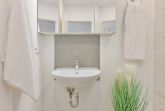 Das barrierearme, moderne Duschbad direkt neben dem Schlafzimmer sorgt für weitere Bequemlichkeit. Die ebenerdige Dusche, WC, Waschbecken und beleuchteter Spiegel runden den Raum ab.