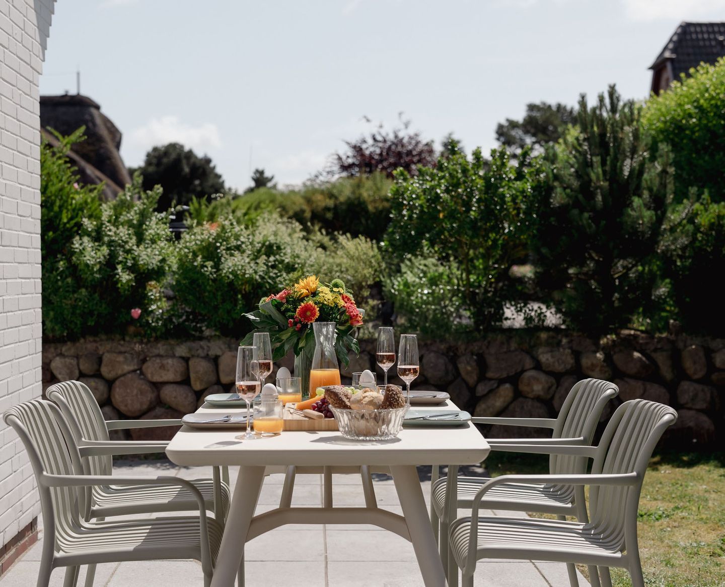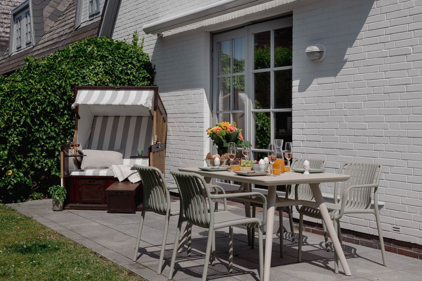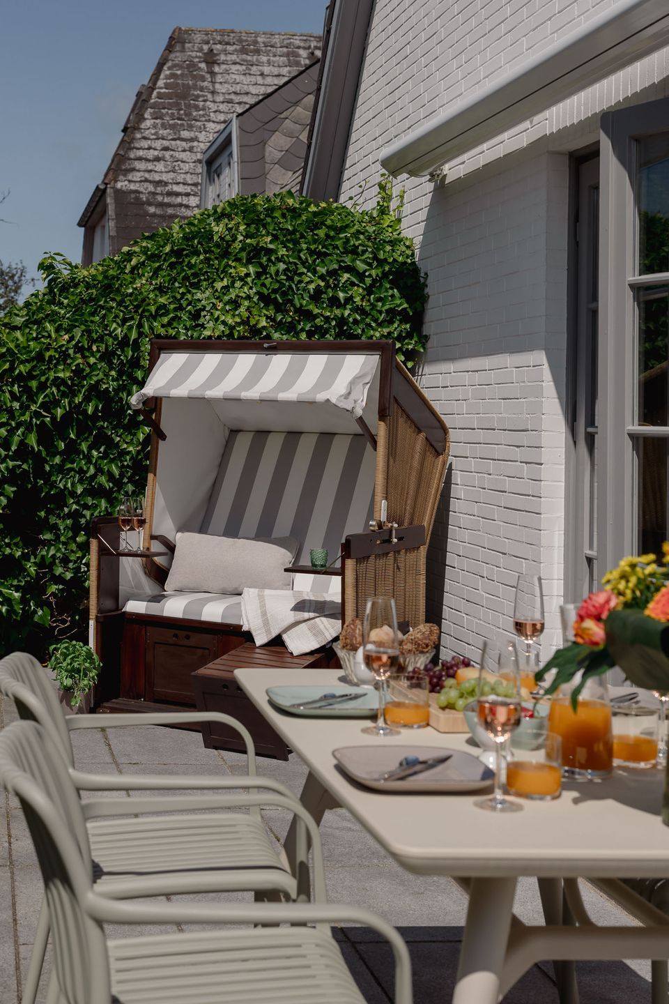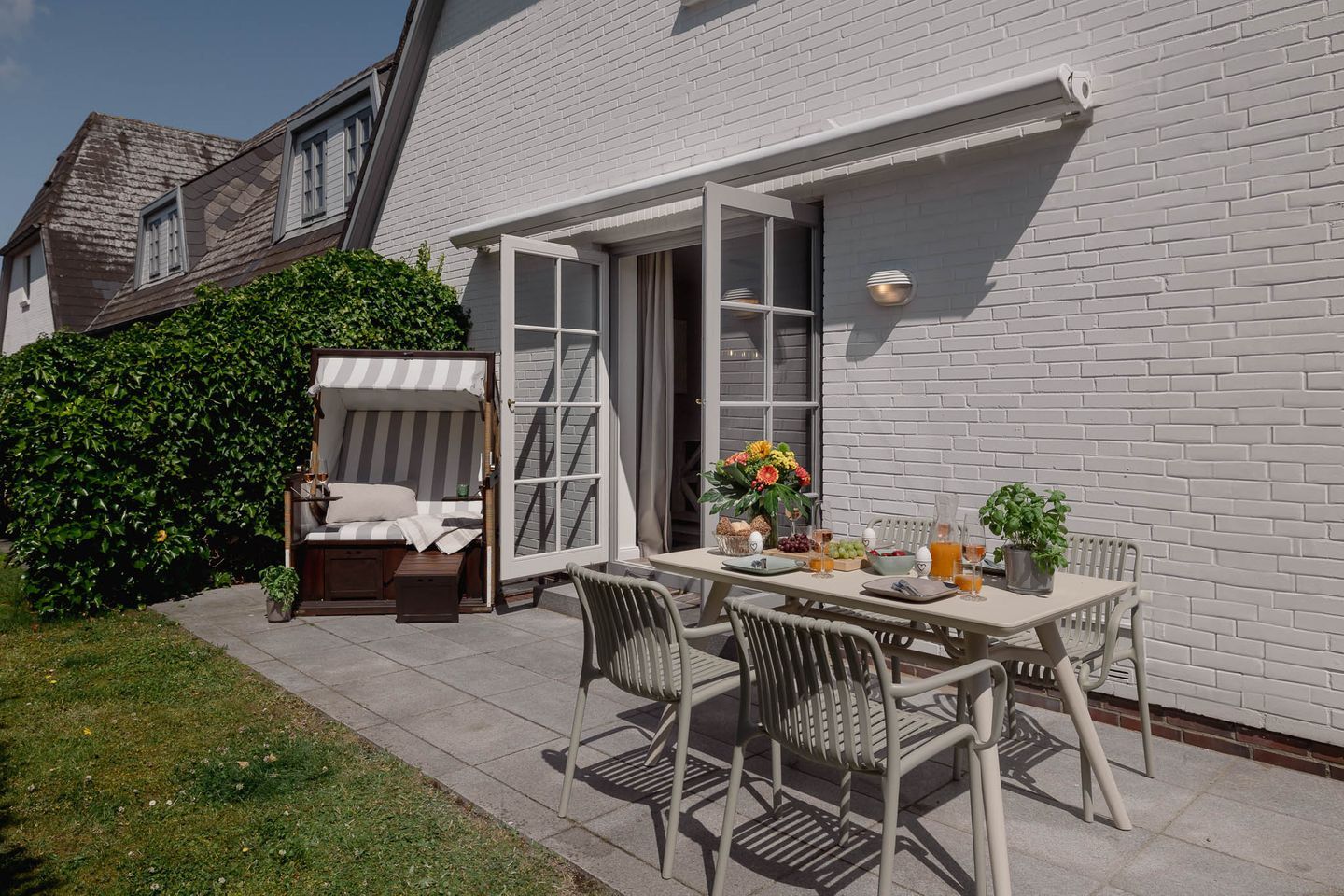 Genießen Sie die sonnigen Stunden auf der südwestlich ausgerichteten Terrasse, die mit eleganten Granitplatten, einem gemütlichen Strandkorb (saisonal), einer elektrischen Markise sowie einem modernen Tisch und vier bequemen Stühlen ausgestattet ist. Der angrenzende Garten bietet ausreichend Platz für entspannte Stunden im Grünen – auch für Ihren vierbeinigen Freund, denn im Baileys Hüs sind Hunde herzlich willkommen! Für sie gibt es sogar einen speziellen Hundeleineparkplatz.