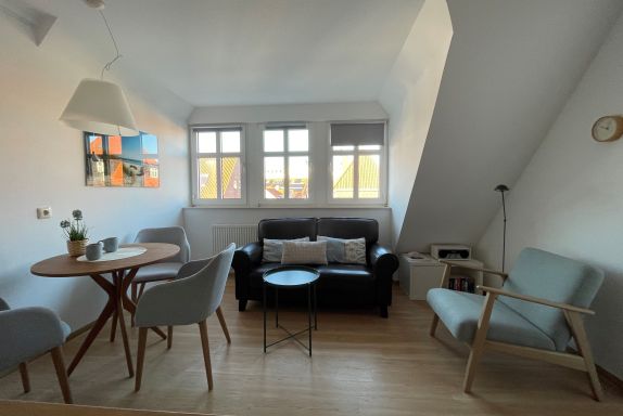 Entzückende 2-Zimmer-Ferienwohnung für 2-3 Personen in bester Lage auf Juist zur Nordseite gelegen. Modern eingerichtet bleiben hier keine Wünsche offen. Der Wohnbereich, bestehend aus einer gemütlichen Sitzecke mit Sofa und Sessel sowie einem Essplatz mit vier Stühlen, garantiert Erholung. In dem durch eine Schrankwand optisch getrenntem Schlafbereich befindet sich ein Doppelbett. Der Fernseher mit SAT-TV kann selbstverständlich gedreht werden, sodass sowohl vom Wohn- als auch vom Schlafbereich Fernsehen gesehen werden kann.