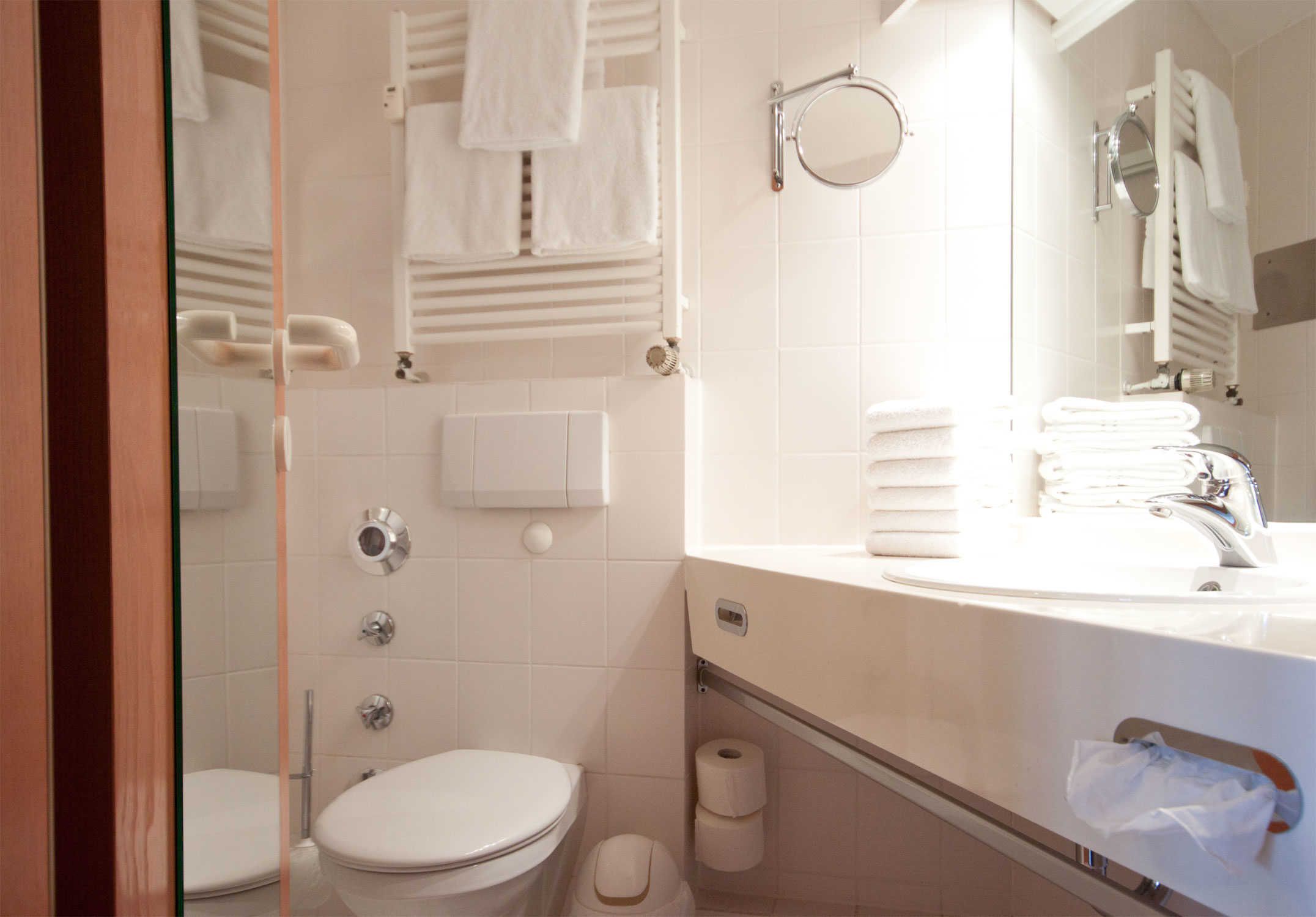 In dem Duschbad befindet sich neben einer Toilette und Dusche auch ein großzügiger Waschtisch.