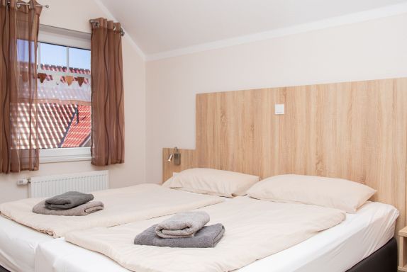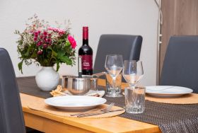 Zwei mit 4 Sternen des Deutschen Tourismusverbandes ausgezeichnete Doppelhaushälften für je 4 Personen, mit einer Wohnfläche von ca. 60 qm. Das ansprechend eingerichtete Wohnzimmer sowie die voll ausgestattete Küche befinden sich im Erdgeschoss. Von den zwei barrierefreien Bädern liegt das eine im Ober- und das andere im Untergeschoss. Die zwei Schlafzimmer (eines mit Doppelbett, das andere mit zwei getrennten Betten sind im Obergeschoss untergebracht. n Bad, Küche, Wohnzimmer und Flur ist Fußbodenerwärmung vorhanden. Alle Räumlichkeiten sind mit Raumbe- und -entlüftung (ideal für Allergiker) sowie elektrischen Jalousien ausgestattet. Zur weiteren Ausstattung des Ferienhauses gehören Kaffeemaschine, Toaster, Wasserkocher, Eierkocher, Föhn, Geschirr, Geschirrspülmaschine, Waschmaschine, Trockner, Bügeleisen und Bügelbrett, Gartenmöbel und Grill, Internetzugang.