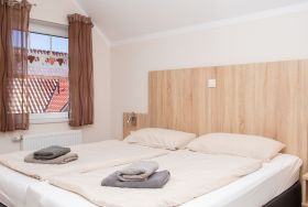 Zwei mit 4 Sternen des Deutschen Tourismusverbandes ausgezeichnete Doppelhaushälften für je 4 Personen, mit einer Wohnfläche von ca. 60 qm. Das ansprechend eingerichtete Wohnzimmer sowie die voll ausgestattete Küche befinden sich im Erdgeschoss. Von den zwei barrierefreien Bädern liegt das eine im Ober- und das andere im Untergeschoss. Die zwei Schlafzimmer (eines mit Doppelbett, das andere mit zwei getrennten Betten sind im Obergeschoss untergebracht. n Bad, Küche, Wohnzimmer und Flur ist Fußbodenerwärmung vorhanden. Alle Räumlichkeiten sind mit Raumbe- und -entlüftung (ideal für Allergiker) sowie elektrischen Jalousien ausgestattet. Zur weiteren Ausstattung des Ferienhauses gehören Kaffeemaschine, Toaster, Wasserkocher, Eierkocher, Föhn, Geschirr, Geschirrspülmaschine, Waschmaschine, Trockner, Bügeleisen und Bügelbrett, Gartenmöbel und Grill, Internetzugang.