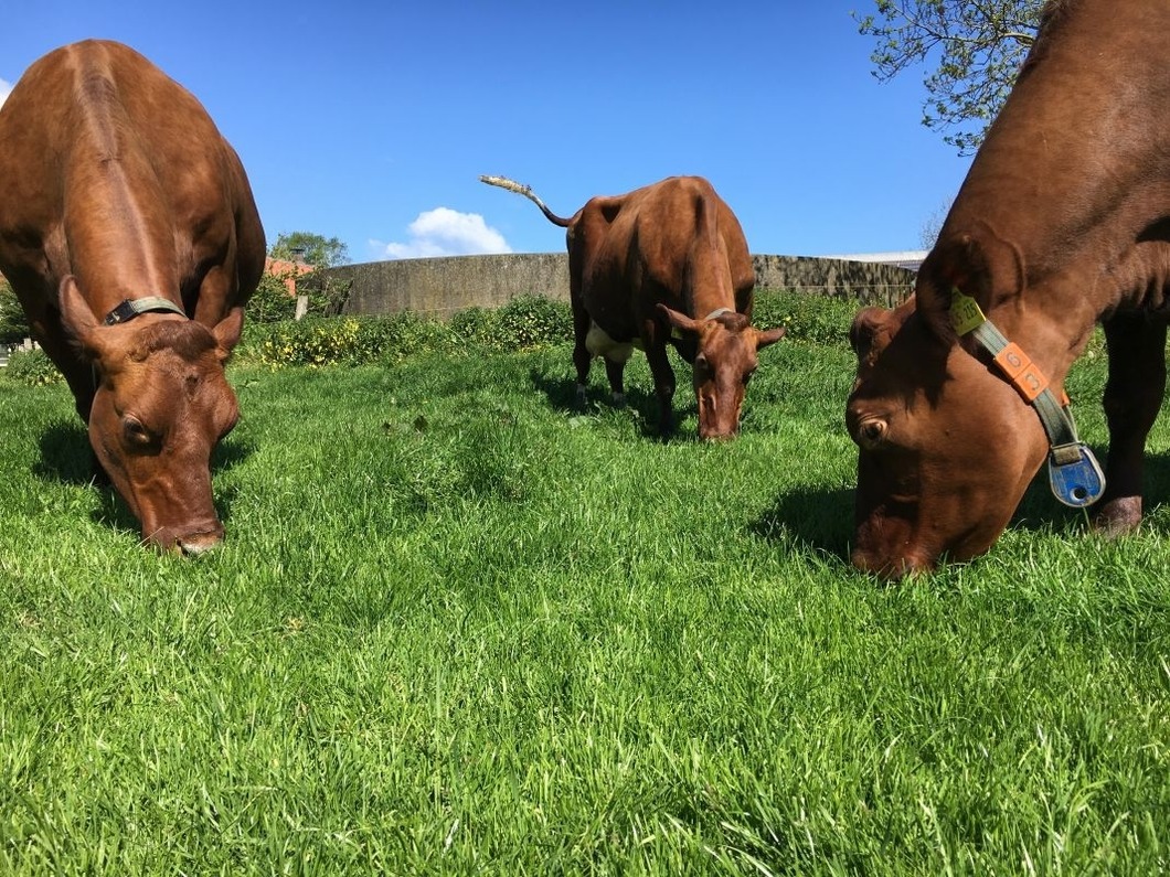 Auf unserem Bauernhof leben Kühe, Kaninchen, Ponys, Katzen und Hühner.