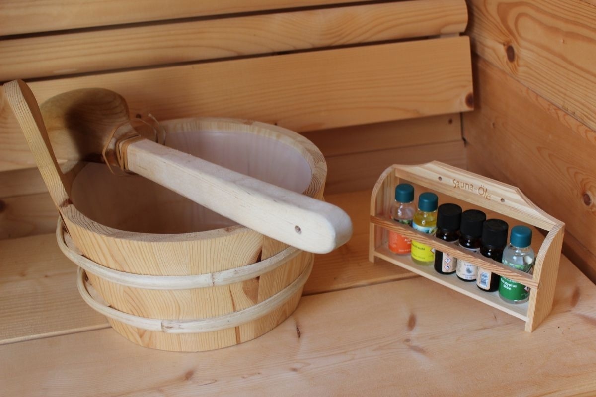 -Fasssauna mit Ruhebereich im Saunagarten