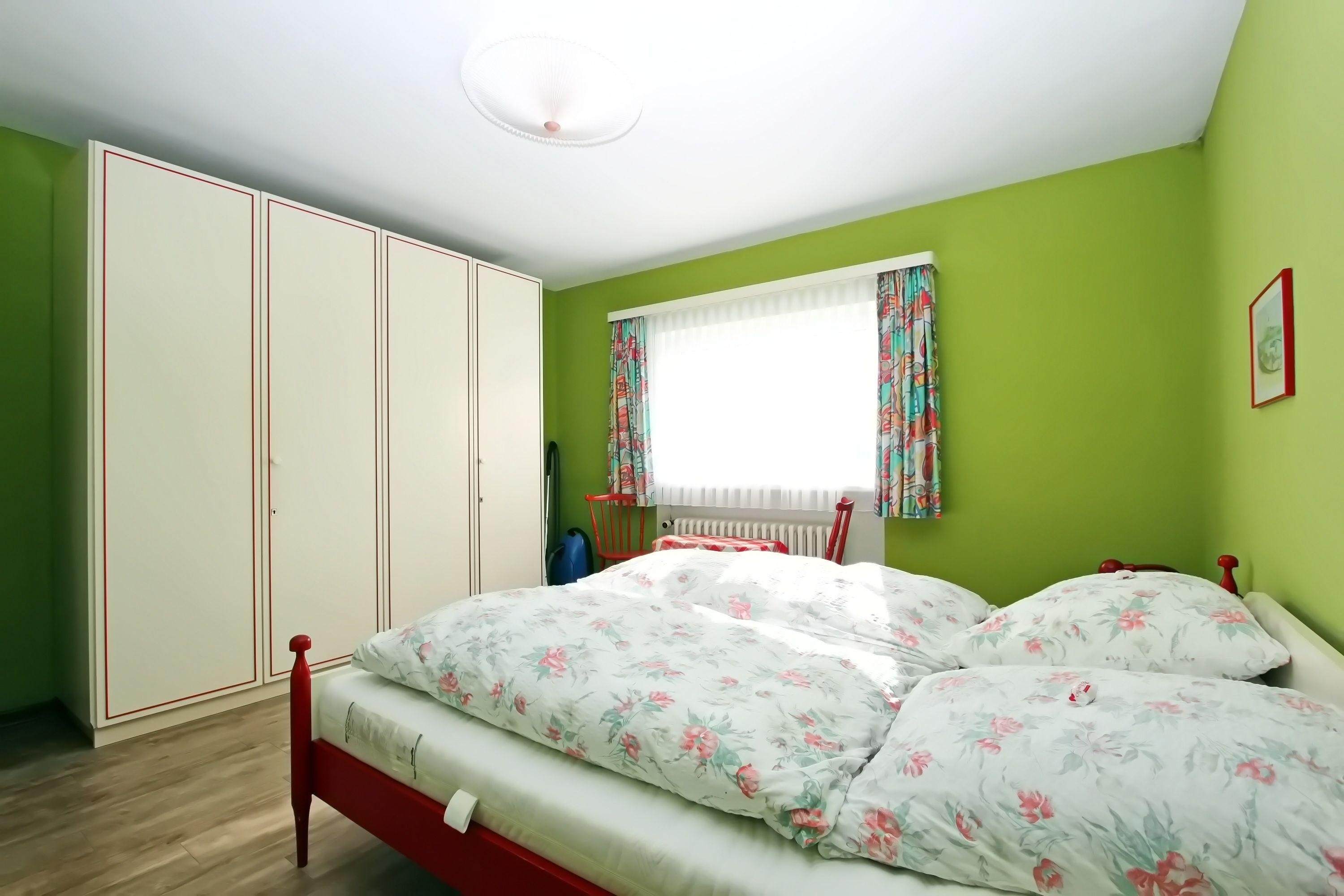 Zwei lichtdurchflutete Schlafzimmer: das Erste mit einem Doppelbett, das Zweite mit einem Doppelbett sowie einem Einzelbett. Beide Zimmer bieten durch maß angefertigte Einbauschränke viel