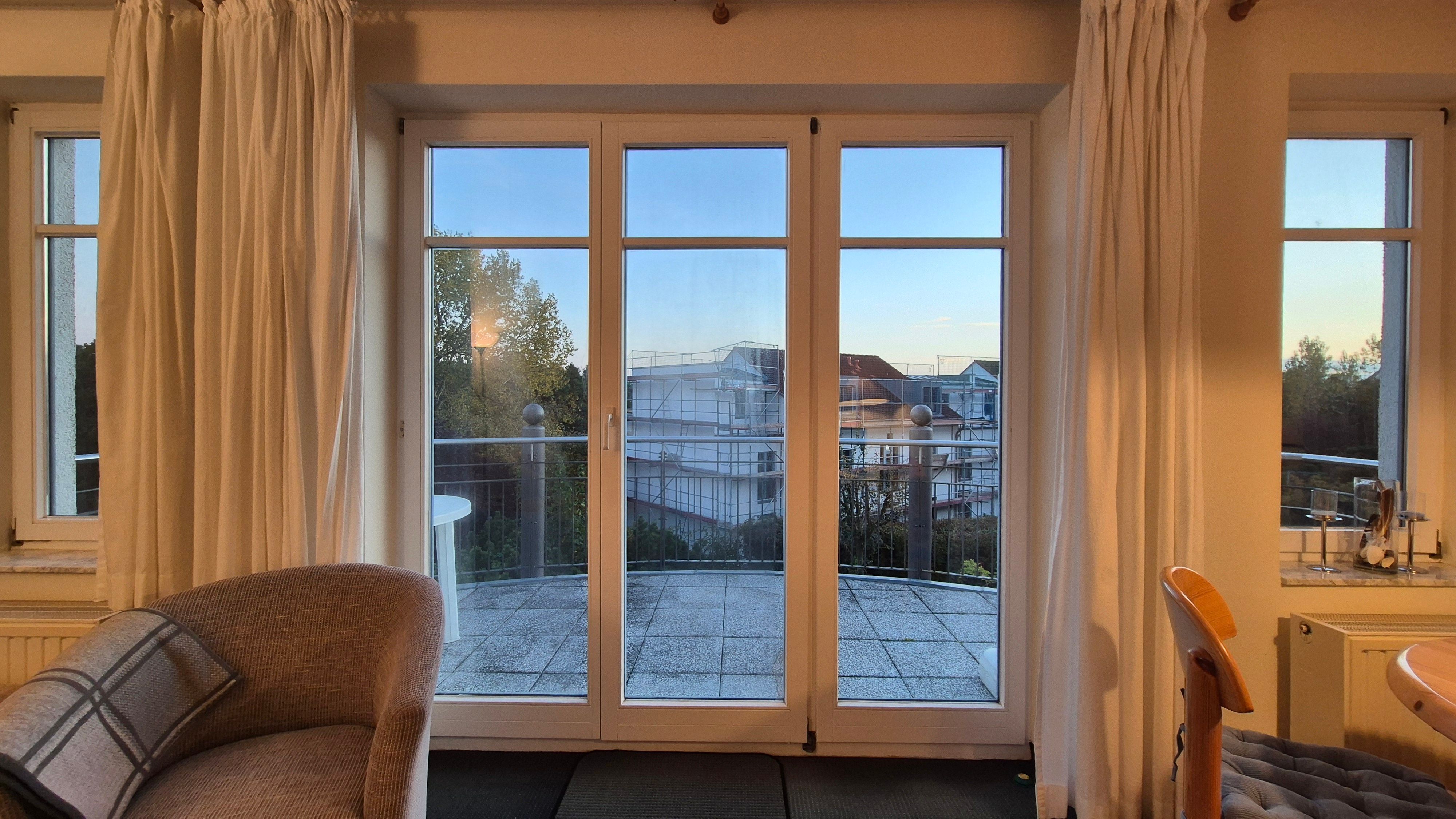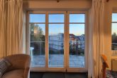 • Vom Wohnzimmer gelangen Sie auf den Balkon der nach Südwesten ausgerichtet ist. Dort befindet sich ein Tisch mit vier Stühlen und einem Sonnenschirm.