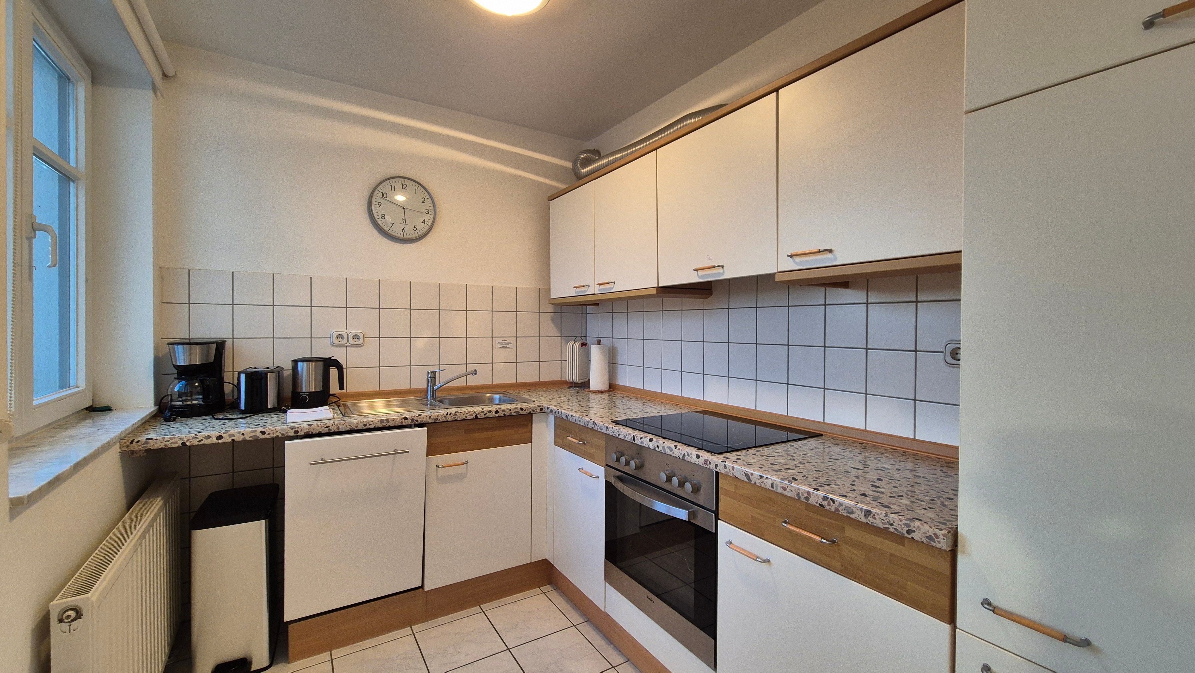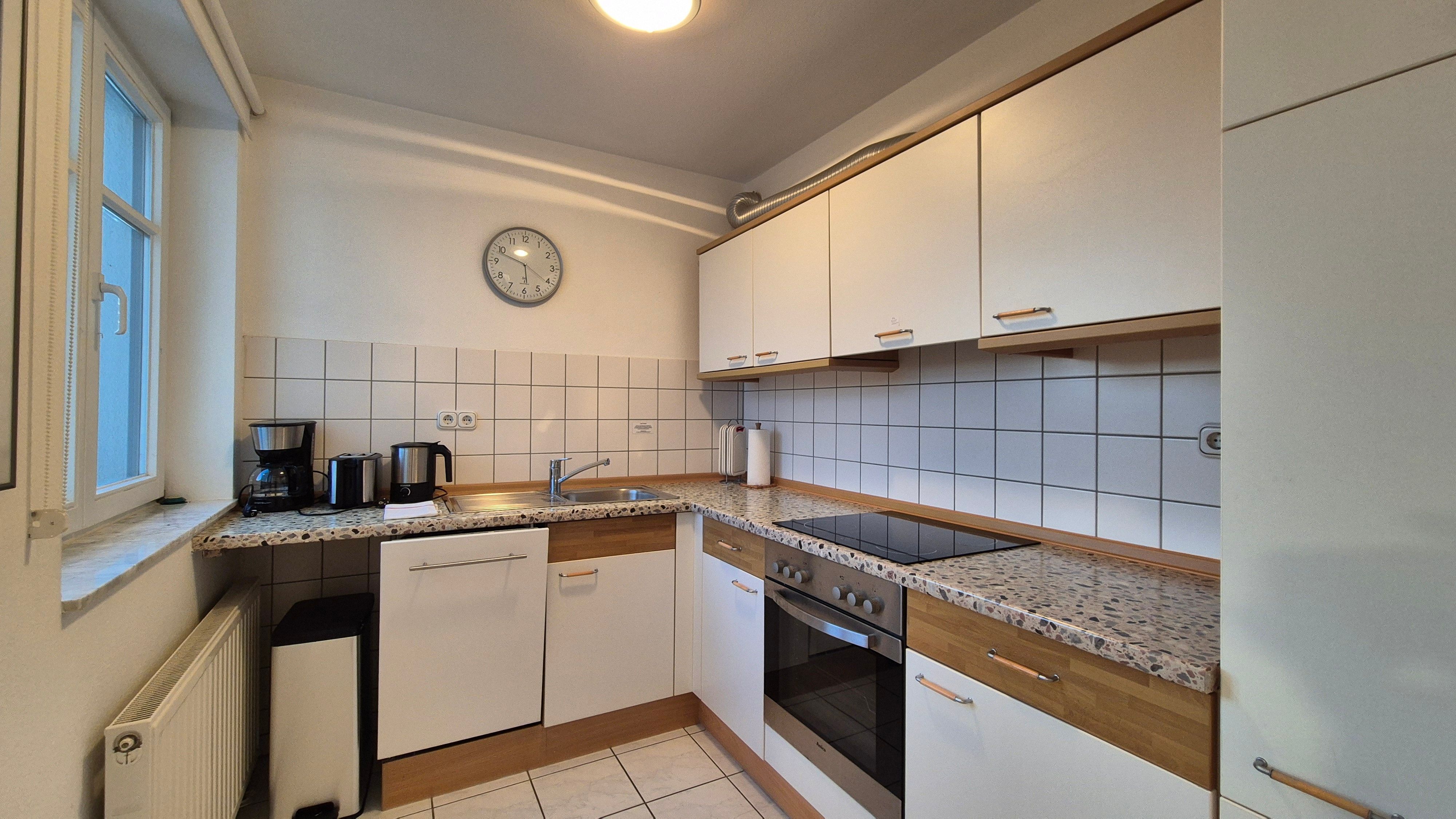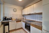 • Die zum Wohnzimmer offene Einbauküche ist mit allem Notwendigem (Herd, Backofen, Spülmaschine, Wasserkocher, Kaffeemaschine, Toaster und einem Kühlschrank mit Gefrierfach) ausgestattet.