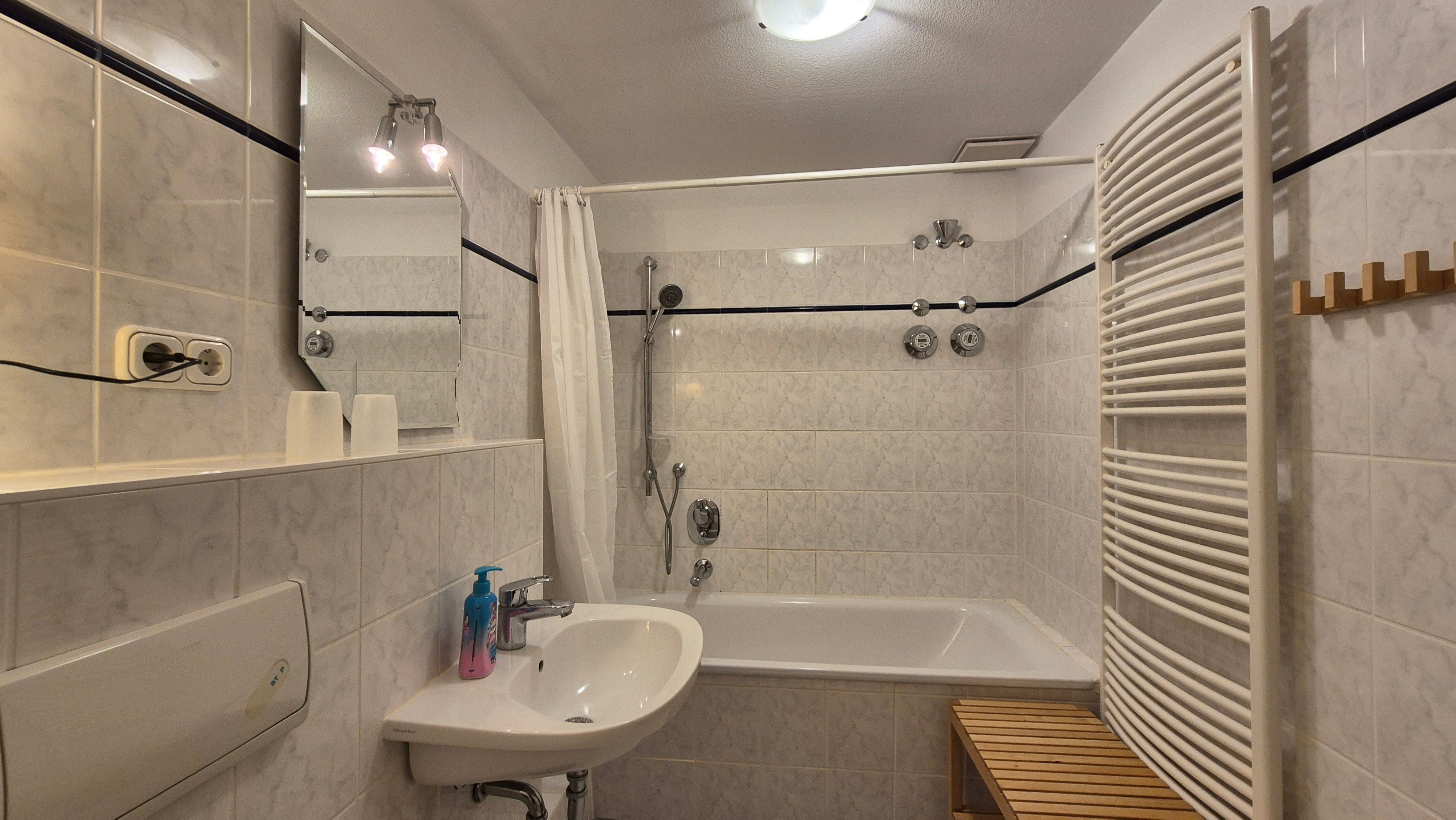 • Bad mit Badewanne und Duschabtrennung, WC, Waschbecken und ein Handtuchtrockenheizkörper.