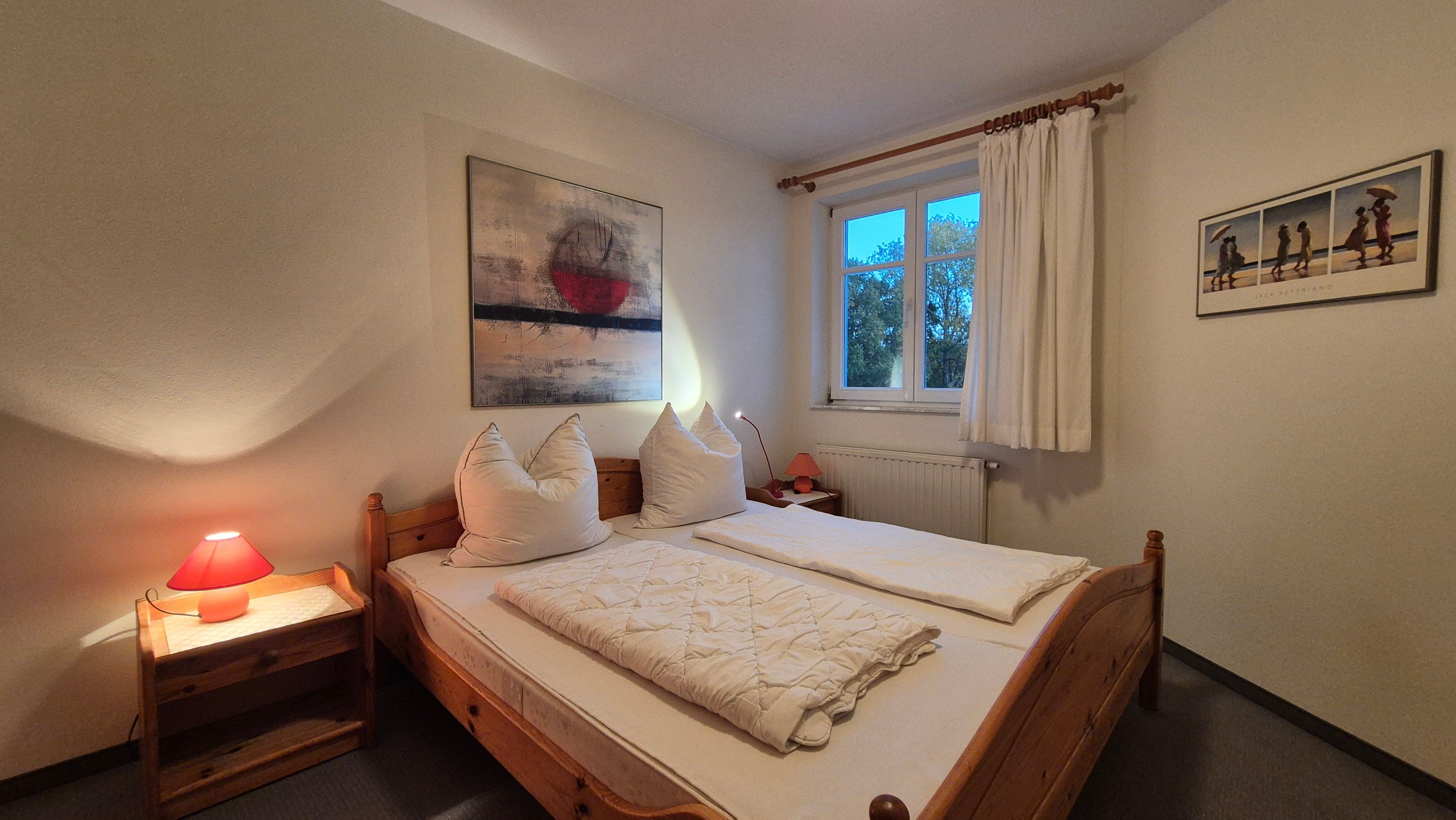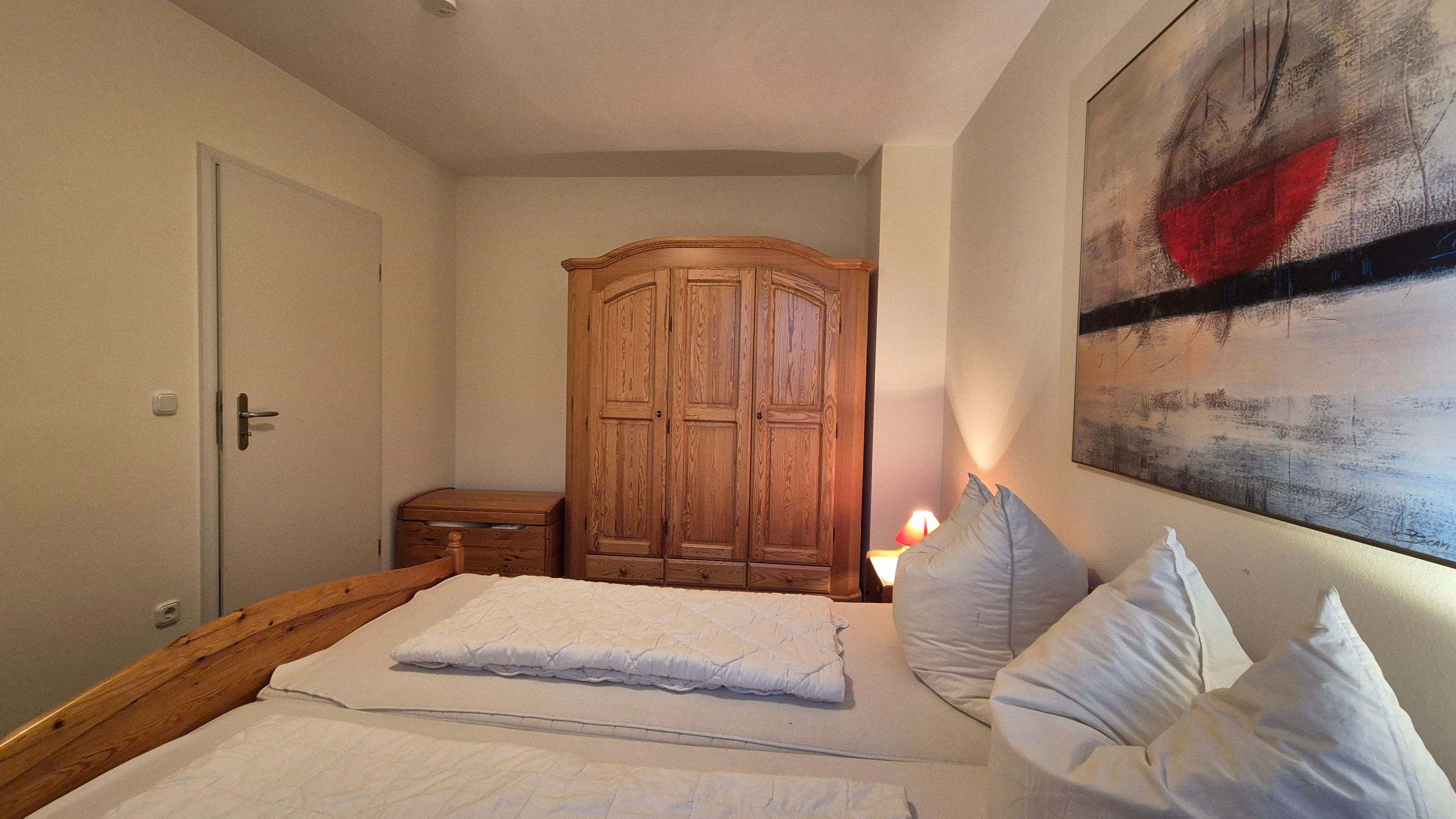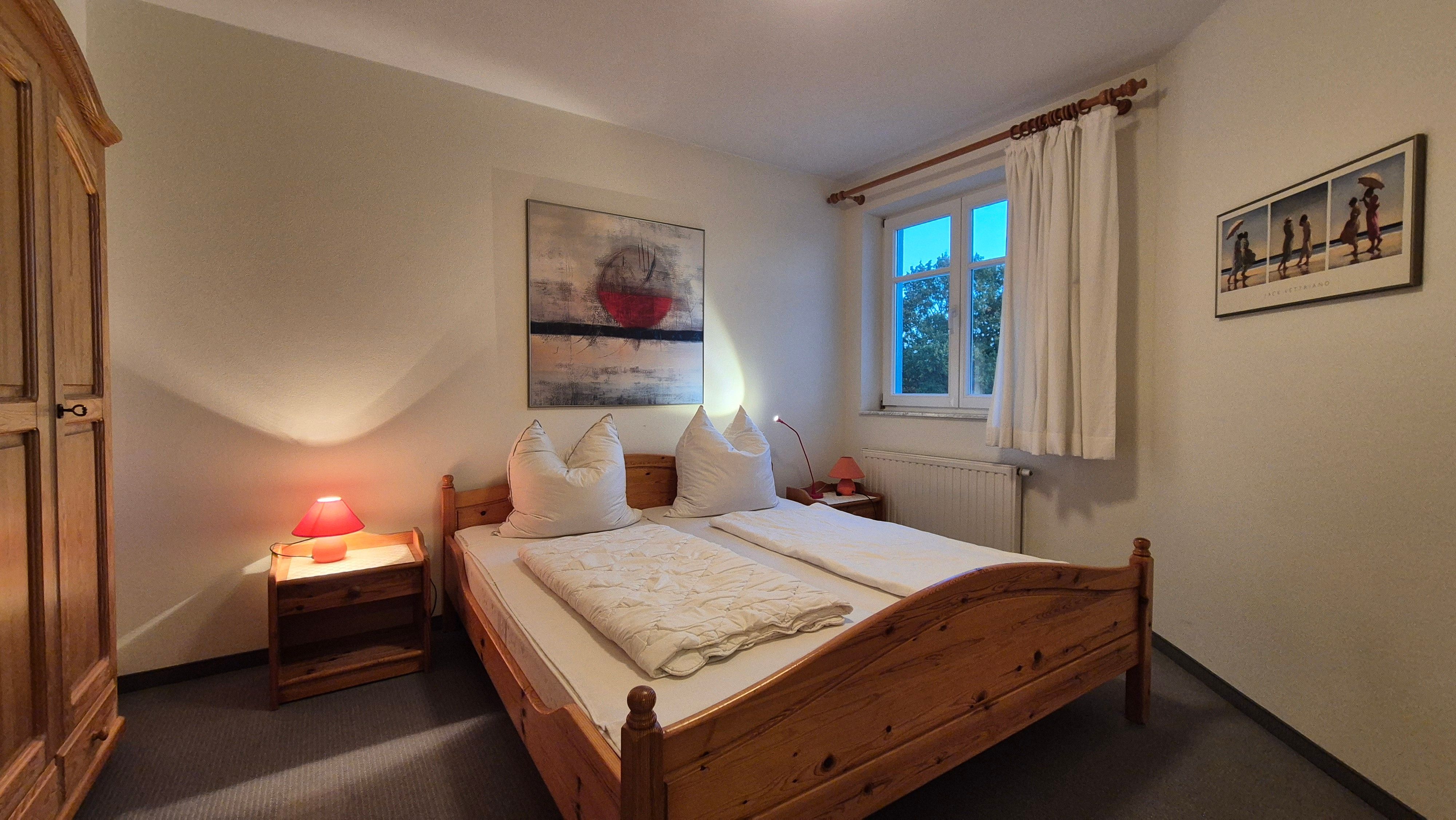 • Das Schlafzimmer verfügt über ein Doppelbett (ca. 180 x 200 cm), 2 Nachttischen, einem Kleiderschrank und einer Garderobe.