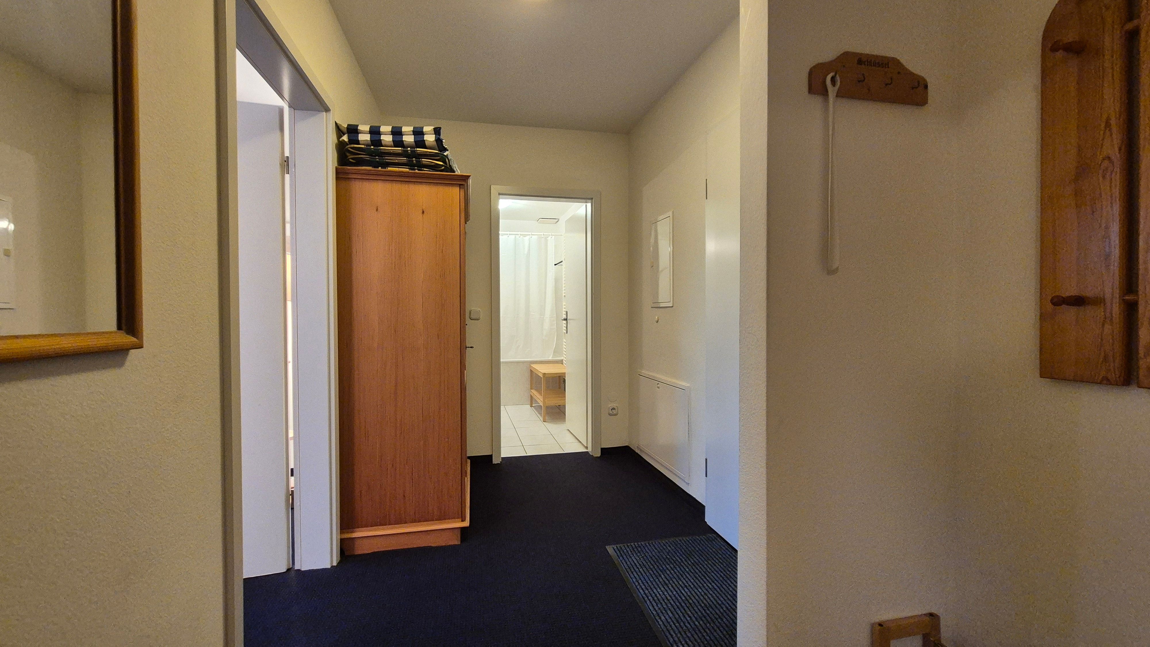 • Die Fußböden im Wohnzimmer, Flur und Schlafzimmer haben einen Teppich, Bad und Küchenbereich haben einen Fliesenfußboden.