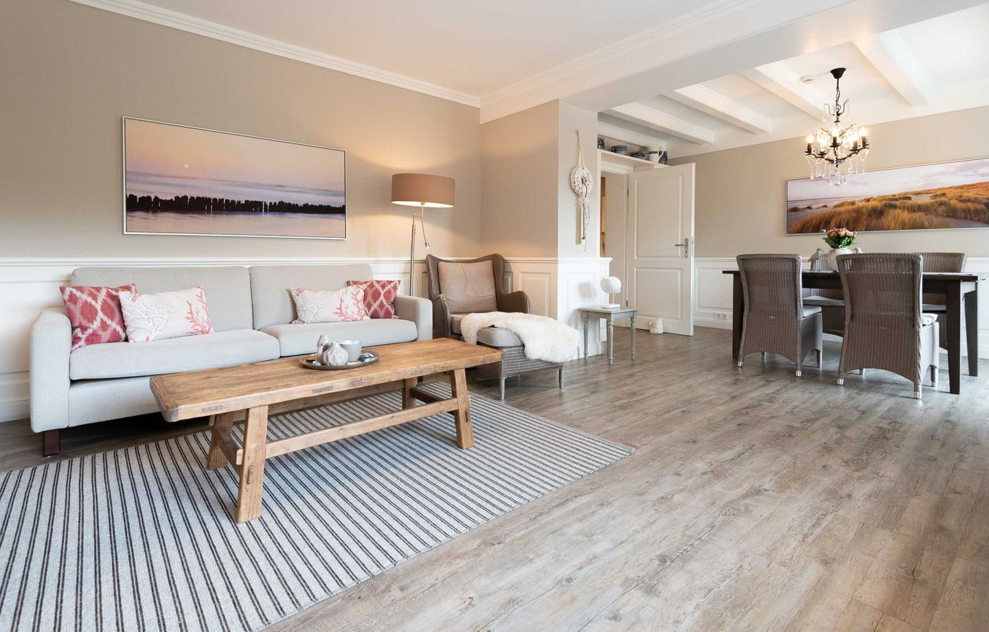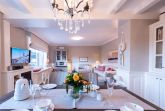 Wohn-/Essbereich: Der helle Wohnbereich lädt mit gemütlichen Polstermöbeln, TV, elektrischem Kamin sowie einem kleinen Sekretär, der auch mobiles Arbeiten im Urlaub ermöglicht, zum Verweilen ein. Der großzügige Essbereich für bis zu 4 Personen findet ebenfalls Platz im Wohnbereich, wo von aus Sie Zugang auf die schöne West-Terrasse mit Gartenmöbeln, Strandkorb und Elektrogrill haben. Ein kleiner und gemütlicher Wintergarten mit separatem Eingang grenzt direkt an die Terrasse und bietet sich für gemütliche Lesestunden mit Blick in den grünen Garten an.