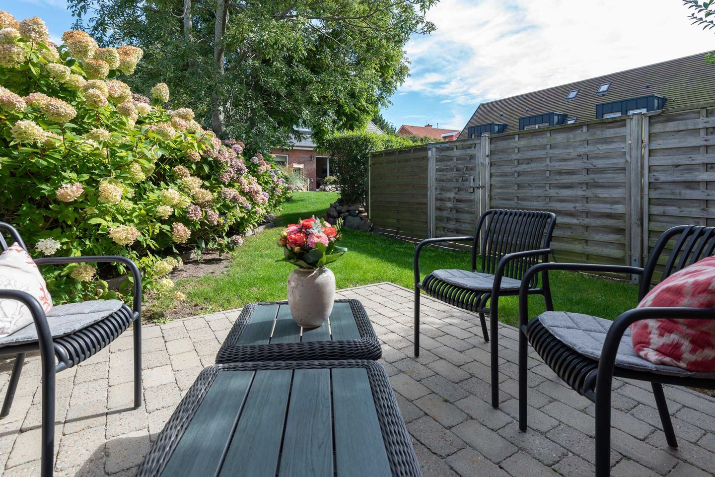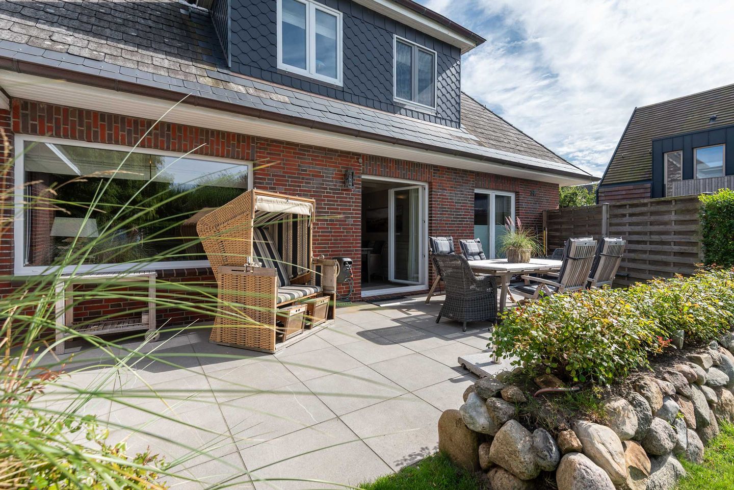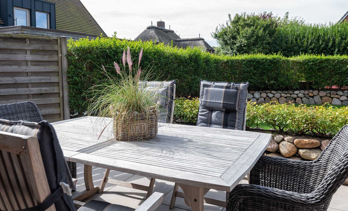 Die Ferienwohnung befindet sich im Erdgeschoss vom Sönhüs auf einem ca. 860 m² großen und eingewachsenen Grundstück.