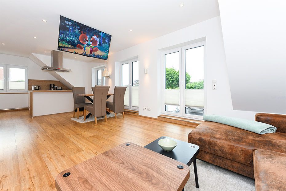 Die Ferienwohnung ist ungefähr 70 Quadratmeter groß und für einen ruhigen und gemütlichen Urlaub für zwei bis vier geeignet.
