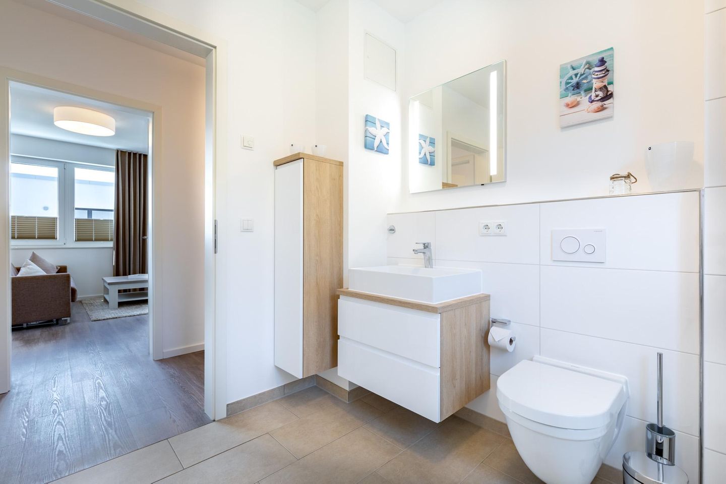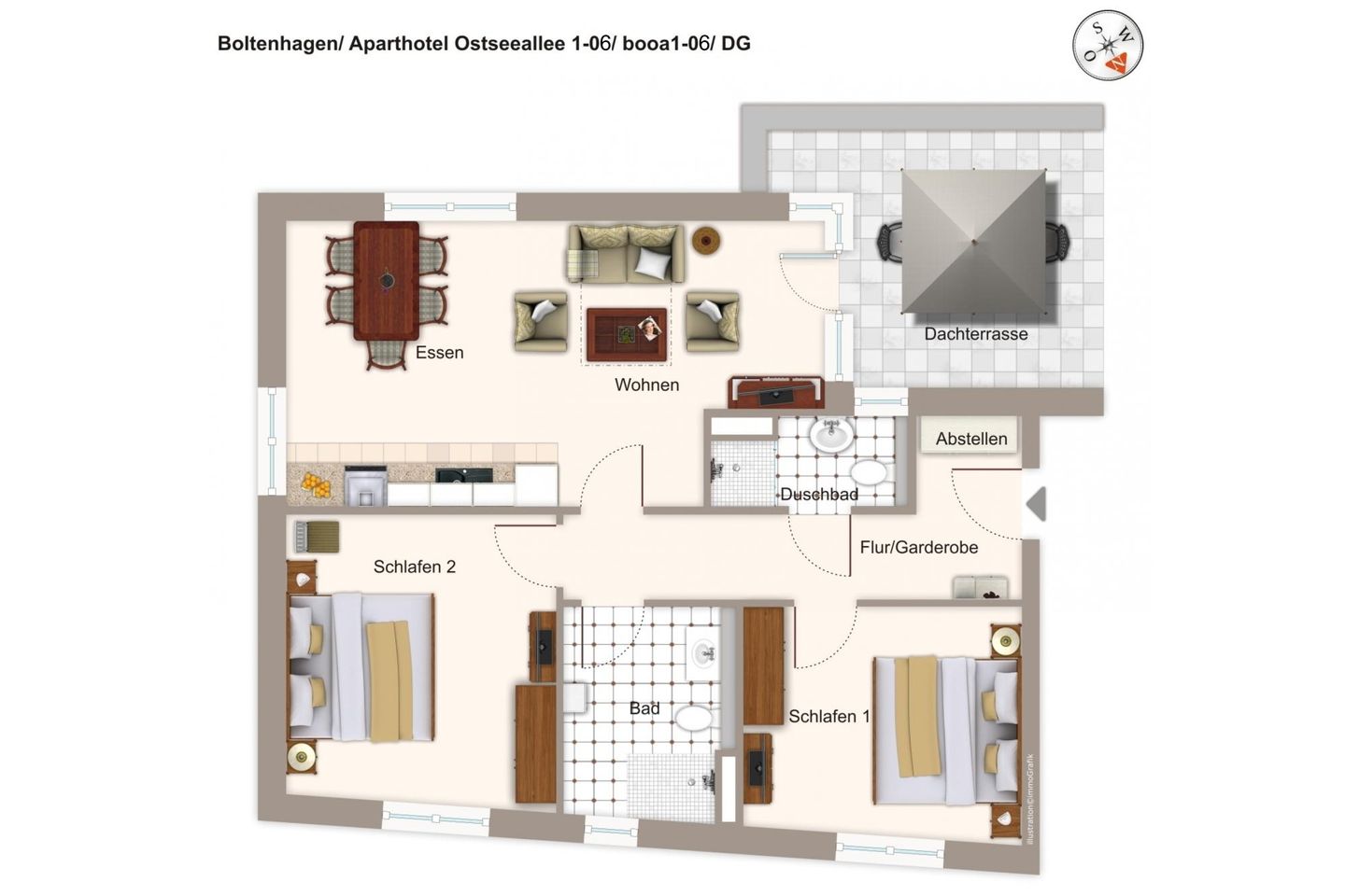 Das helle und moderne Nichtraucher-Apartment verfügt über Fußbodenheizung, bodentiefe Fenster mit 3-fach Isolierung, kostenfreies WLAN und eine voll ausgestattete offene Küche mit Geschirrspüler, Gefrierfach, Kaffeemaschine, Toaster, Wasserkocher, Backofen und Mikrowelle sowie über einen Essbereich. Im Wohnbereich befindet sich eine Doppelschlafcouch (1,60 x 2,00 m) und ein großer Flatscreen-TV mit Blu-ray-Player. Beide separaten Schlafzimmer sind jeweils mit einem modernen Boxspringbett (1,80 x 2,00 m) und Flatscreen-TV ausgestattet. Ein Kinderbett kann gegen Entgelt aufgestellt werden und auf Wunsch könnt ihr einen Kinderhochstuhl hinzubuchen. Die stilvollen Badezimmer verfügen jeweils über eine ebenerdige Dusche, WC, Waschtisch, Föhn, Kosmetikspiegel und Handtuchheizkörper. Das Apartment verfügt über einen großzügigen Flur mit Garderobe. Auf der mit Gartenmöbeln und Sonnenschirm ausgestatteten Dachterrasse, lässt sich herrlich entspannen, sonnenbaden und gesellig beisammen sitzen. Die Dachterrasse ist vom Wohn-Essbereich aus begehbar. Das Apartment ist barrierefrei konzipiert.